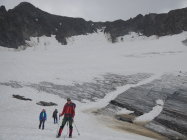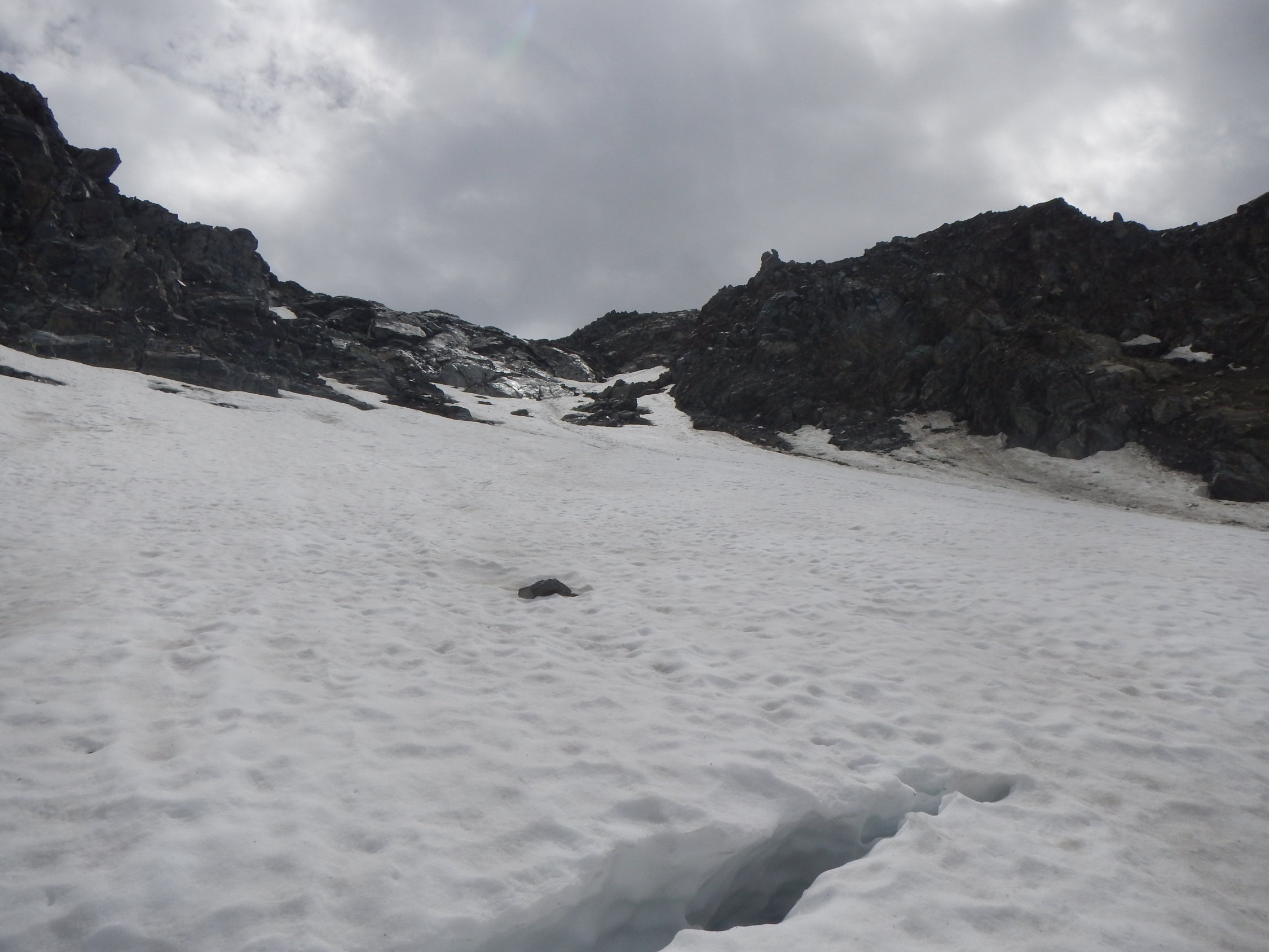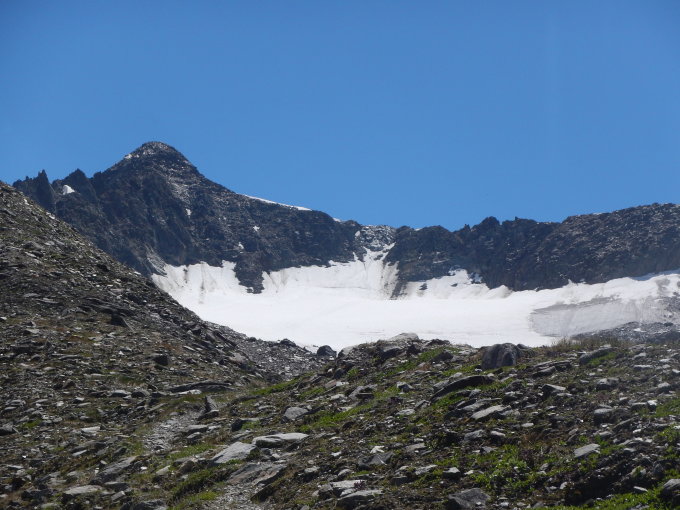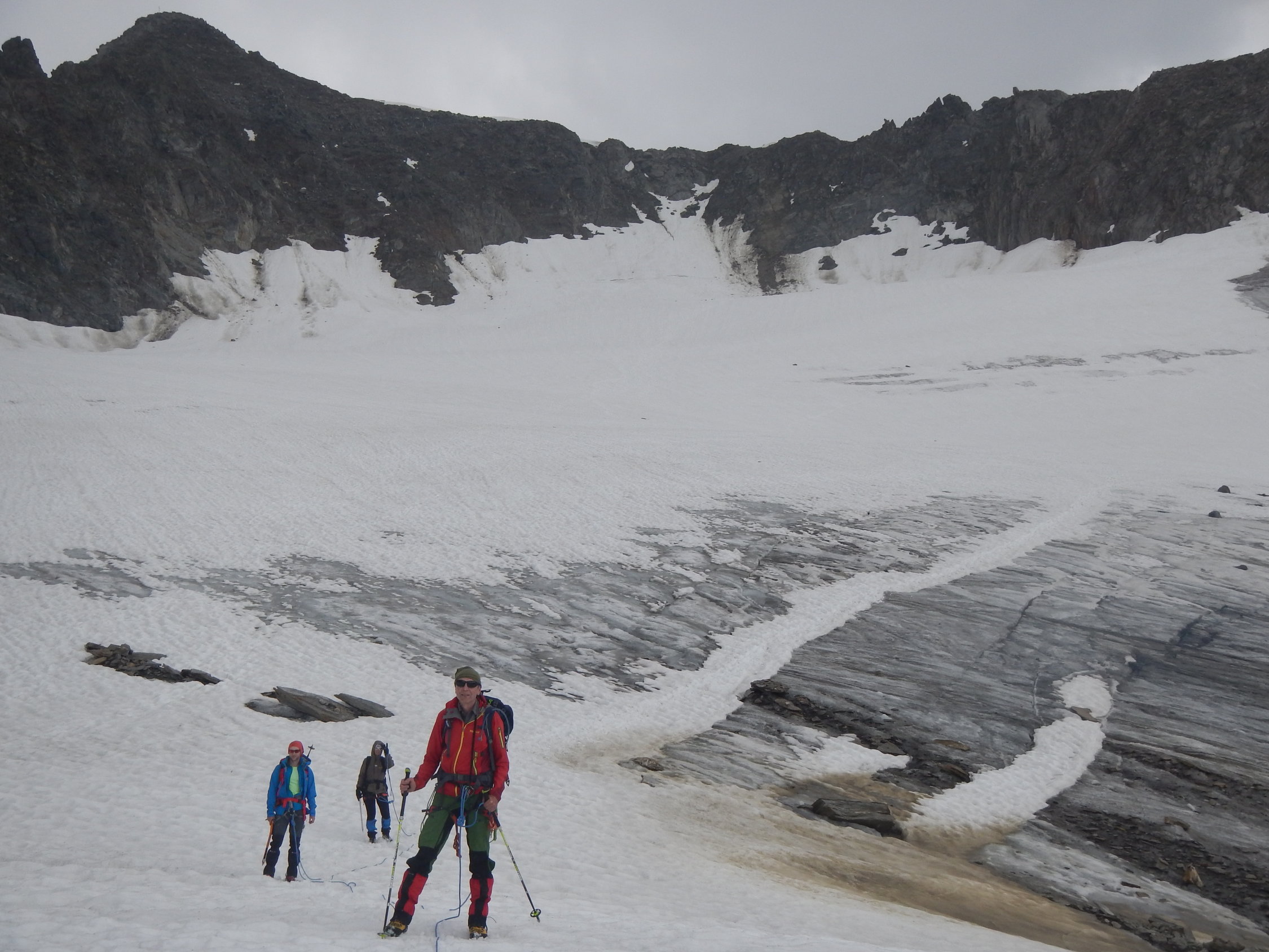 Trotz spätem Start nach Anfahrt um 12.30 Uhr ab Furkapass ohne Probleme machbar. Gletscher hat durchgängig eine gut tragende, aber nicht mehr sehr große Firnauflage im Bereich der Route, auch im Abstieg im aufsulzendem Schnee daher nie tief eingesunken. Bergschrund unter Nordflanke öffnet sich gerade, geht aber sicherlich auch offen gut. Flanke bis fast oben durchgängig mit Firn gefüllt, im obersten Teil der dort zu einer Rinne verschmälerten Flanke problemlos in Schutt schneefrei entlang Fixseil. Weiterer Aufstieg bis Gipfel schneefrei.