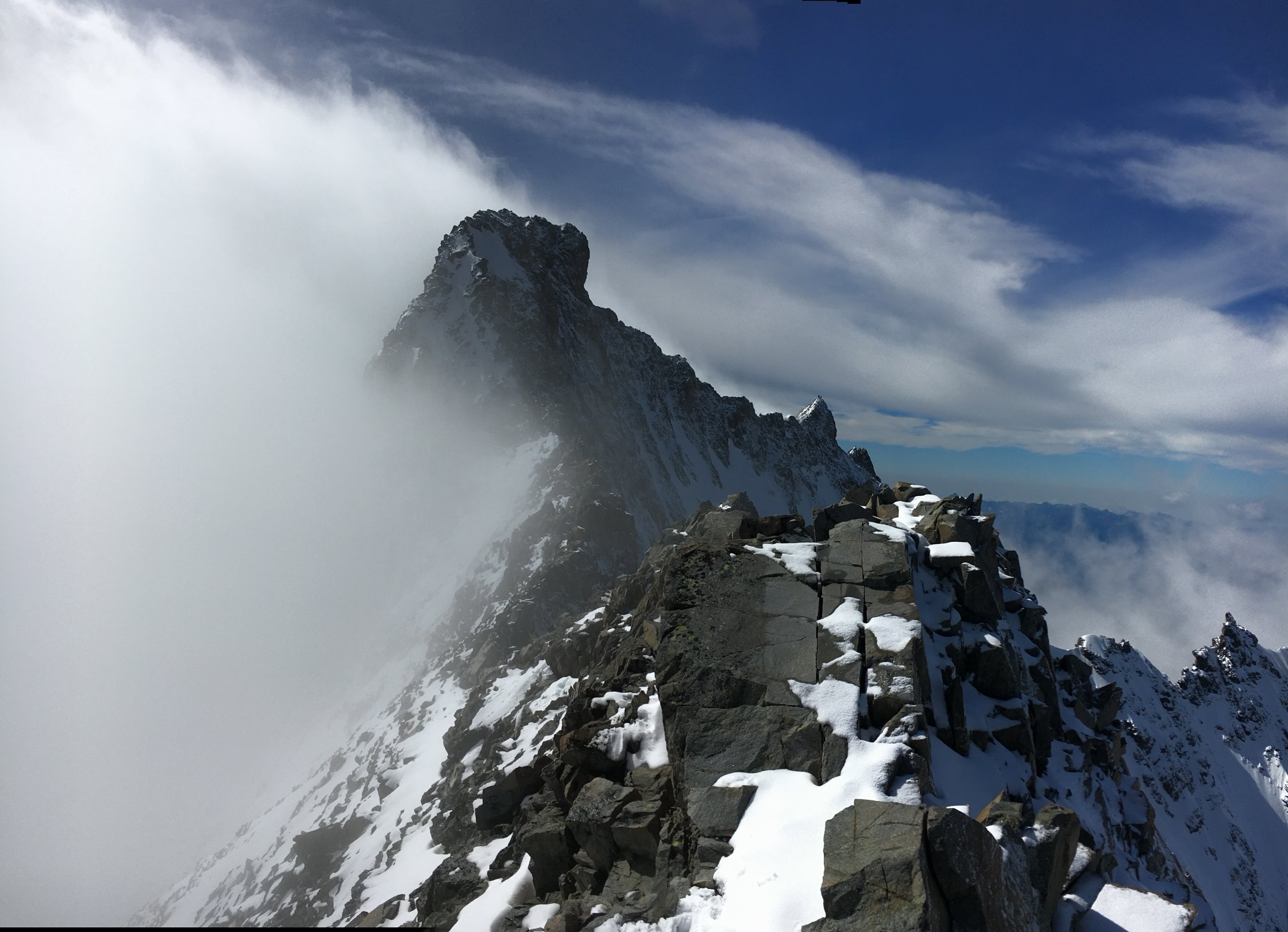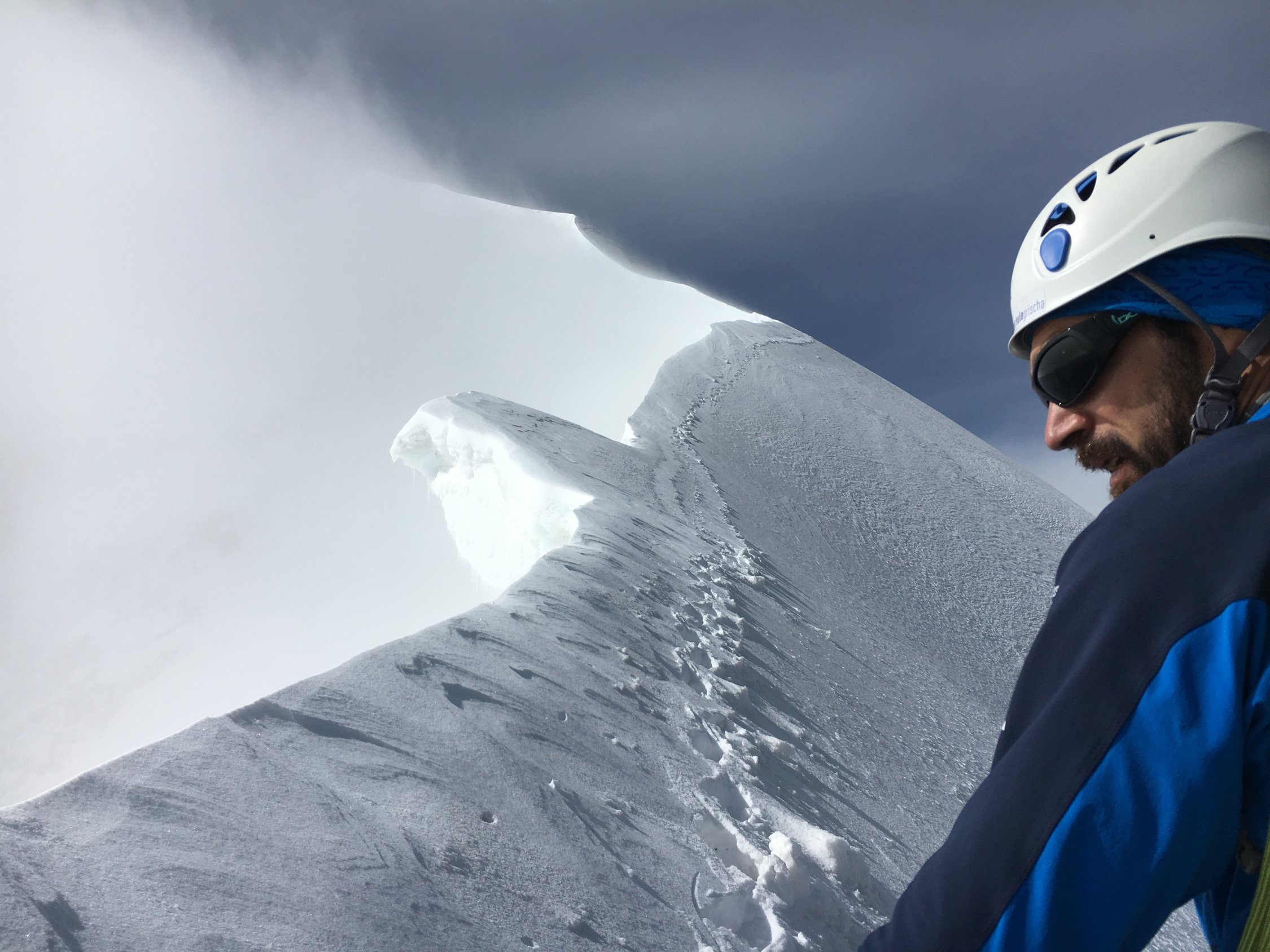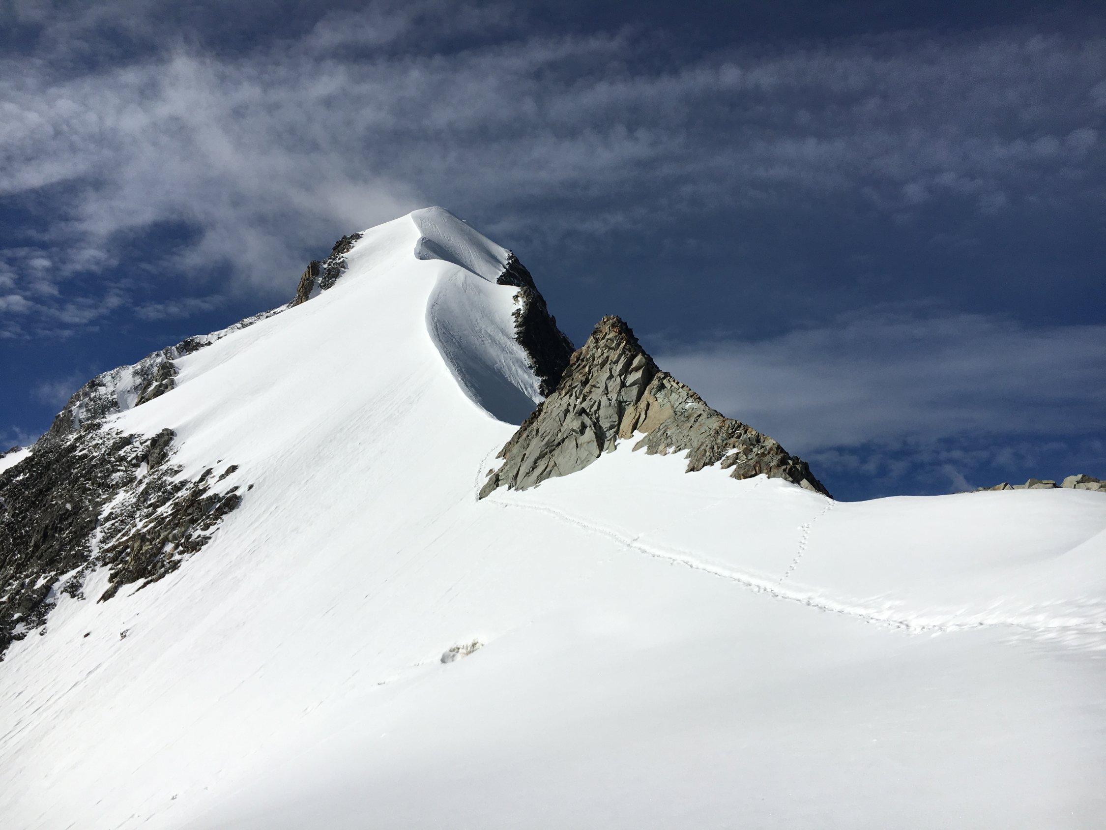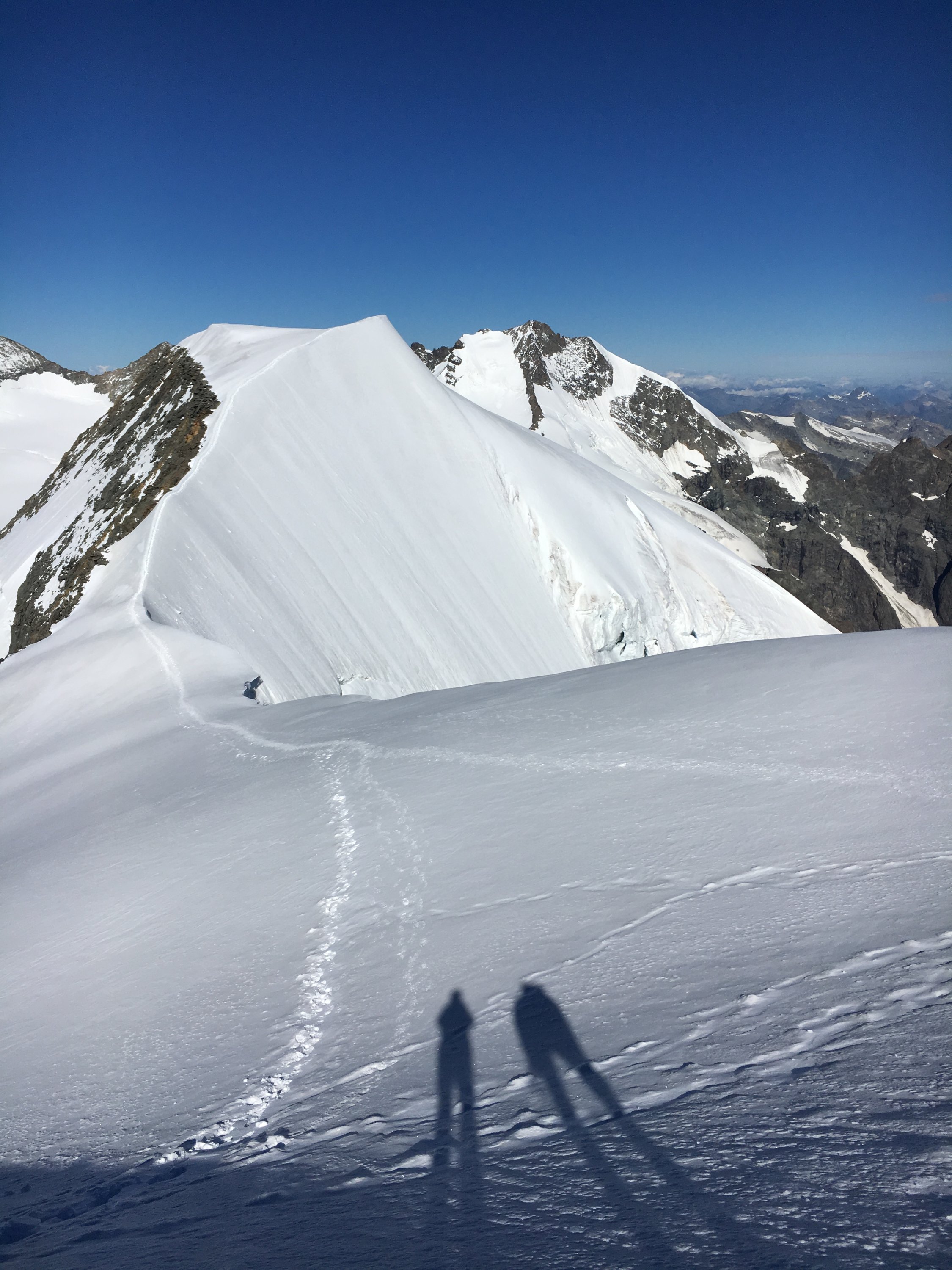 Ankunft am Piz Bianco (oder Piz Alv) auf 3'995 m. Schwierige Gratkletterei bis zum Piz Bernina, auf und ab über Felsen. Gute Tritte und Griffe, aber ziemlich viel Neuschnee.