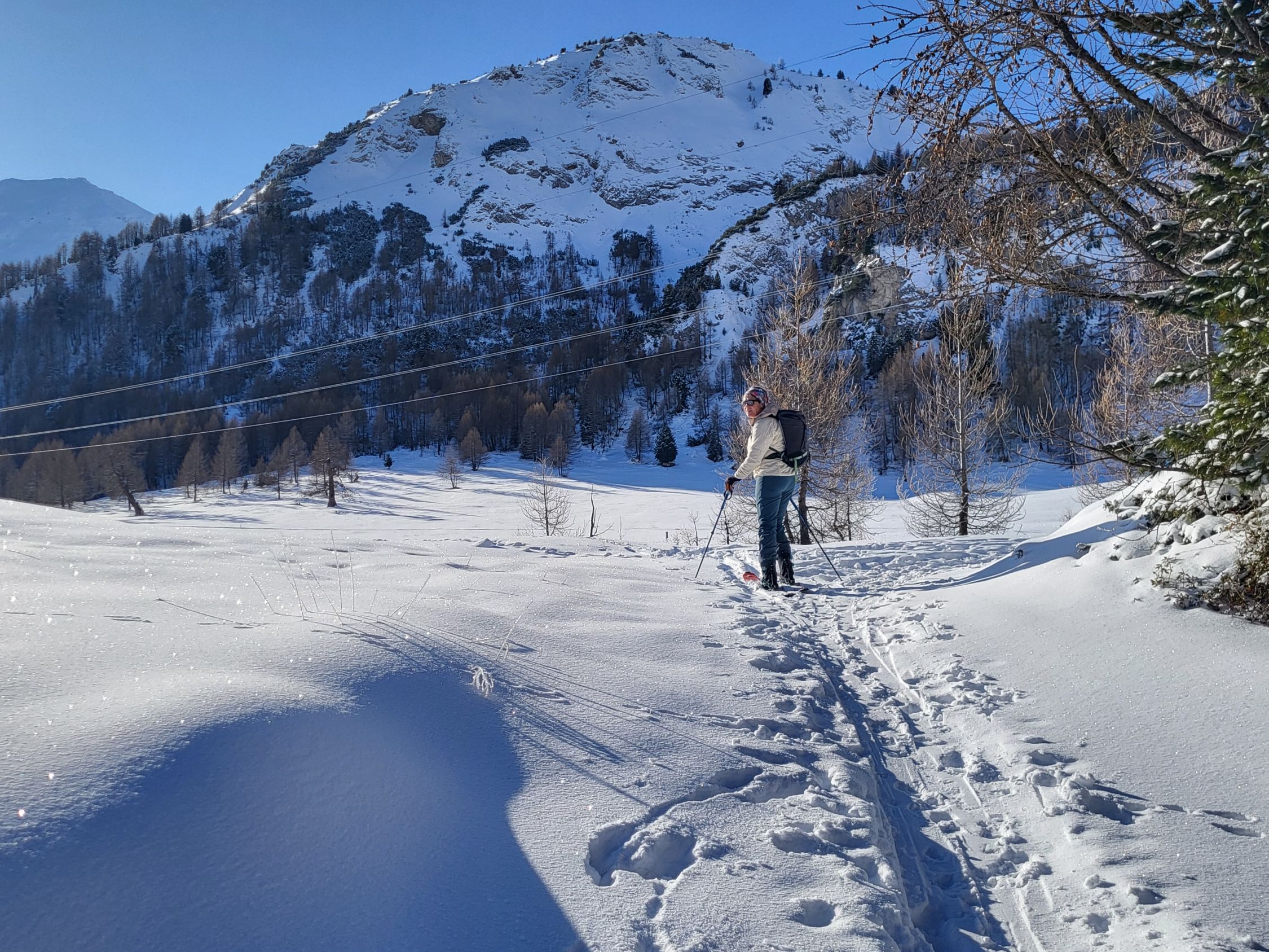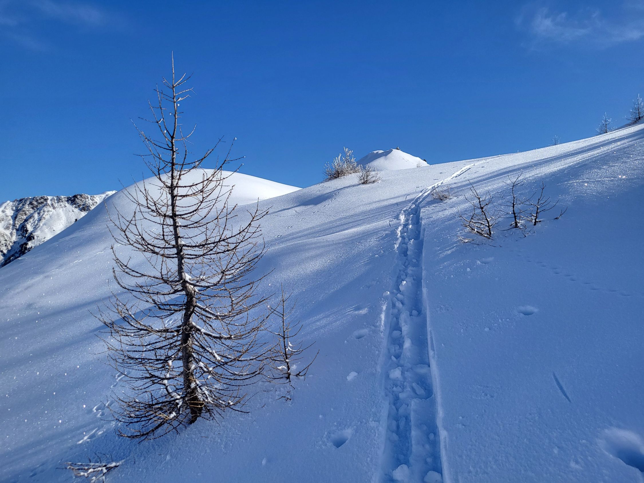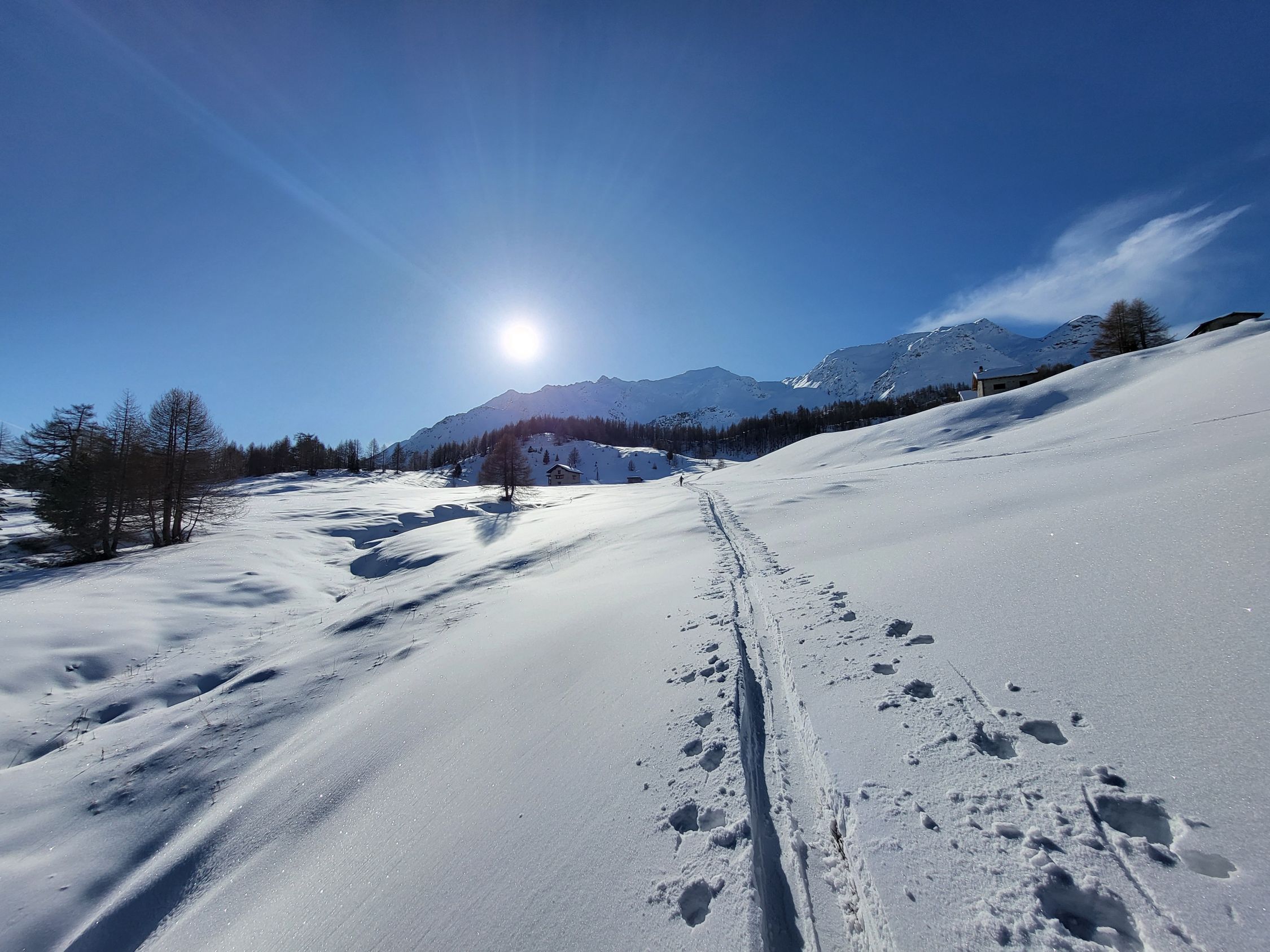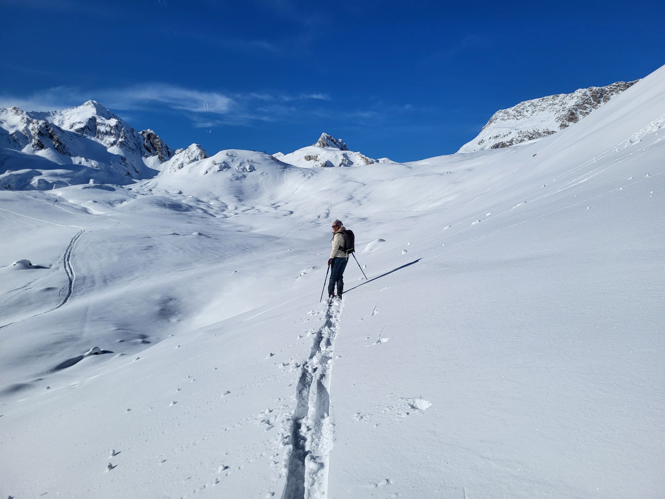 Und es gibt ihn doch - den Pulverschnee! Einfache Skitour auf der Südseite des Lukmanierpasses. Hier hat es in den letzten Tagen immer wieder etwas geschneit, so dass jetzt eine Pulverschneedecke auf einer halbwegs guten Unterlagen die Landschaft verziert. Allerdings ist sie nicht sonderlich dick, so dass auch wir an einige Stellen Steinkontakt hatten. Die Route befindet sich genau an der Grenze zwischen Lawinenstufe 2 und 3. Wir hatten immer wieder Setzungsgeräusche, Deshalb sind wir wieder die Aufstiegsroute abgefahren, während wir normalerweise die steilere Variante über den Piano dei Canali wählen.