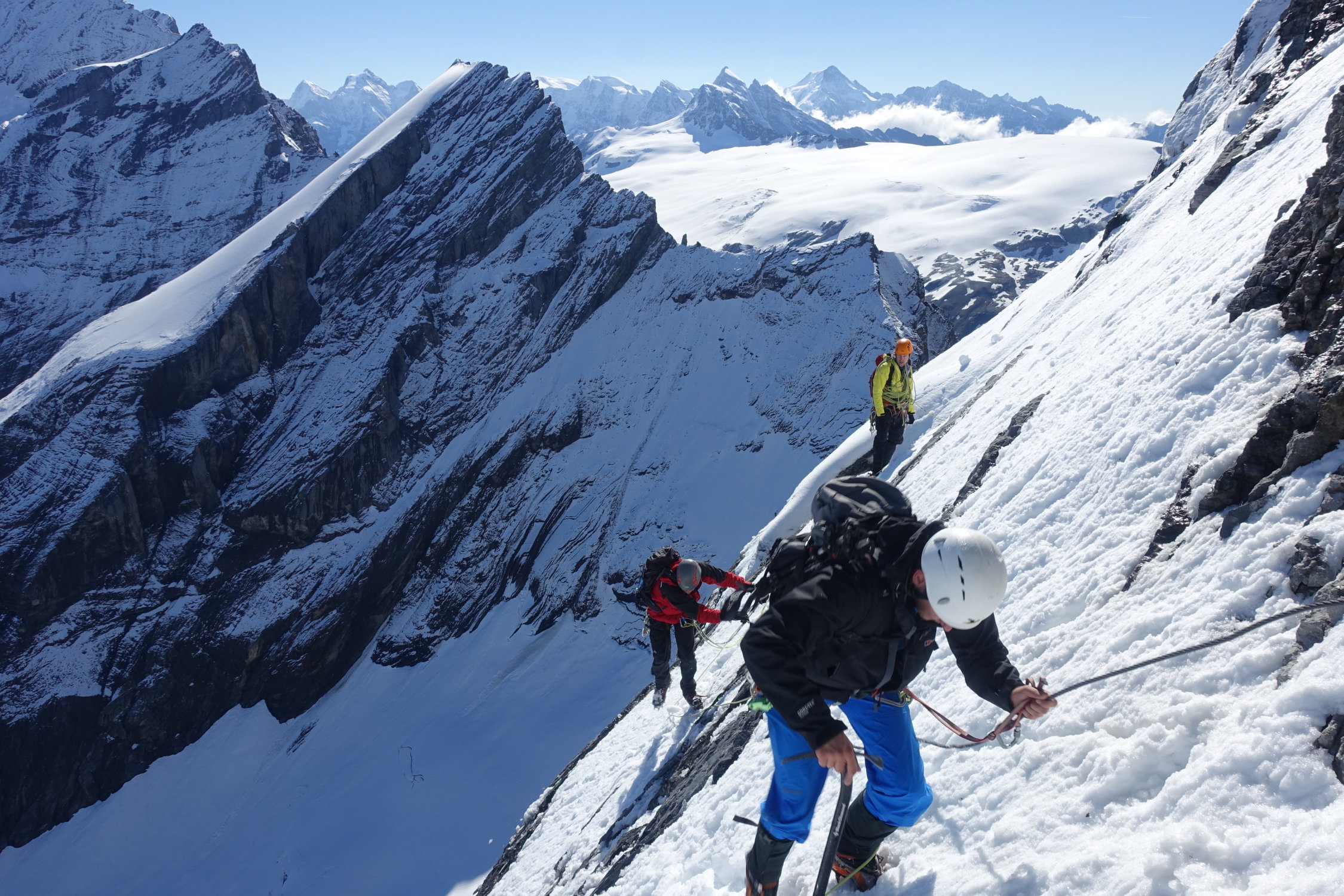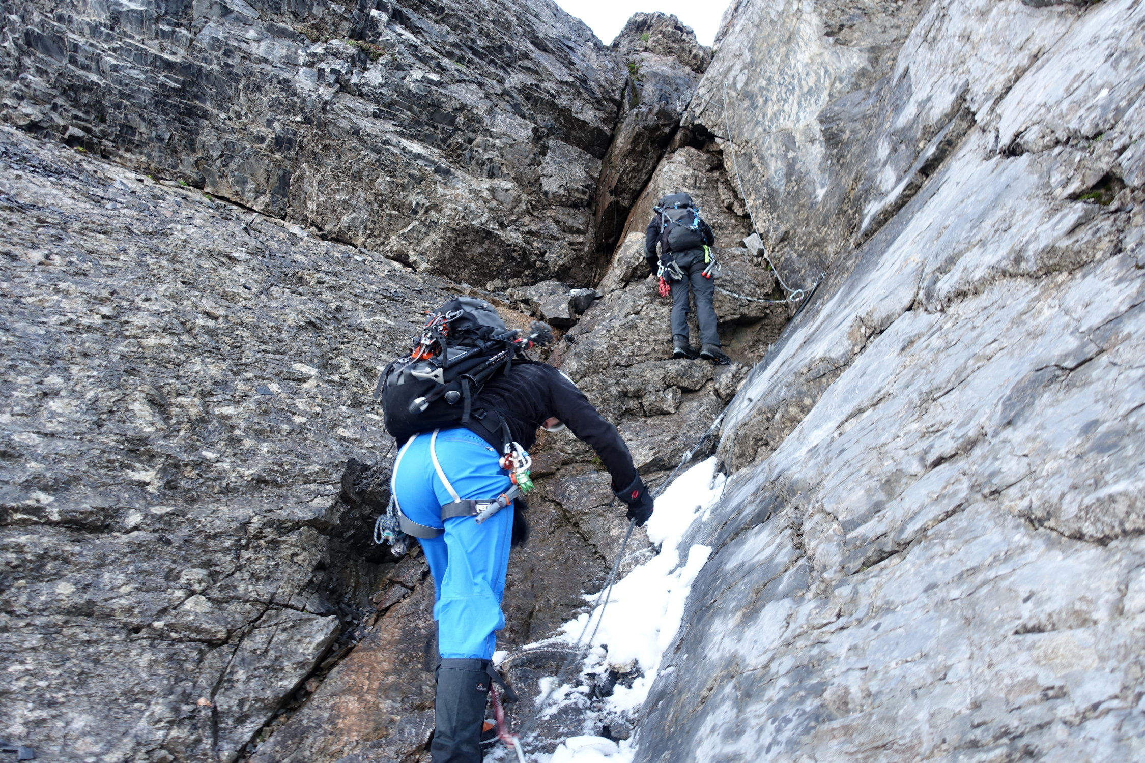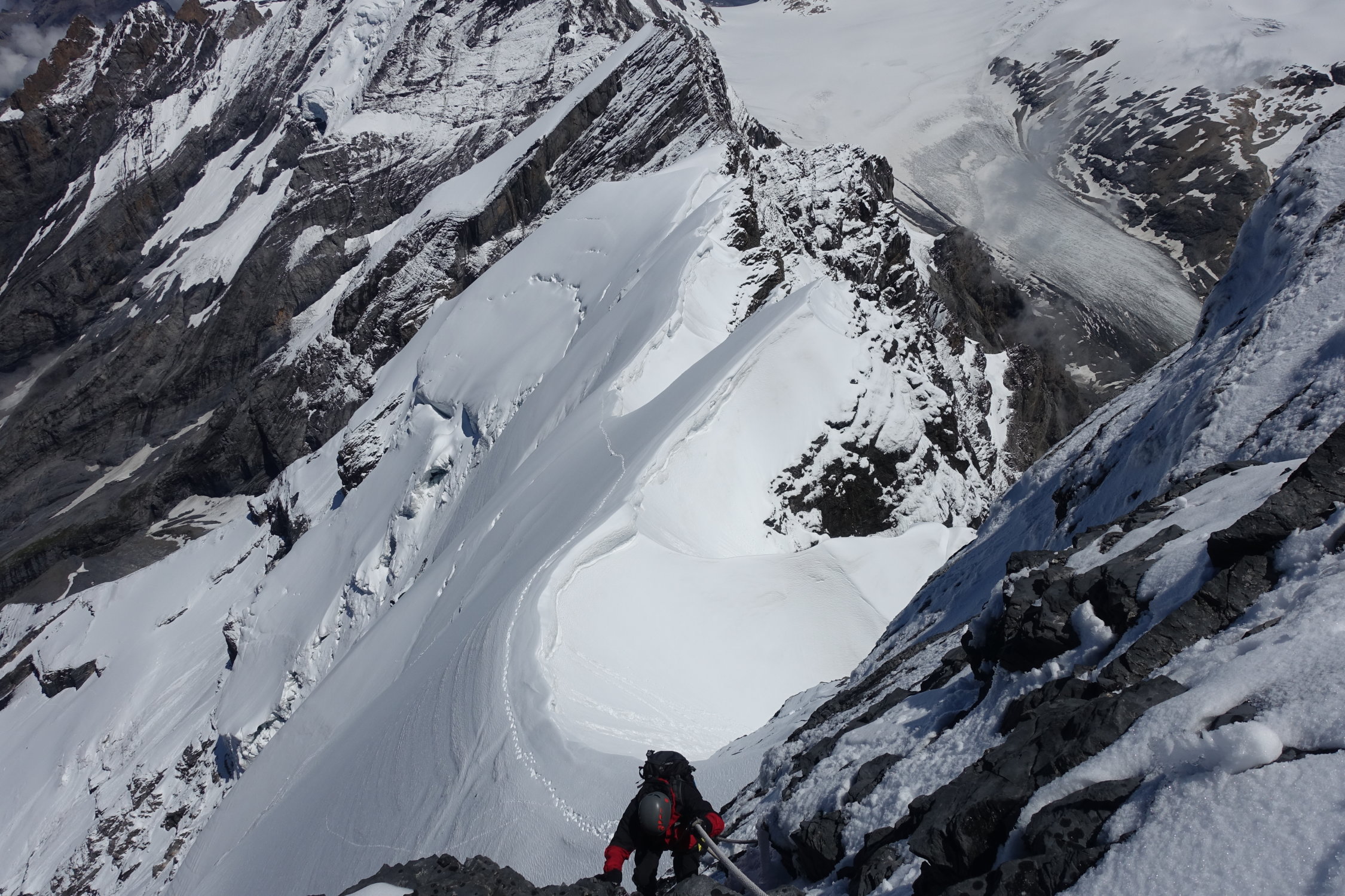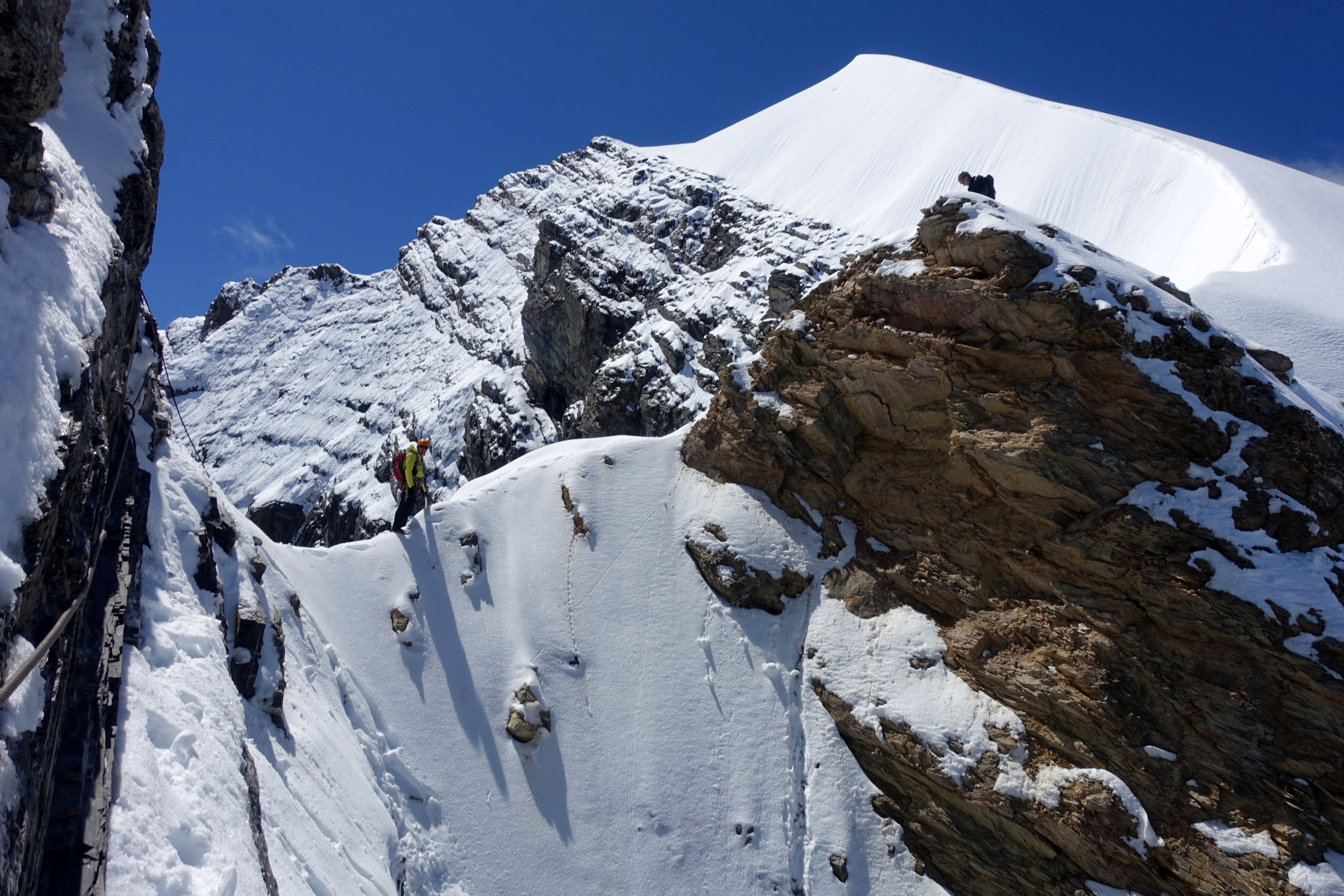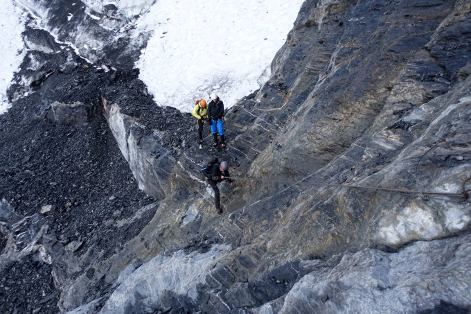 Ohne Schnee sind die Felsteile/Fixseile eher unproblematisch. Der Firnteil wird nicht besser.