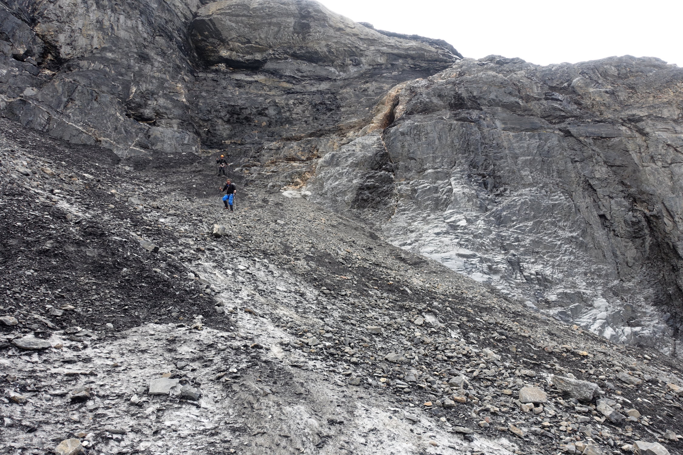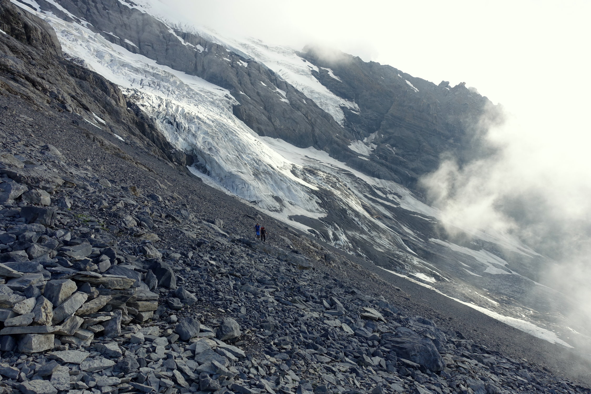 Nach Schneefällen am 1. und 2.7. waren die Felsen verschneit und die Schneeteile nicht komplett durchgefroren (Bruchharsch ca. 10-15cm.