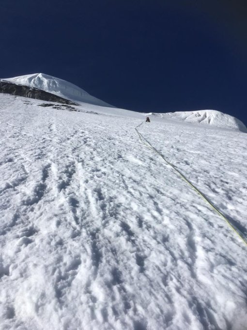 Wir haben komplett durchgesichert. Zeitaufwand rein für die Wand ab Bergschrund dann ca. 4 Std. Überschreitung Bergschrund bei weichem Schnee mühsam, sonst gut.