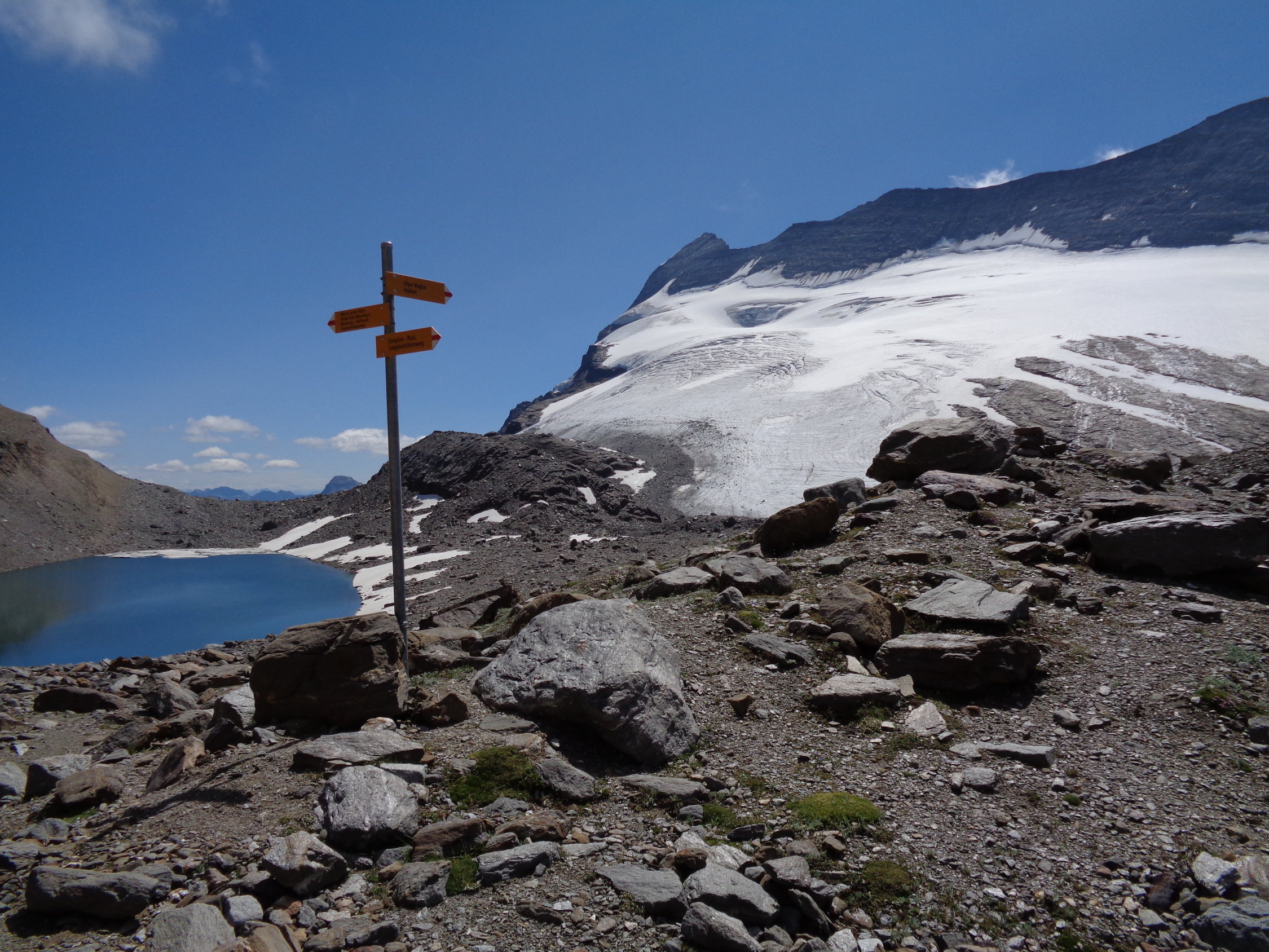 Alles trocken, kein Schnee oder Eis. Das steile Schneefeld im Abstieg am Südgrat reicht nicht mehr bis zum Grat und kann problemlos entlang dem Grat umgangen werden (siehe Bild). Keine Steigeisen oder Pickel erforderlich. Helm empfehlenswert, wenn man nicht alleine am Berg ist.