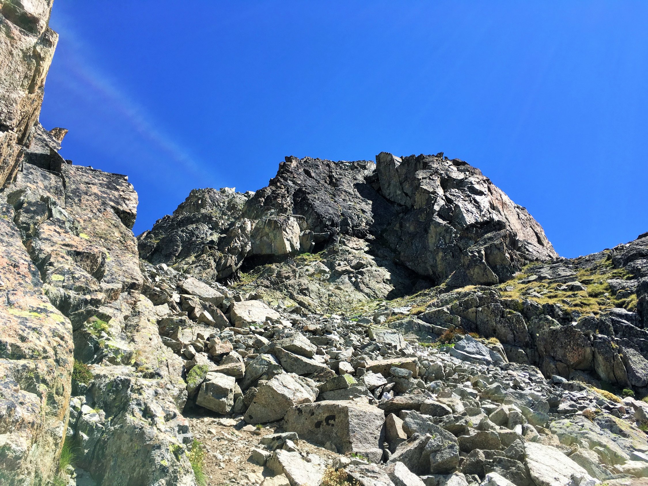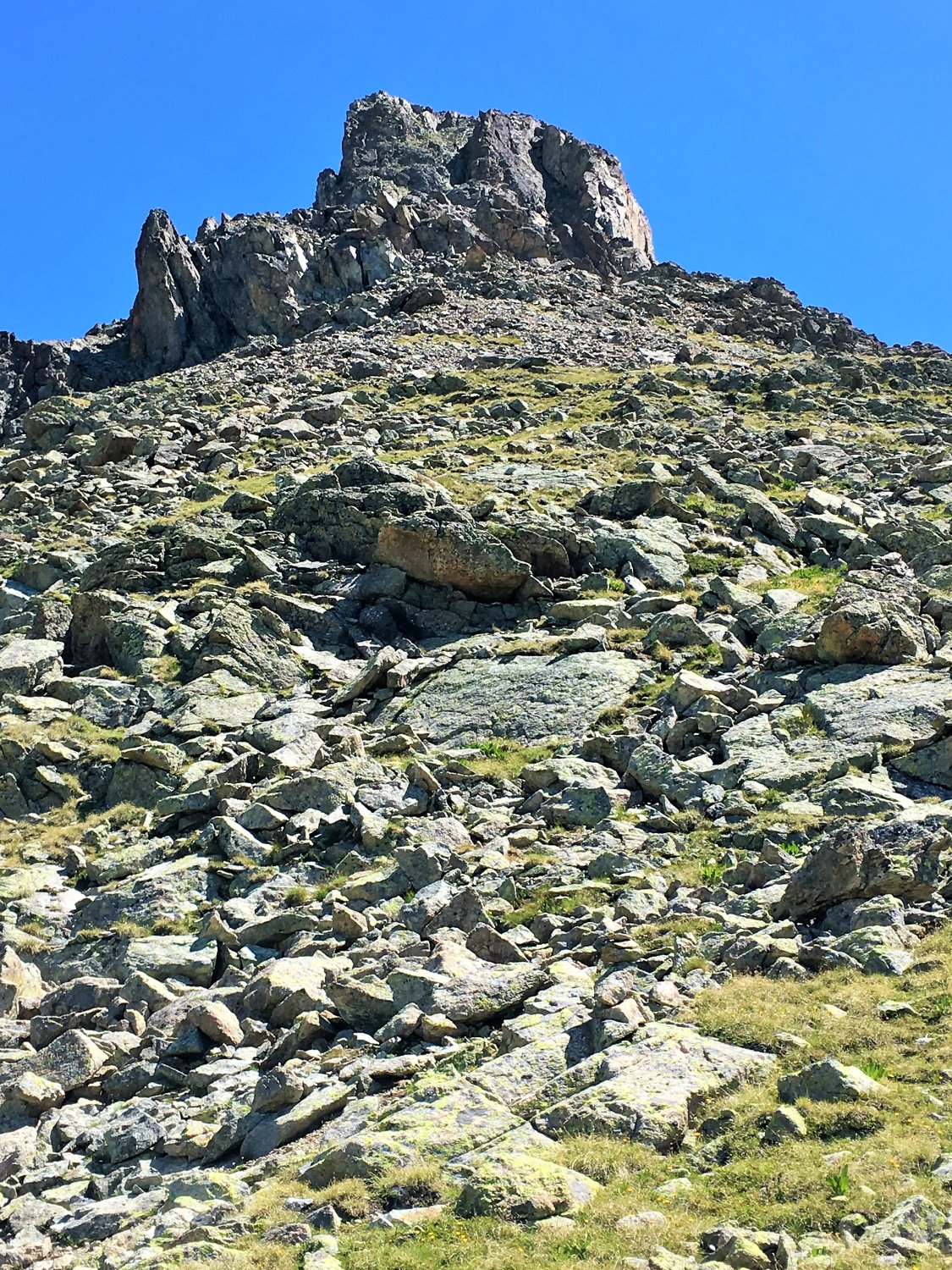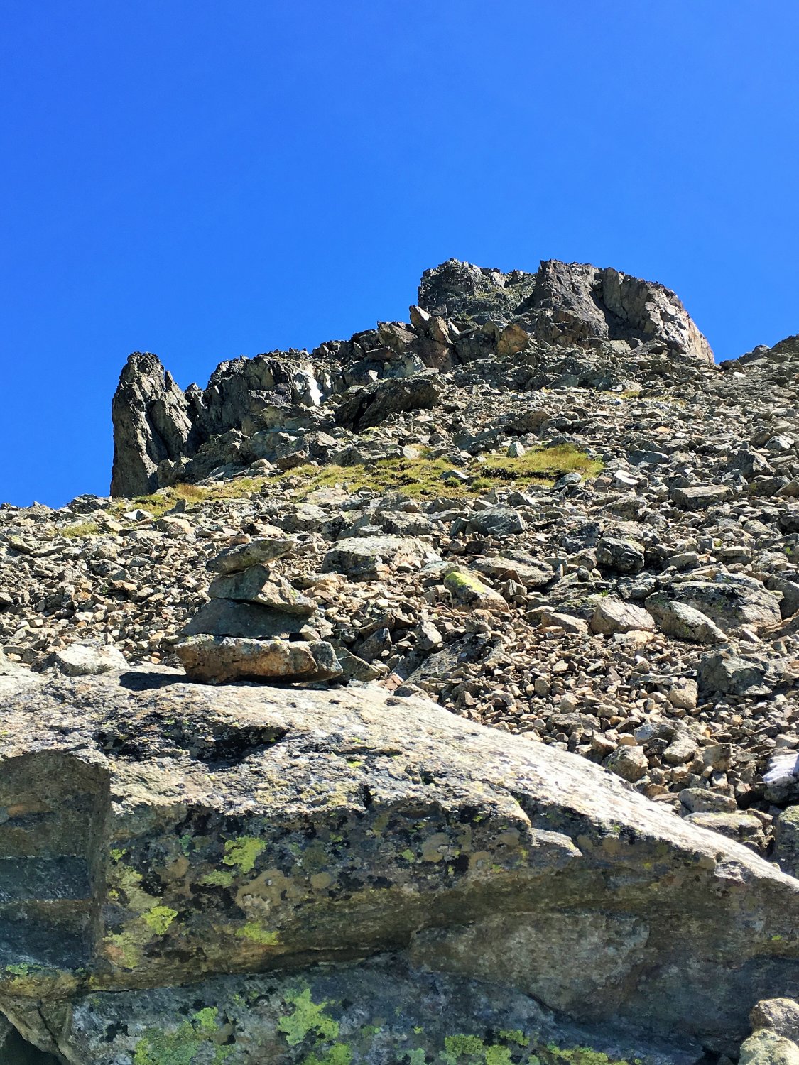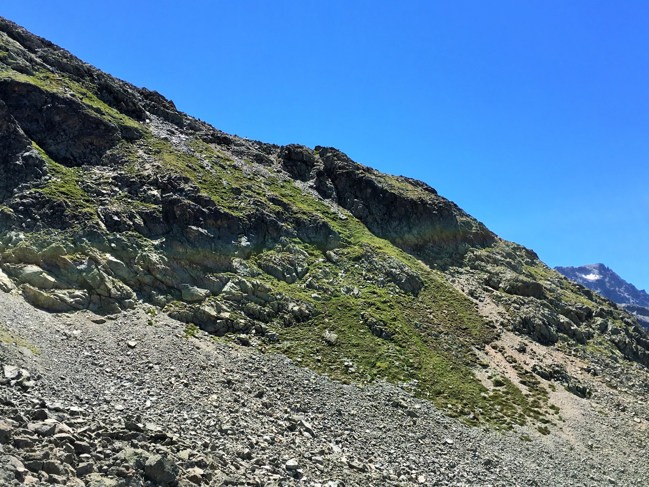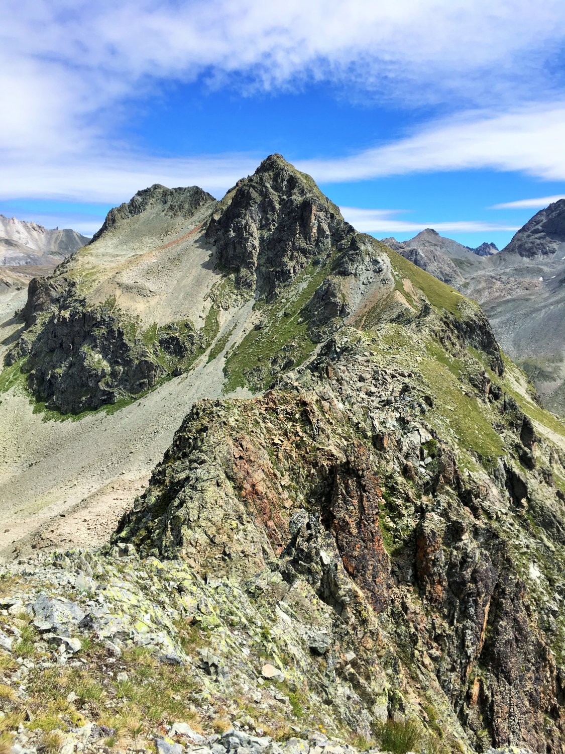 Der Chüern Nair ist im Engadiner Romanisch das "schwarze Horn". Attraktive Bergtour mit schönem Ausblick in alle Richtungen. Ich bin auf der gleichen Route abgestiegen. Vom Gipfel kann man auch dem Nord- Nordostgrat entlang klettern (T5, etwas ausgesetzt, zum Teil brüchiger Fels) zum Piz Valletta 2917 m und 2932 m.