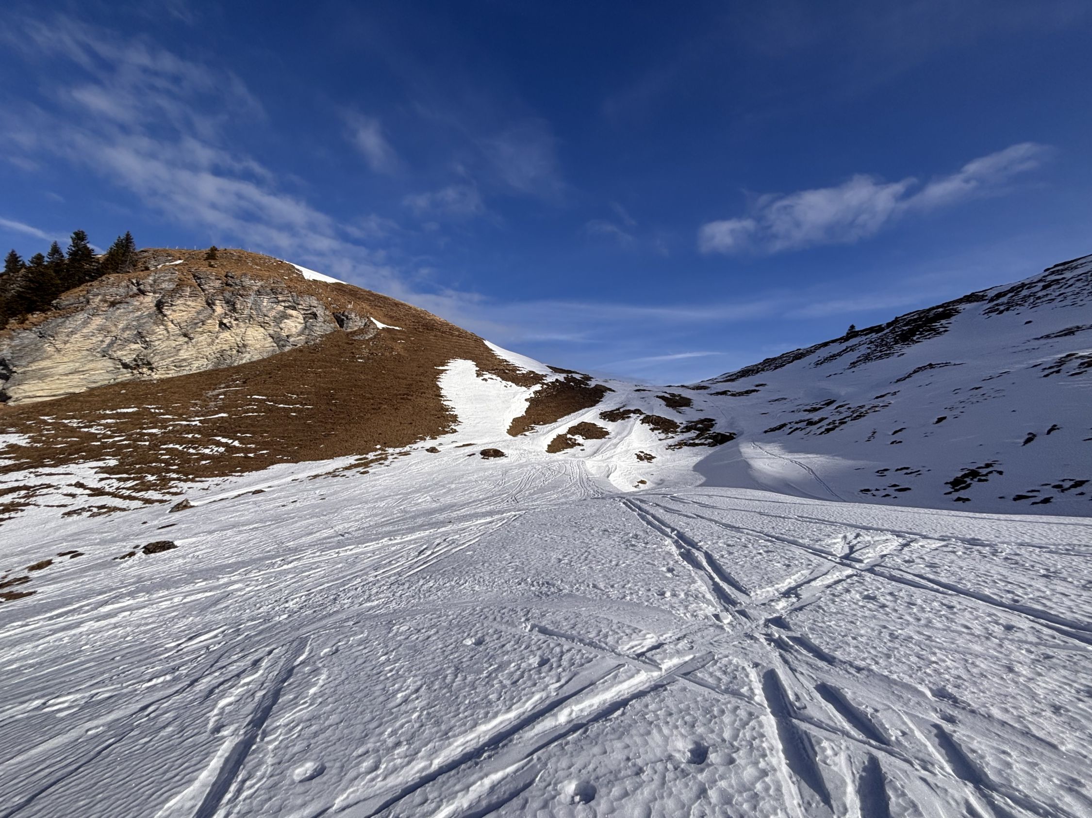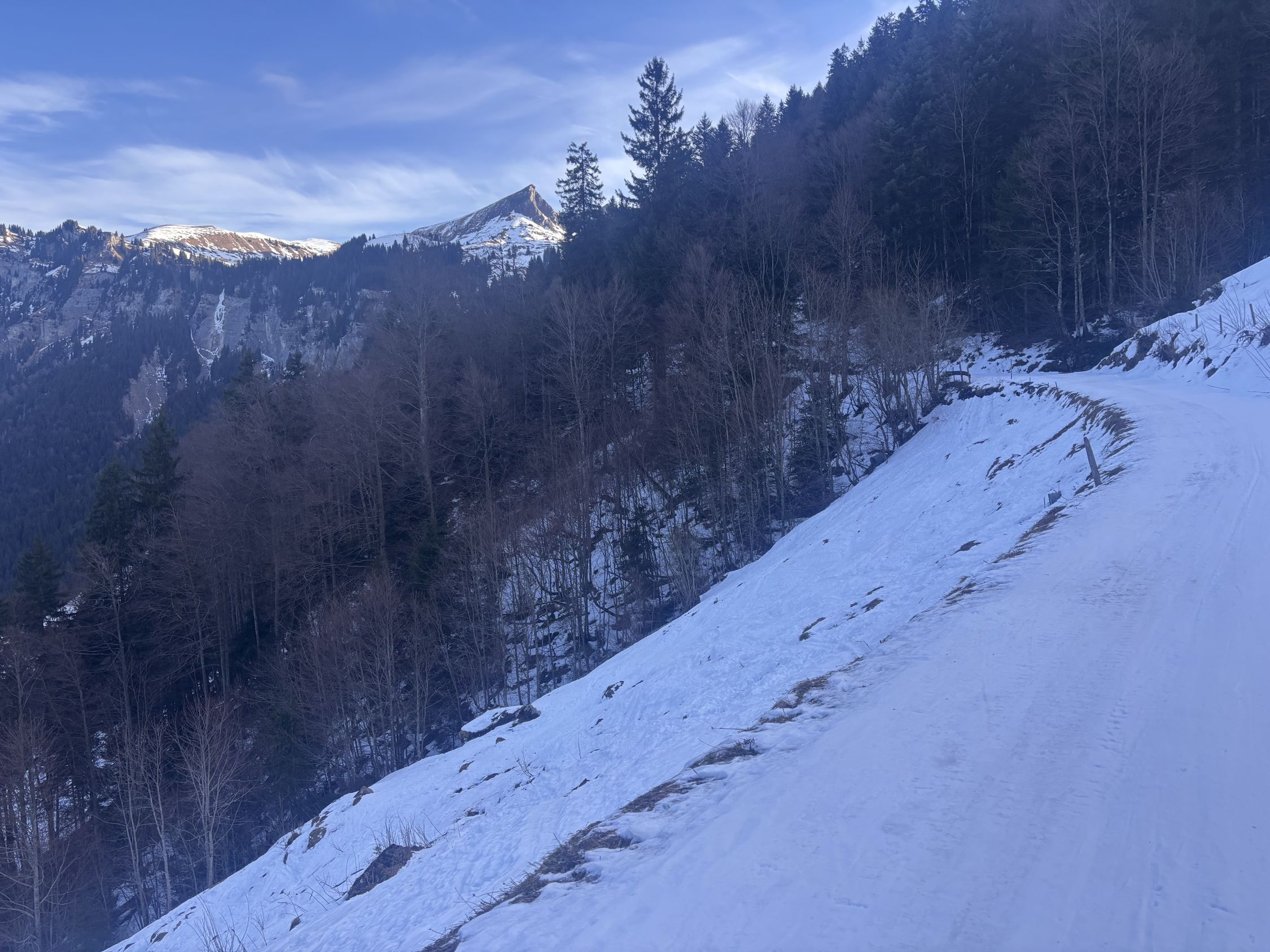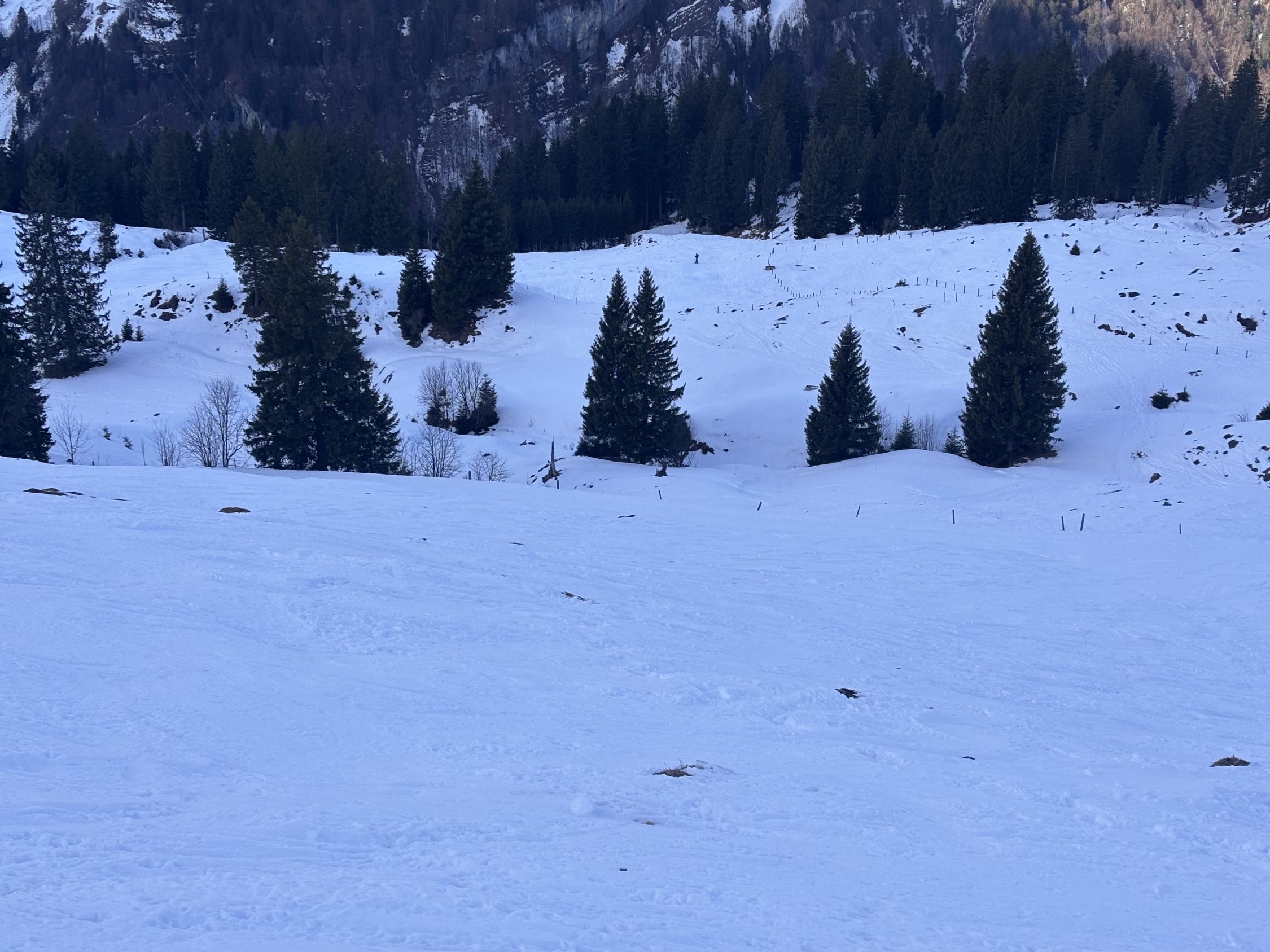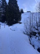 "fast gut" wäre als Verhältnisbeschreibung wohl treffender. Immerhin liegt eine durchgehende Schneedecke ab Weglosen. Allerdings gibt es zur Zeit eine kurze Passage im untersten Teil des Chäserenwalds (auf ca. 1'220m), wo ich NEUE Skis in der Abfahrt wohl ca. 20 Meter weit tragen würde (siehe Foto). Mit Steinski sprühen kurz die Funken unter der Kante... Sonst durchgehend problemloser (selten vereister) Schnee in der Waldabfahrt.