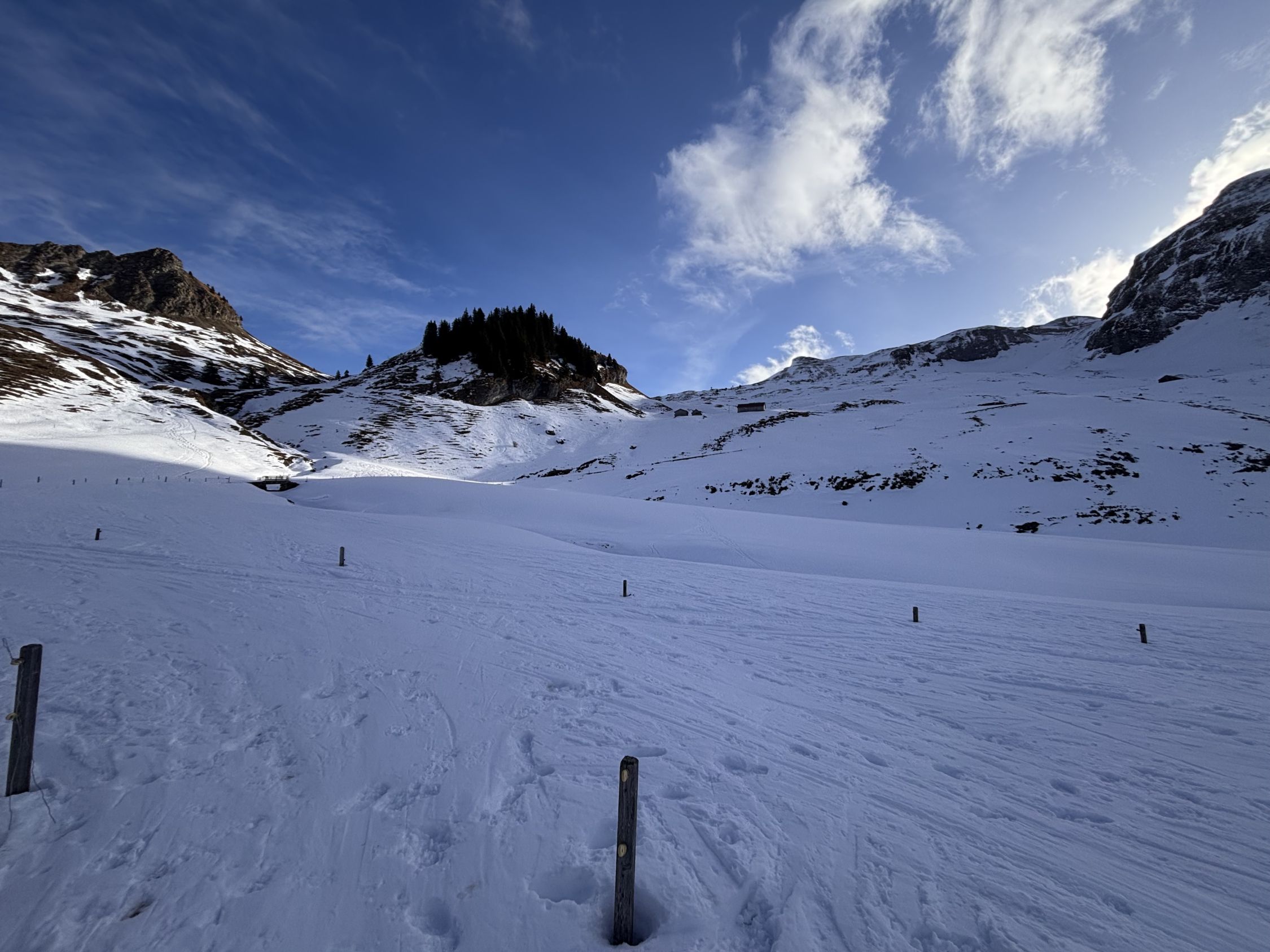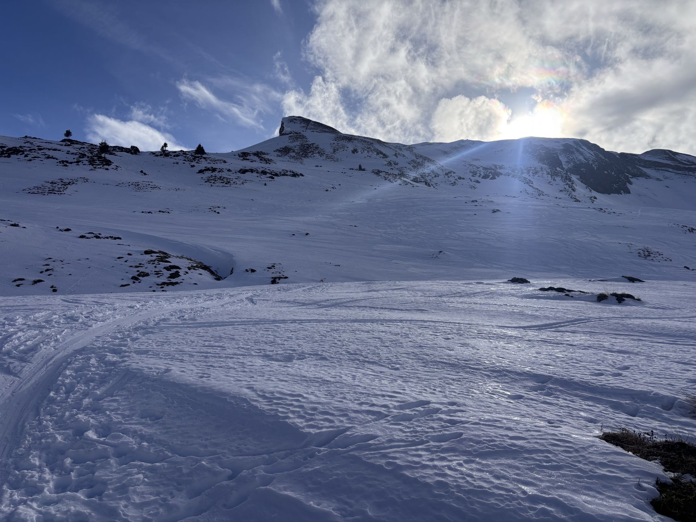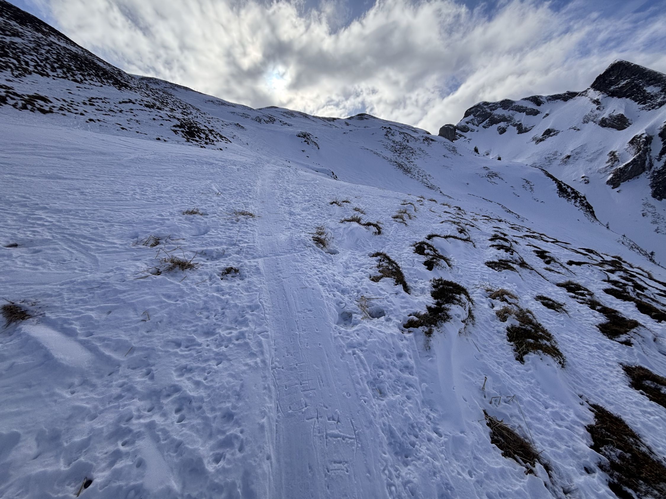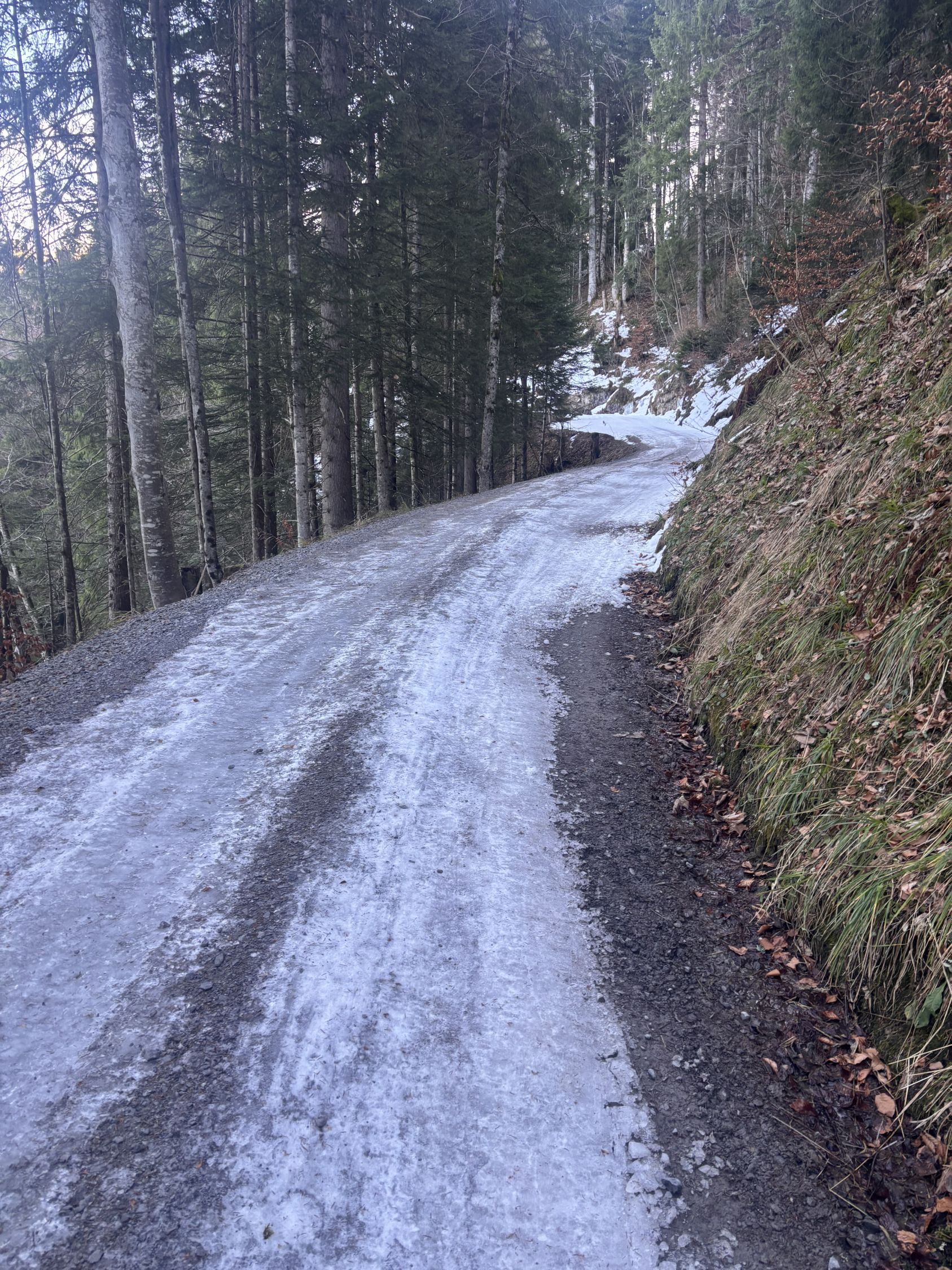 "fast gut" wäre als Verhältnisbeschreibung wohl treffender. Immerhin liegt eine durchgehende Schneedecke ab Weglosen. Allerdings gibt es zur Zeit eine kurze Passage im untersten Teil des Chäserenwalds (auf ca. 1'220m), wo ich NEUE Skis in der Abfahrt wohl ca. 20 Meter weit tragen würde (siehe Foto). Mit Steinski sprühen kurz die Funken unter der Kante... Sonst durchgehend problemloser (selten vereister) Schnee in der Waldabfahrt.