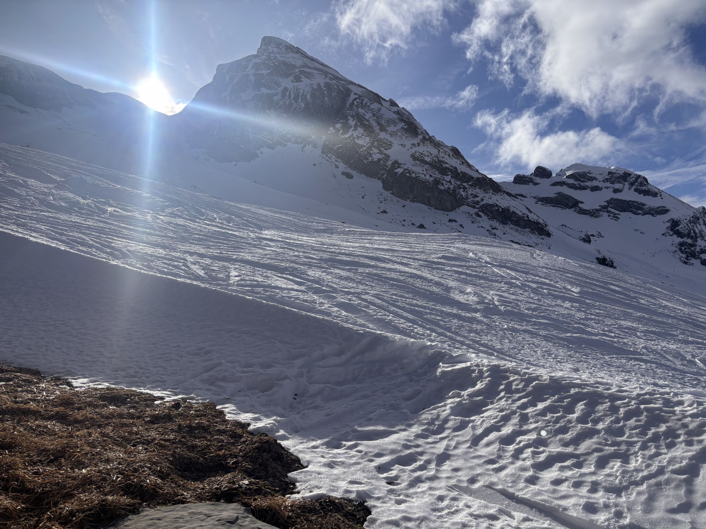 Oberhalb Waldgrenze ist genug Schnee anzutreffen, aber Grasbüschel und Steine sind öfters sichtbar. Die Bachquerung bei ca. 1'510m ist aktuell gefahrlos möglich (siehe Foto), auf den glasigen harten Aufstiegsspuren leisten Harscheisen nützliche Dienste. Weiter oben ist der Schnee entweder verblasen (besonders in Gipfelnähe) oder dann hartgepresst. In der Abfahrt habe ich zwischen 1'800m bis zur Twäriberghütte noch pulvrige Stellen gefunden, sonst pistenähnlich. Steinkontakt lässt sich trotz vorausschauender vorsichtiger Fahrweise nur knapp vermeiden.
