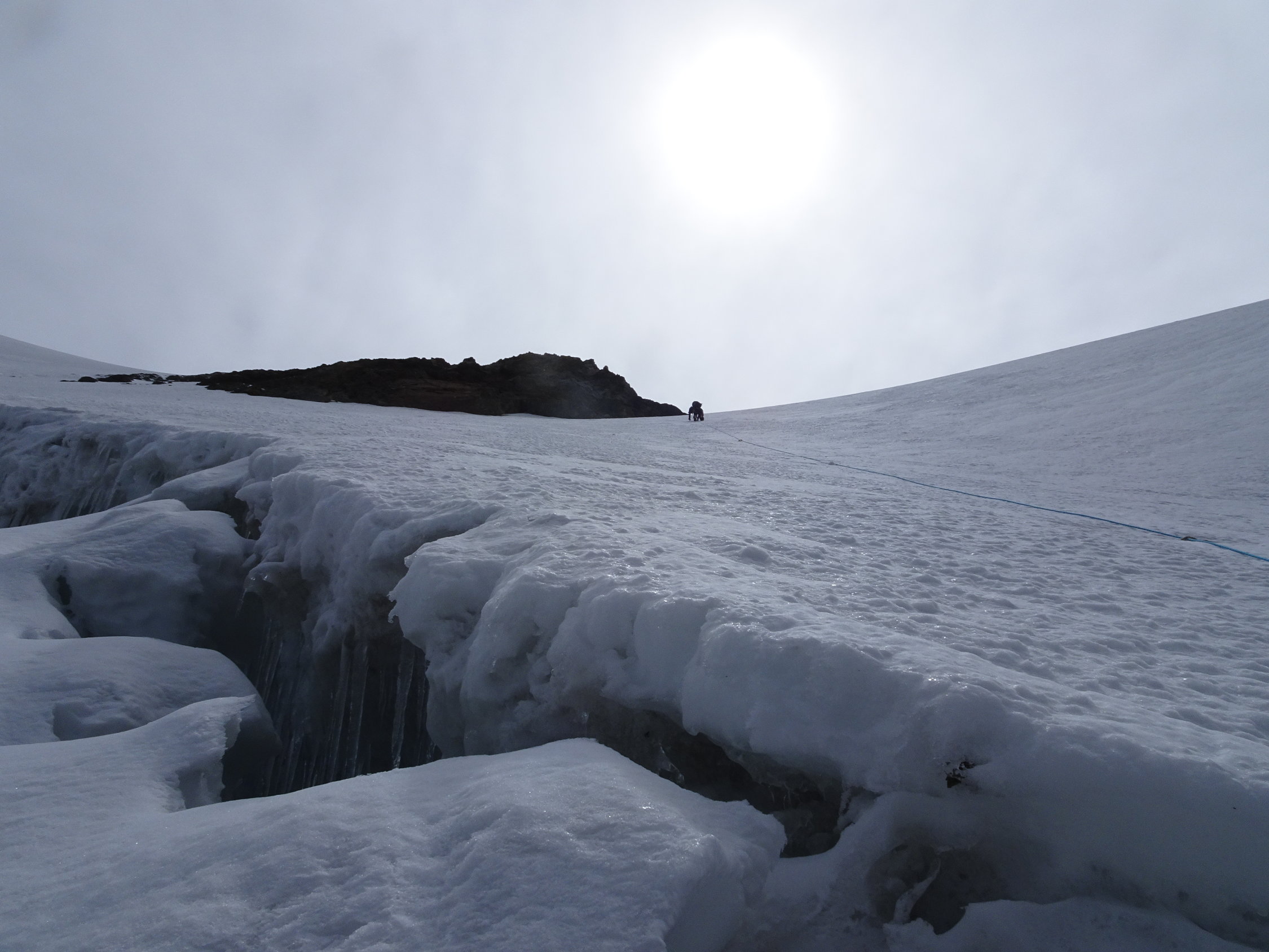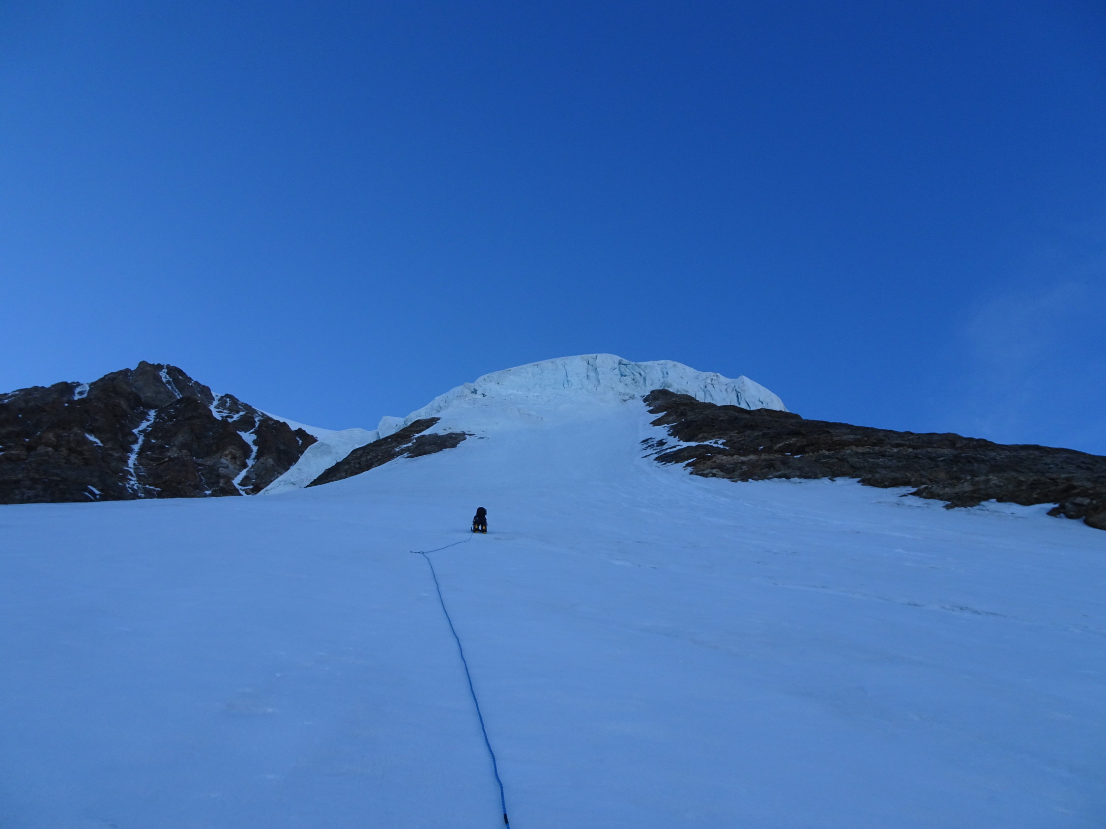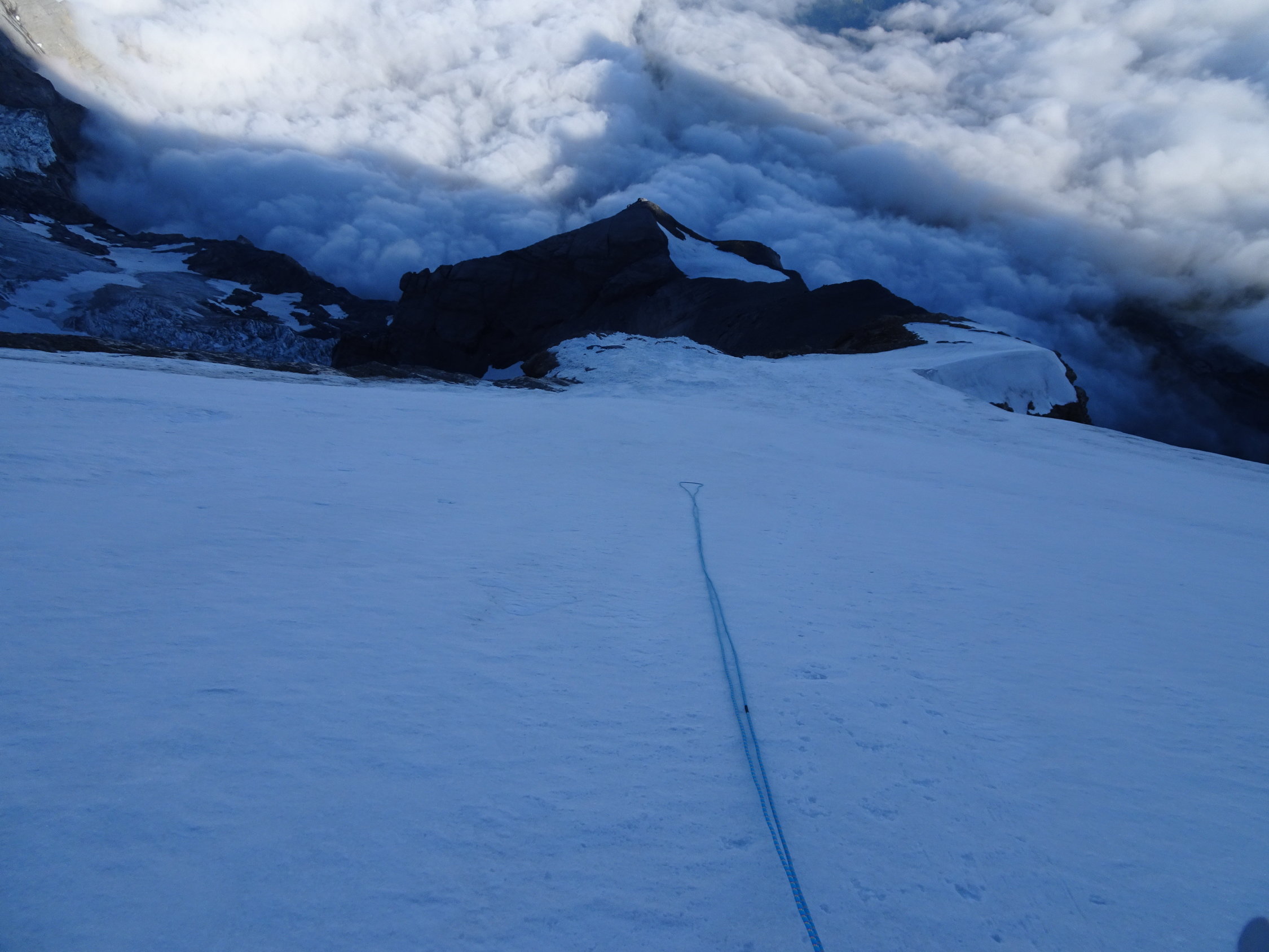 Der untere Teil des Nollen war mit 2-5cm Firm bedeckt; darunter sattes gutes Eis. Die steile obere Passage 60°-80° war weitgehend Blankeis. Ein paar Eisstücke kamen mir entgegen, eines direkt auf den Helm. Wir verwendeten 8 Schrauben. Im Firnfeld, nach dem Nollen gingen wir am laufenden Seil (Tibloc). Den Abschluss kletterten wir über den Südwestgrat.