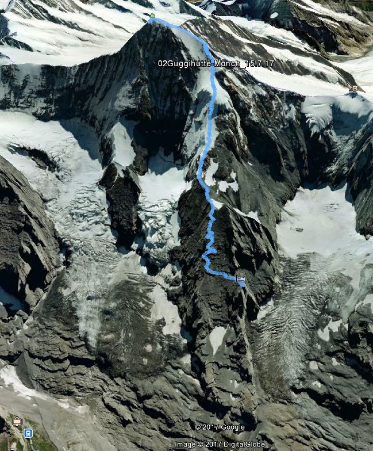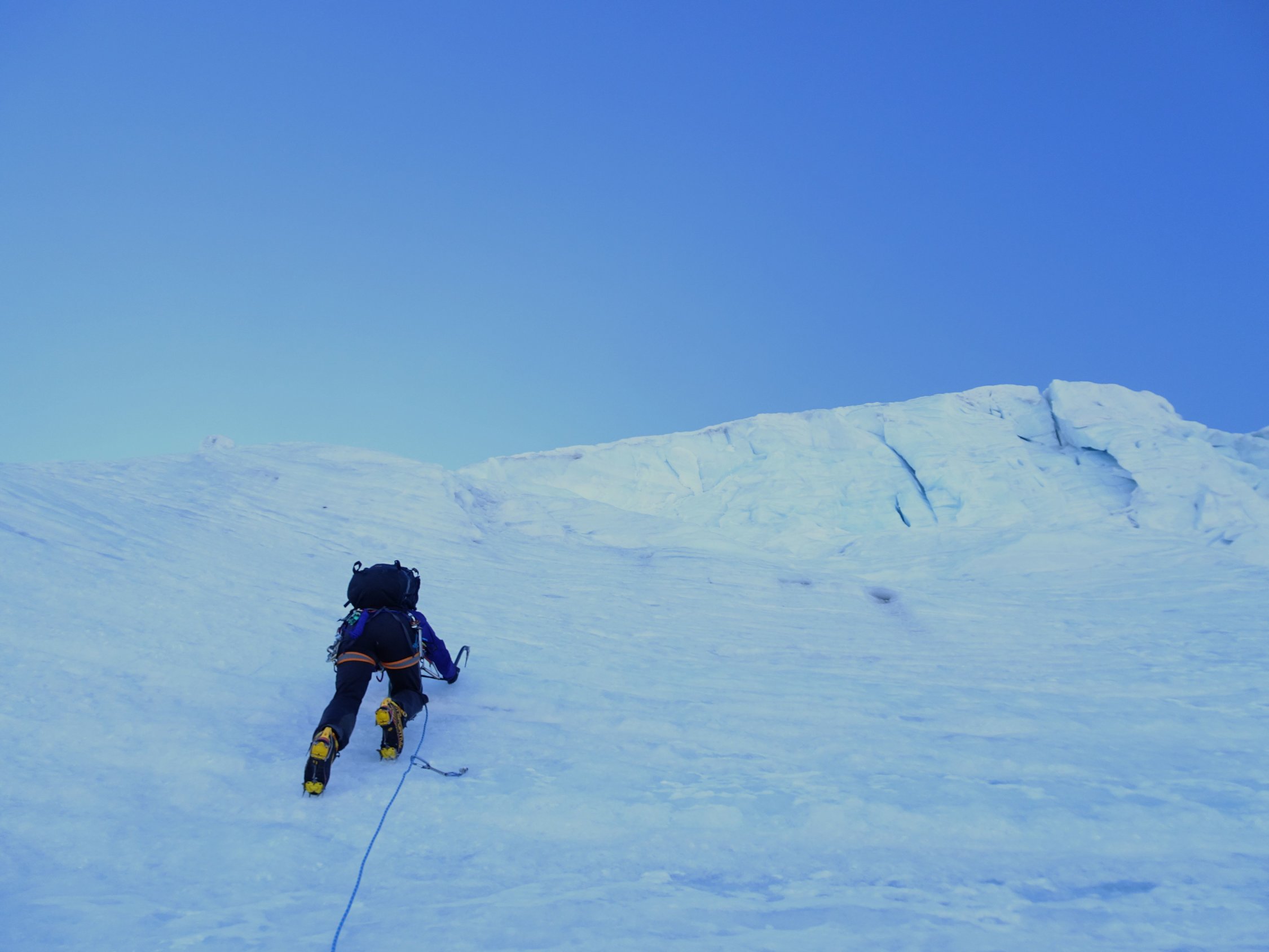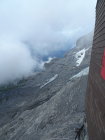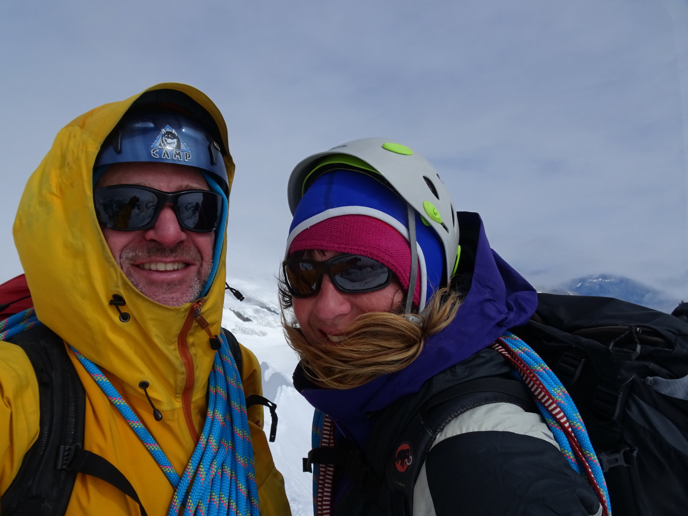 Der untere Teil des Nollen war mit 2-5cm Firm bedeckt; darunter sattes gutes Eis. Die steile obere Passage 60°-80° war weitgehend Blankeis. Ein paar Eisstücke kamen mir entgegen, eines direkt auf den Helm. Wir verwendeten 8 Schrauben. Im Firnfeld, nach dem Nollen gingen wir am laufenden Seil (Tibloc). Den Abschluss kletterten wir über den Südwestgrat.