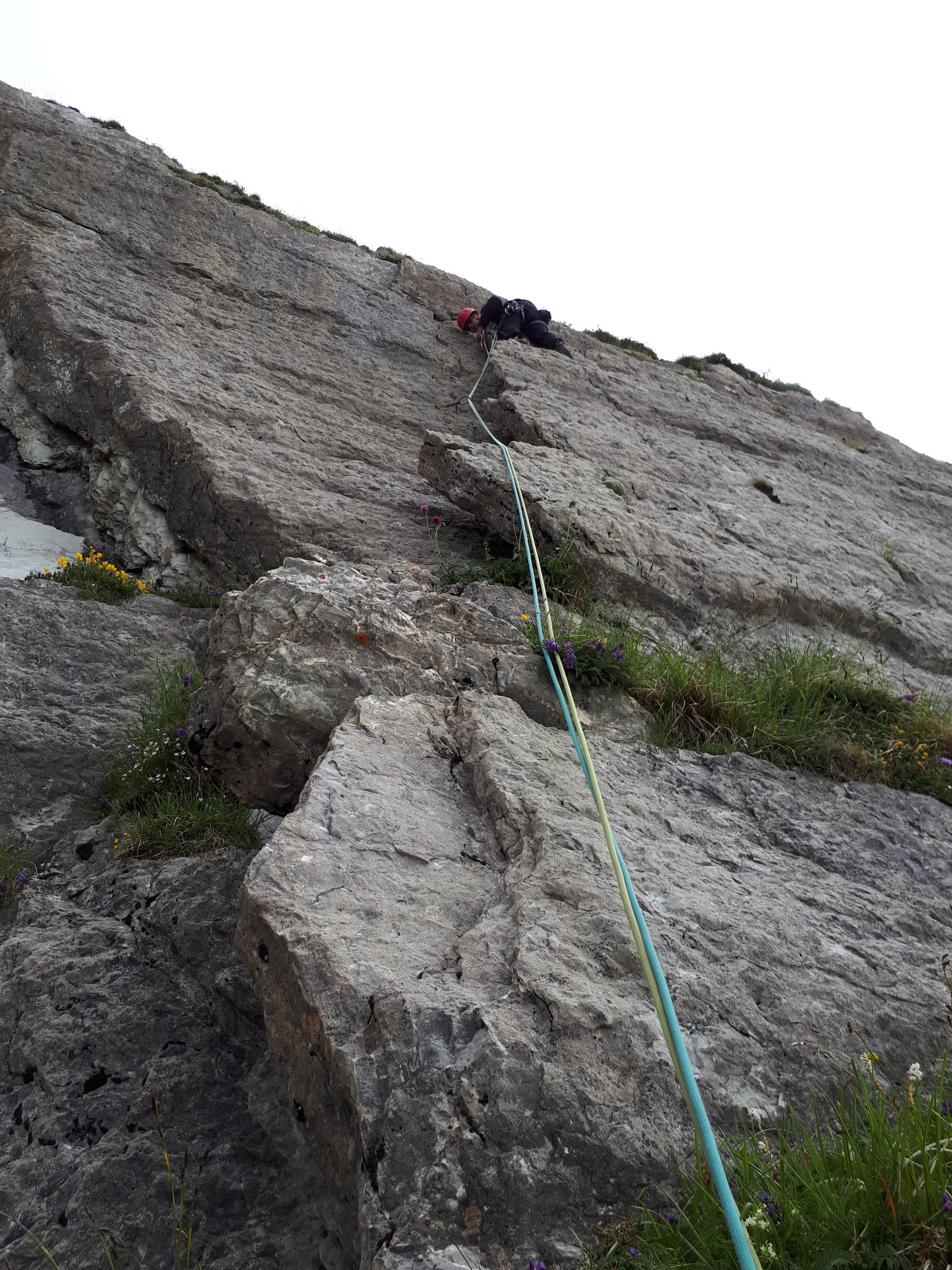 Alles trocken. Notwendige Haken vorhanden. Die schwierigen Seillängen haben tollen Fels bei den Leichteren kann man sich dann fast unsicherer fühlen wie in den schwereren und kompakten SL da doch lockere Steine und rutschiges Gras vorhanden sind. Abseilen dauert auch 2 Std. wir hatten einen Seil verhänger und waren dann zack bei 3 Std. abseilen. Gleichlang wie Aufstieg.