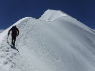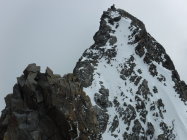 Aufstiegstourenbeginn um 00:30 Uhr in Pontresina bei 8°C bis Berghotel Roseg auf unbefestigtem Fahrweg unter teilweise sternsichtbaren Himmel immer wieder abgelöst von nässenden Nieselregenwolken. Ab der Tschiervahütte wurde es morgens zunehmend heiter, vormittags sonnig, ab mittag immer mal wieder Nebelwolken. Am Nachmittag auf dem Spallagrat dann kalter Wind. Abends an der Rif. Marco e Rosa -5°C. Stellenweise unangenehmes Blankeis im letzten Steilstück zur Fuorcla Prievlusa hinauf und im letzten Stück zum unteren Ende des Biancograts hoch. Der Biancograt ist bestens gespurt. Die „Haifischflosse“ ist links herum einladend gespurt. Die Kletterstellen sind alle schneefrei. Abstiegstourenbeginn am Sonntag von der Rif. Marco e Rosa um 07:30 Uhr bei heftigem Westwind, aber klaren Sichtverhältnissen. Die Route über Bellavista ist gut gespurt. Die Fortezza war schneefrei und gut frequentiert.