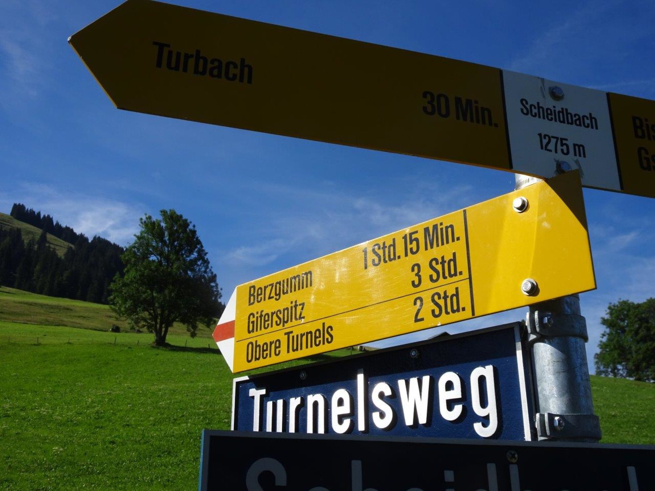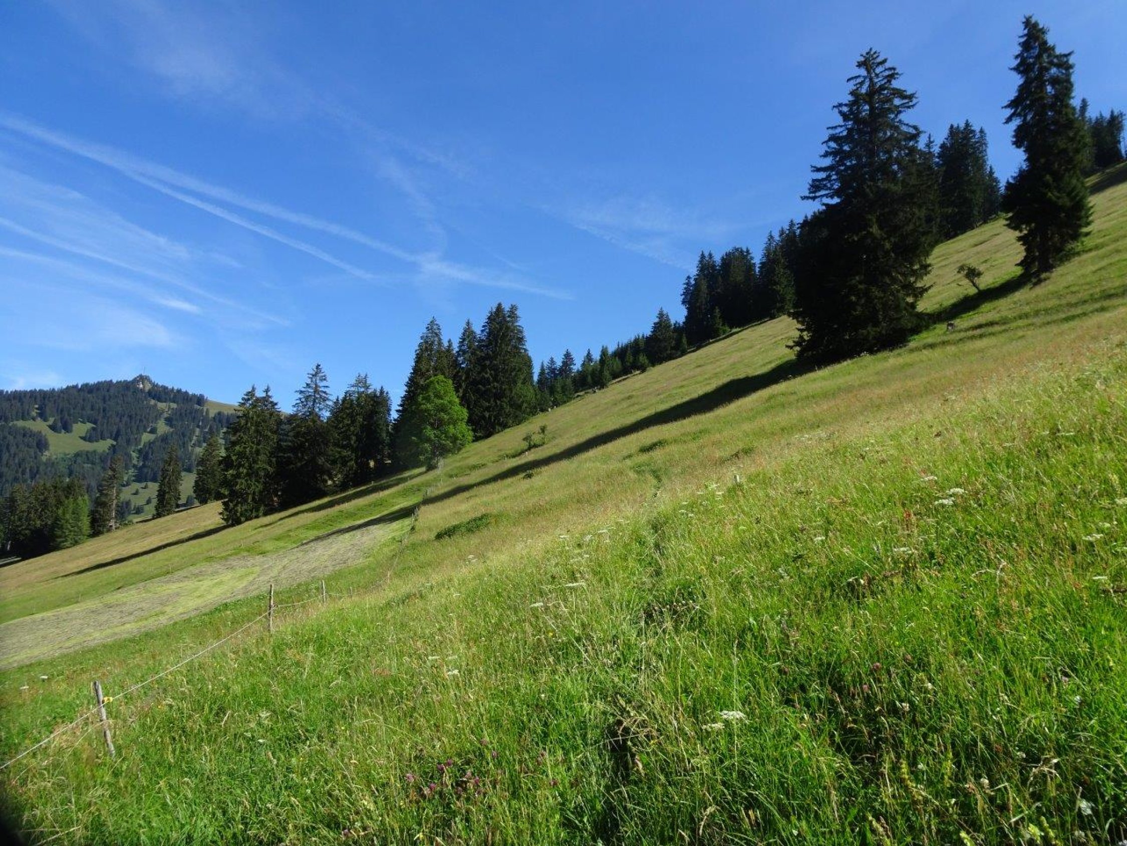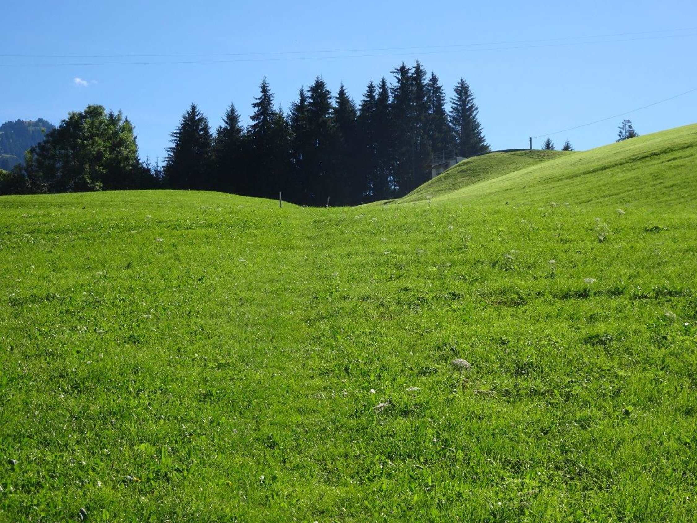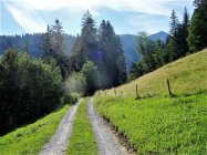 schöner Sommermorgen mit 15° bei der Ankunft um 8.50 in Gstaad. Die Verhältnisse auf der ganzen Tour trocken. Zu Beginn und bei der Rückkehr nach Gstaad marschiert man abwechselnd auf Teer-Kies-Grasunterlage.