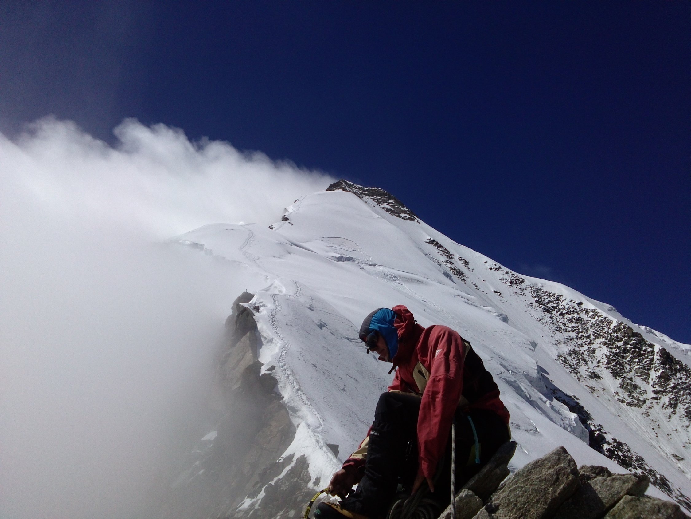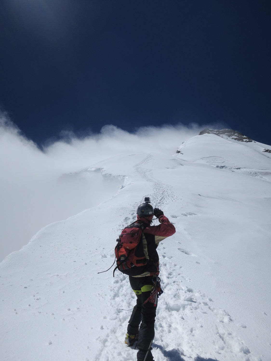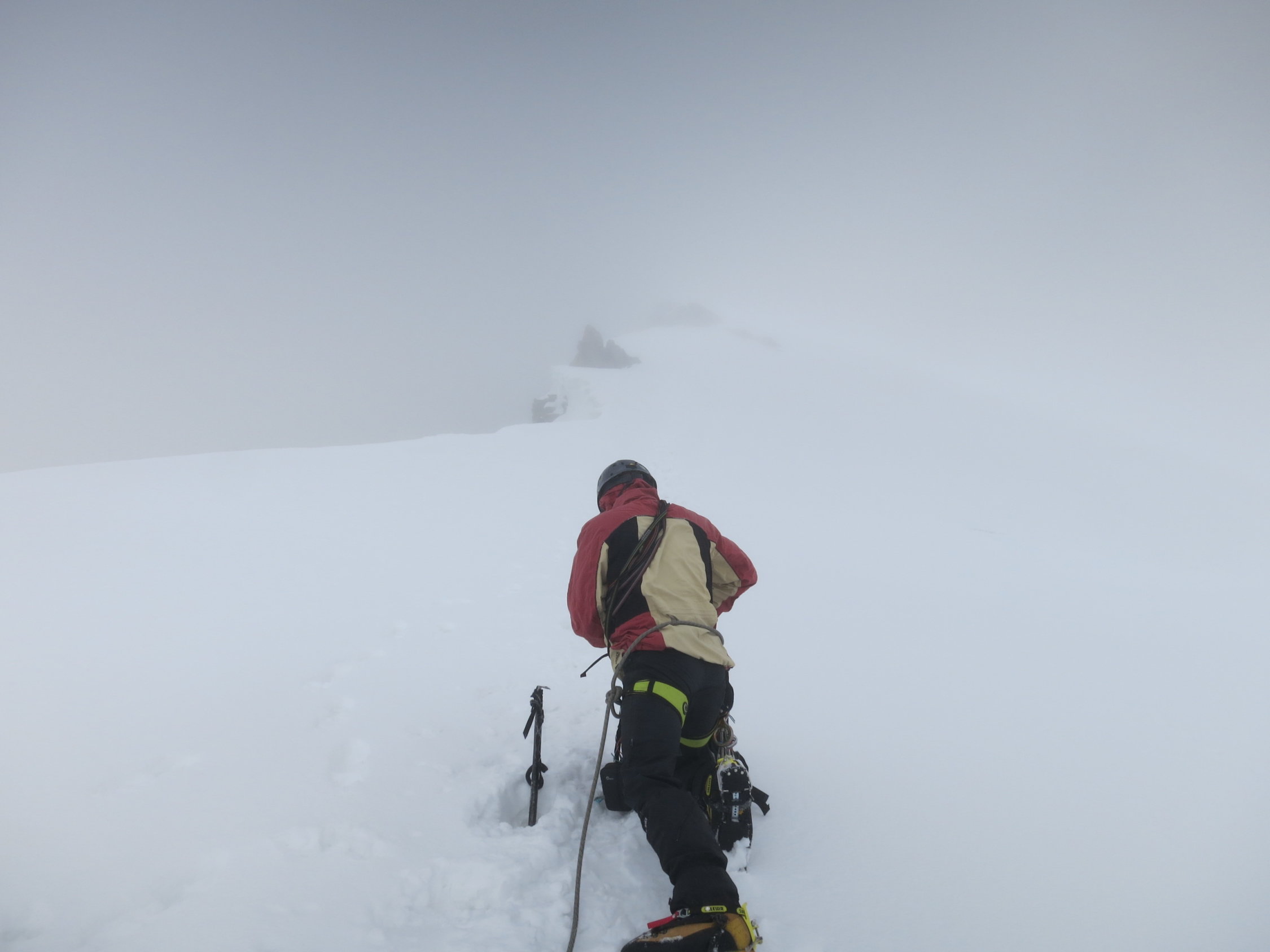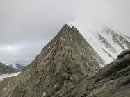 Geamter Felsgrat schneefrei, dann folgen ca. 10 - 20 m ausgesetzter Firngrat. Danach die Firnflanke hoch bis zu den Gipfelfelsen. Der letzte Hang hat einige kurze Stellen mit etwas hartem Schnee bzw. etwas Eis unter der Schneeauflage.