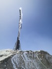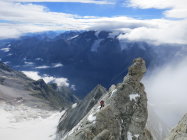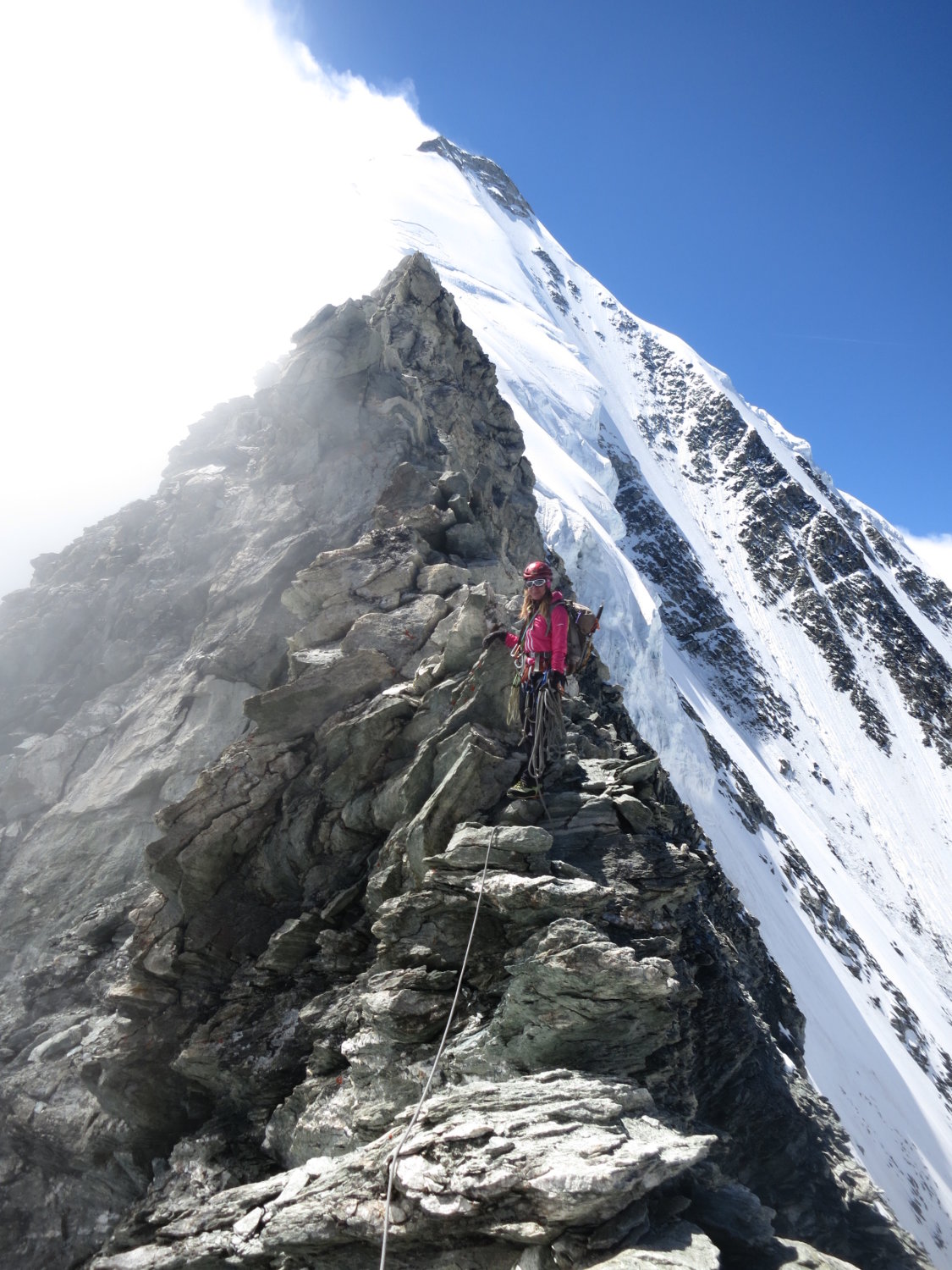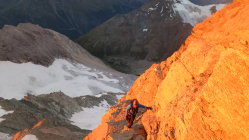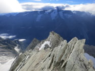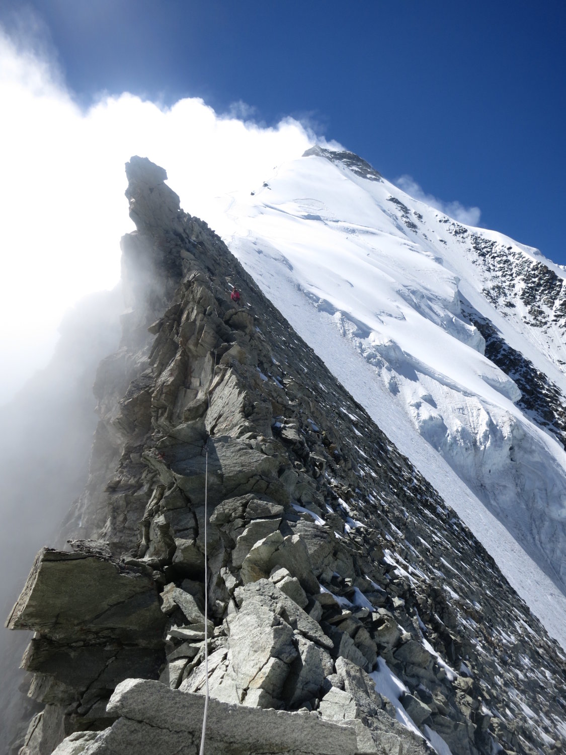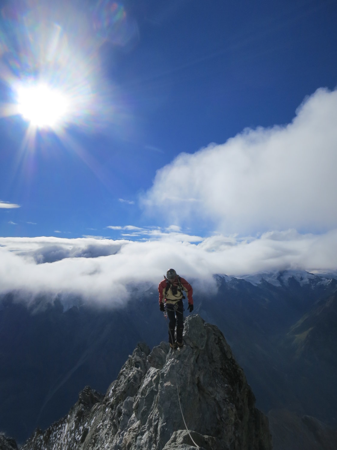 Geamter Felsgrat schneefrei, dann folgen ca. 10 - 20 m ausgesetzter Firngrat. Danach die Firnflanke hoch bis zu den Gipfelfelsen. Der letzte Hang hat einige kurze Stellen mit etwas hartem Schnee bzw. etwas Eis unter der Schneeauflage.