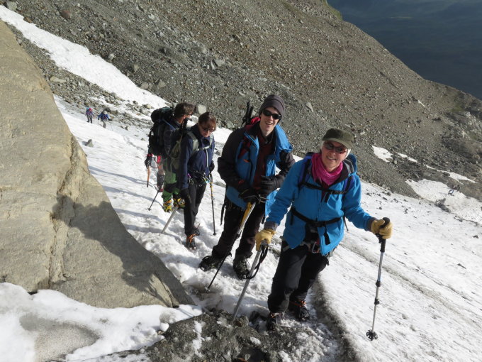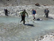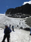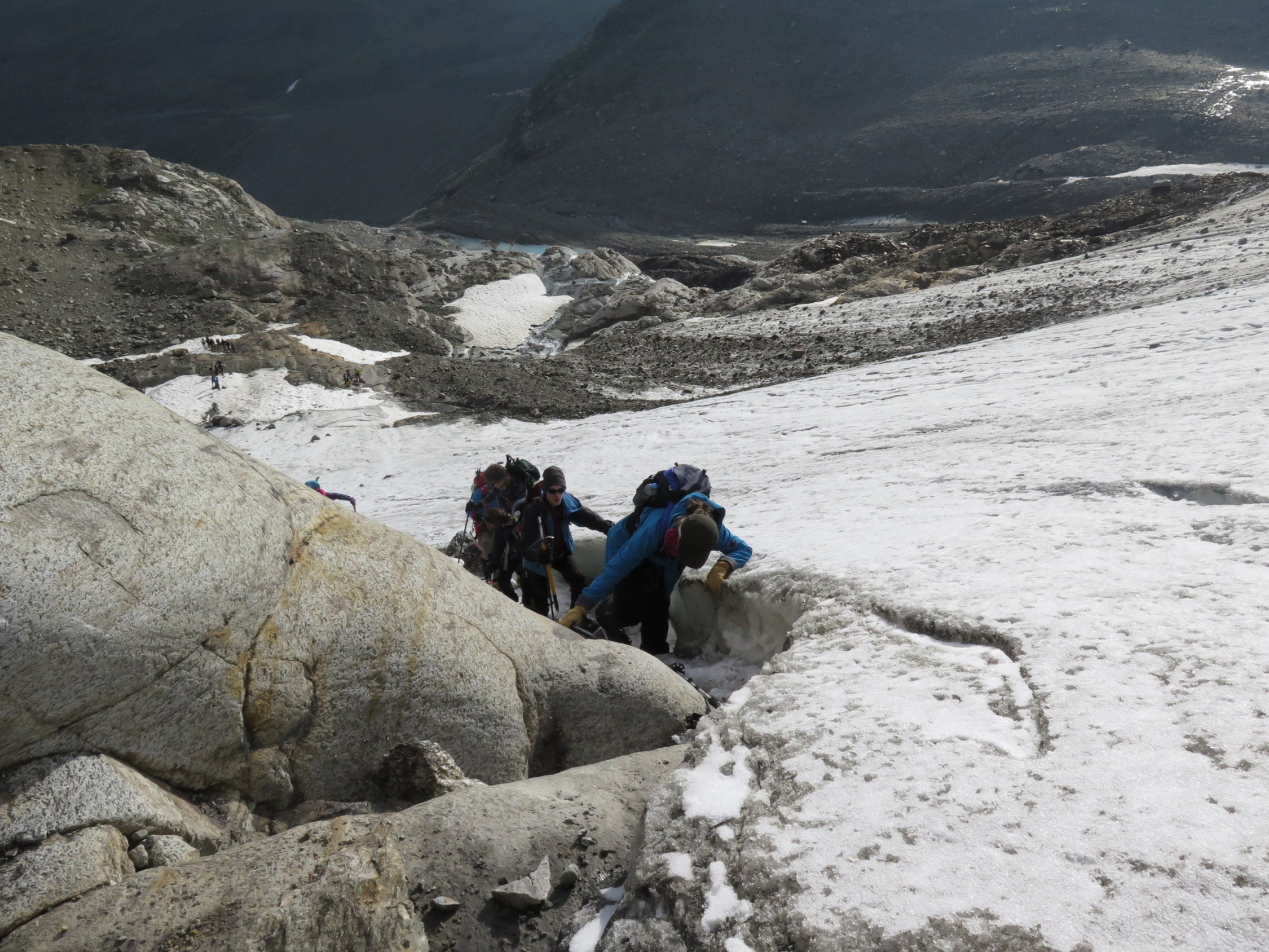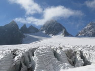 Auf dem spaltenreichen Gletscher leichte Neuschnee/Graupel-Auflage. Recht viele Spalten sind zu überqueren, einige davon auch mit kleineren, selten auch größeren Löchern von teilweise eingebrochenen Personen.
