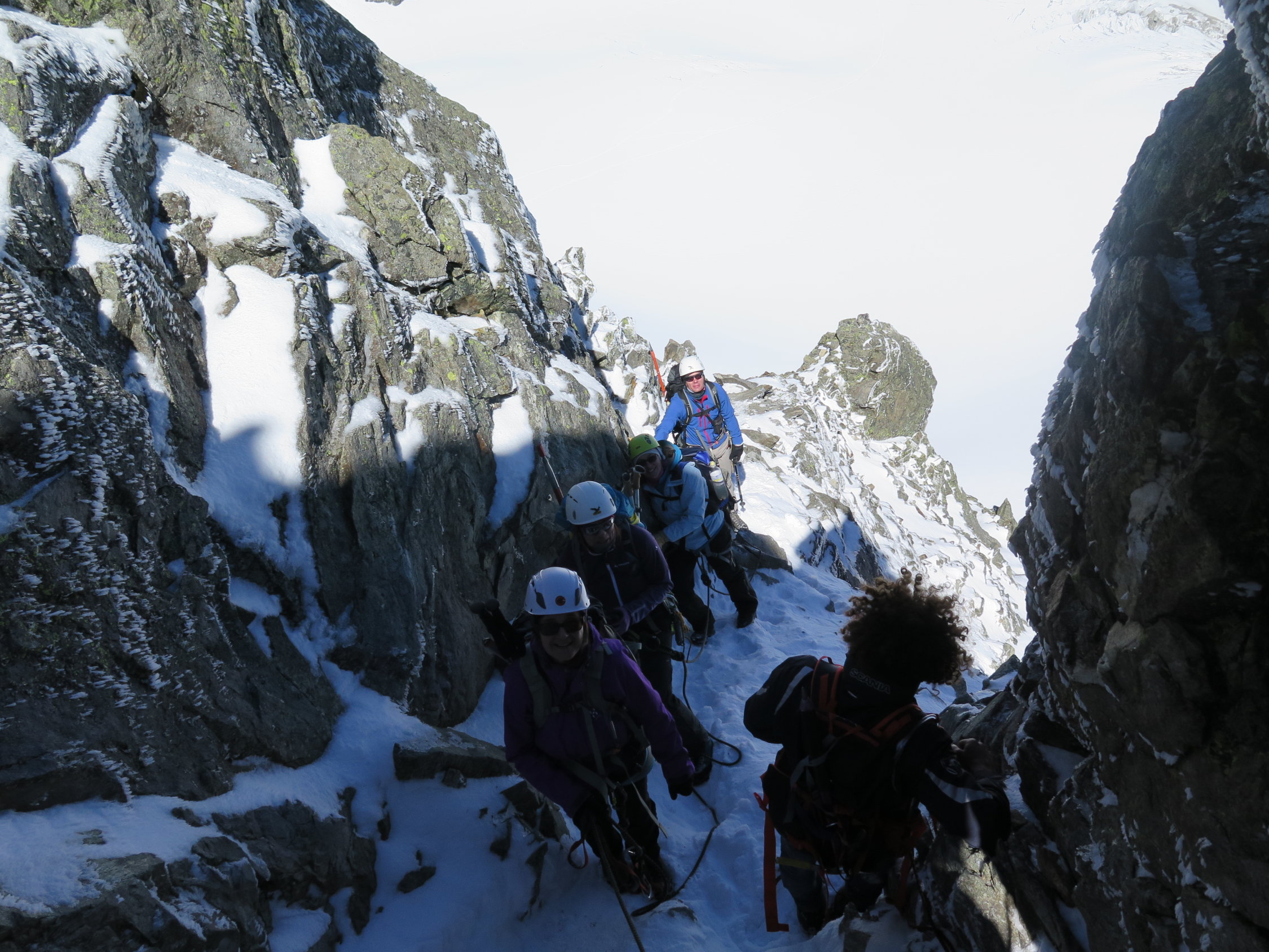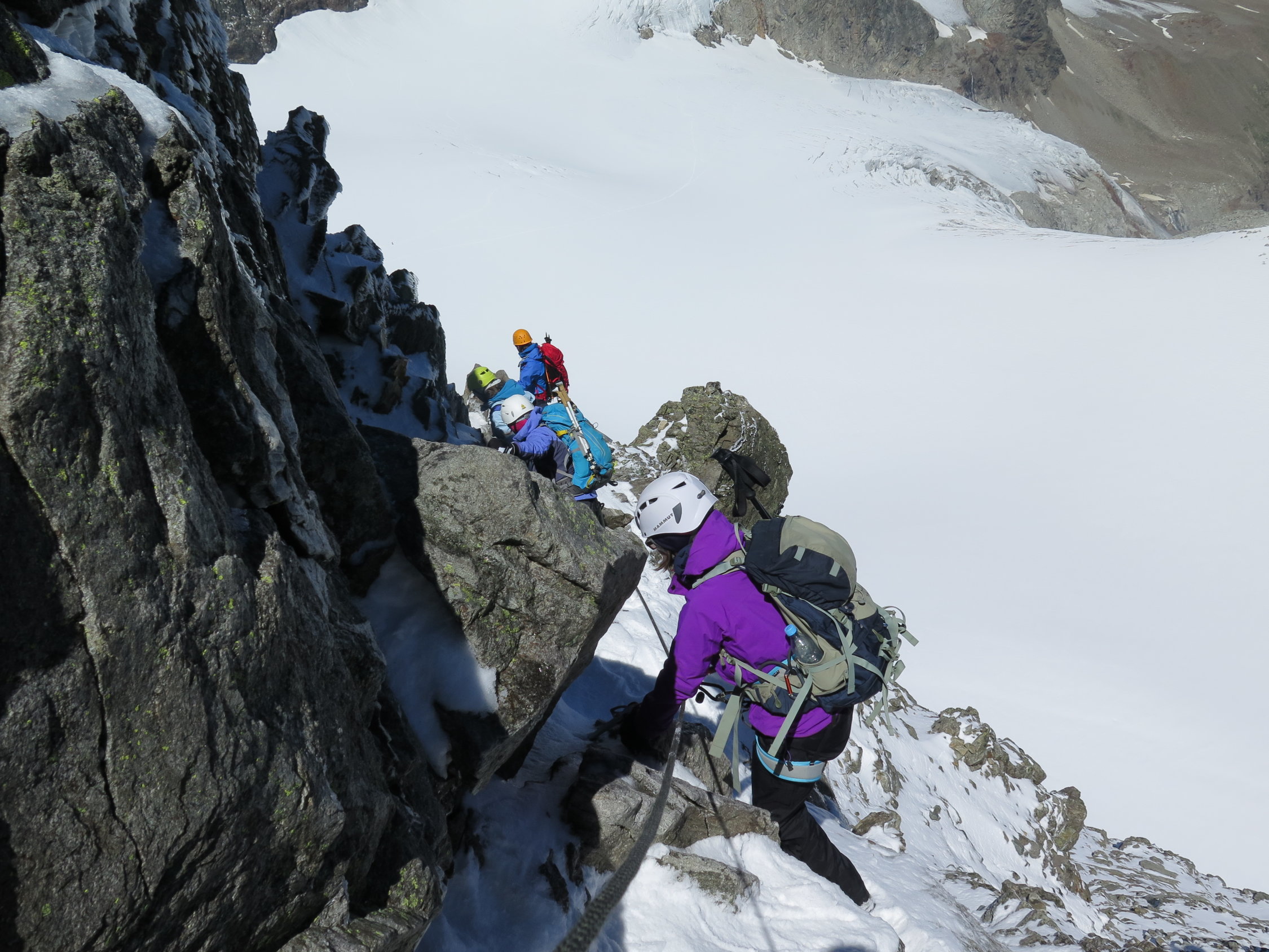 In der Flanke von Beginn an leicht schneebedeckt, geht aber gut ohne Steigeisen. Inzwischen wahrscheinlich einiges davon weggeschmolzen. Die Kletterpassagen waren etwas anspruchsvoller als in trockenem Zustand. Alle notwendigen Tritte und Griffe aber problemlos nutzbar.
