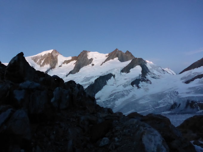 Bedingungen gut. Unterer Teil des Gletschers aper. Weiter oben vor allem im Abstieg weicher Schnee mit recht großen Spalten und entsprechenden fragilen Brücken drüber. Heikel! Grat fast schneefrei. Schnee/Eis lässt sich im Fels gut umgehen. Super zu klettern. Toller Gipfel. Hütte mit super Komfort.