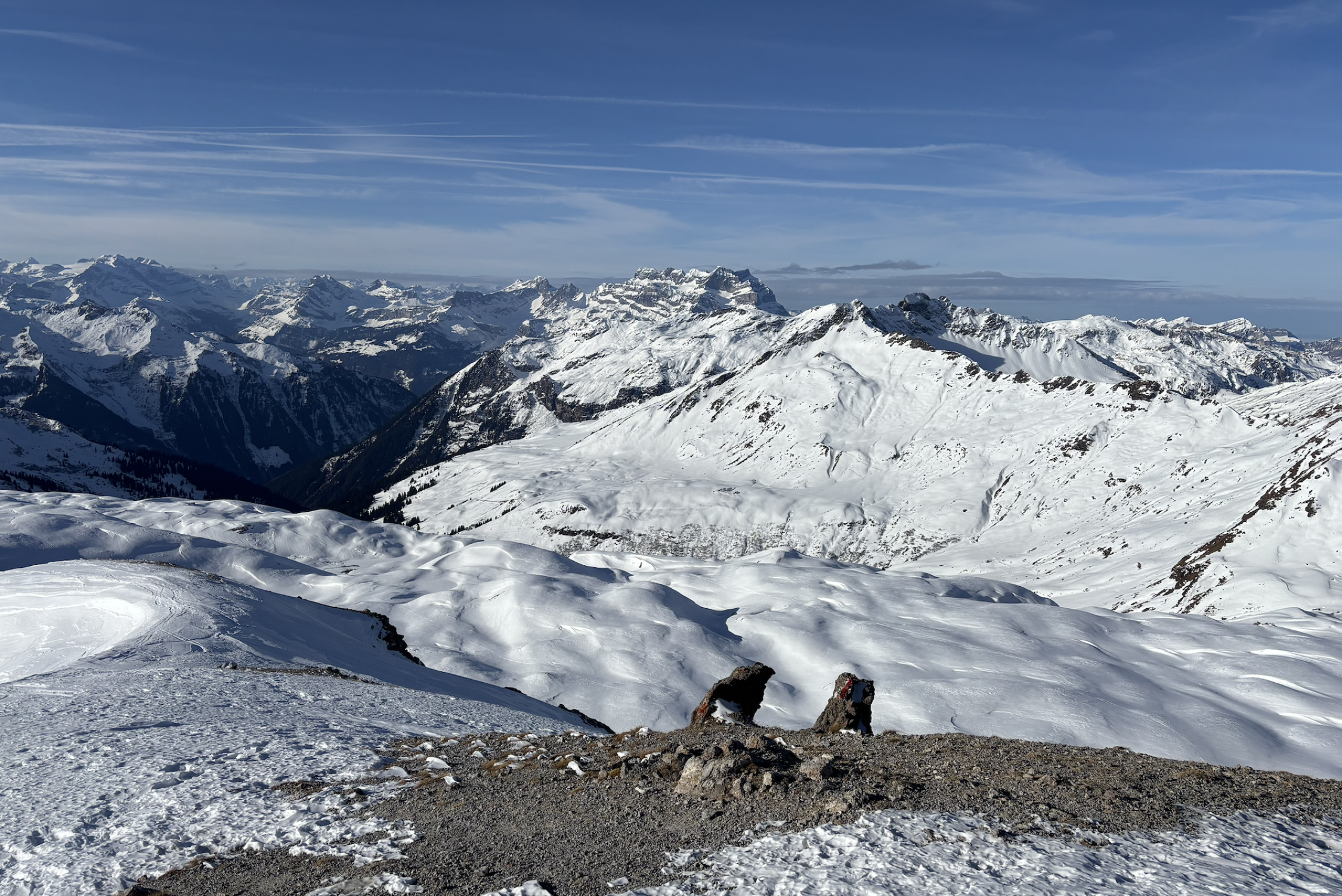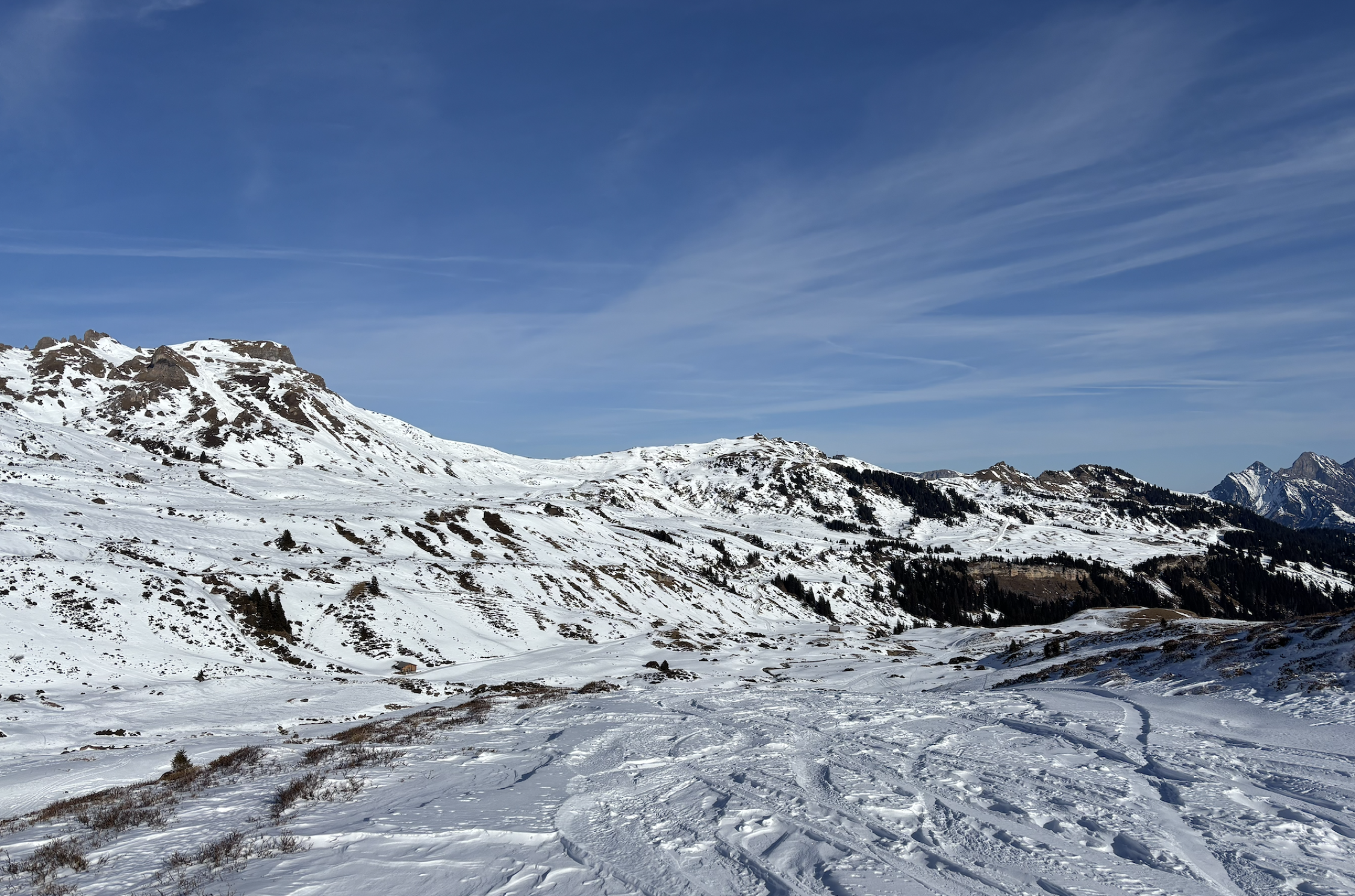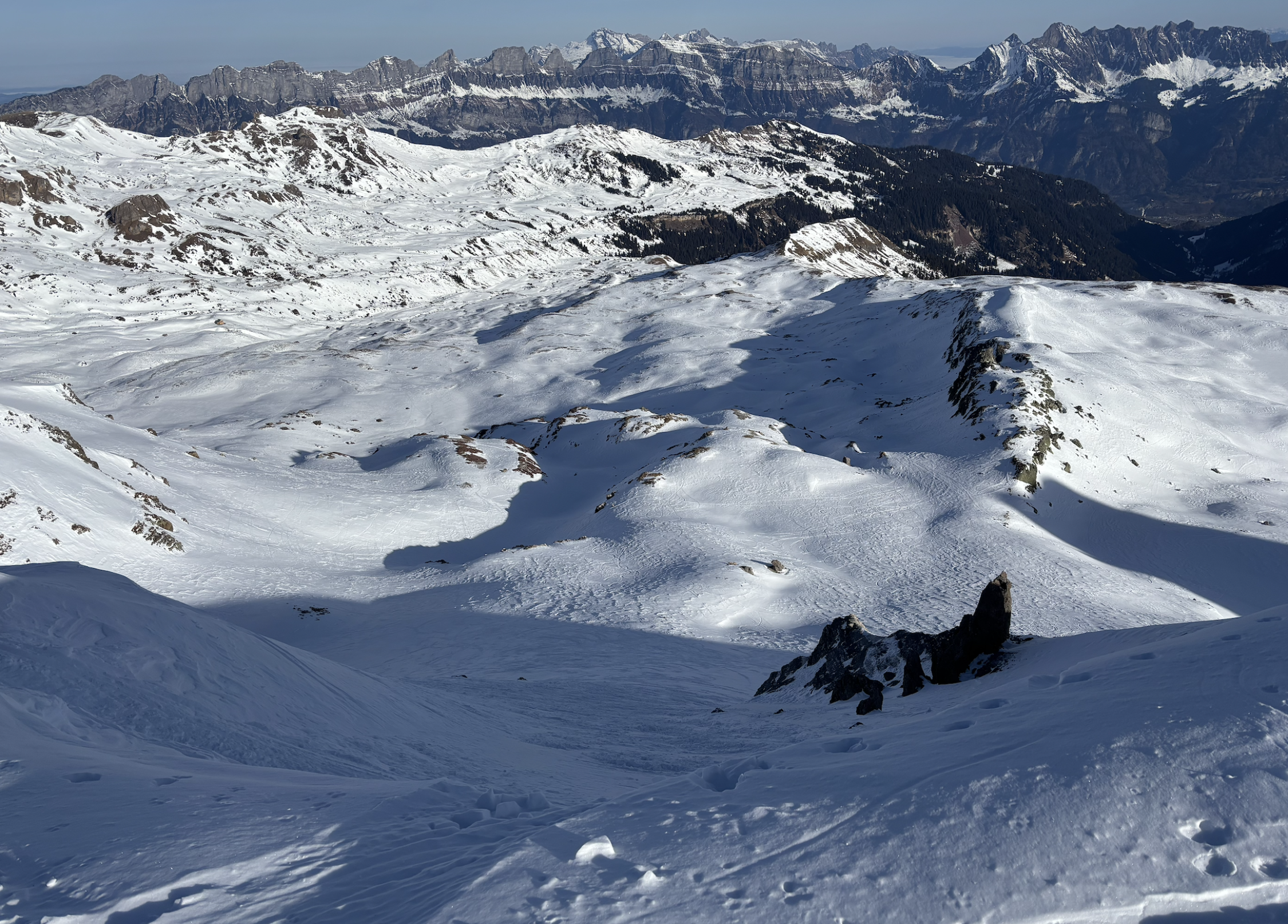 Zusammenfassend: gut machbar, aber vom Genuss bei der Abfahrt sind wir aktuell doch weit entfernt. Die Hanglagen mit Sonneneinstrahlung sind hart, verkrustet. Flache Flächen und schattseitig zwischen Windgangeln und harter Unterlage. Die Kuppen sind vom Wind ziemlich schneefrei gefegt. Dennoch bietet sich über die Alp Fursch ein schöner winterlicher Aufstieg. Die Abfahrt war dann gut machbar, z.T. hart und pistenähnlich hinter zur Alp Fursch. Insgesamt heute trotz Sonne nochmals sehr kalt und eine Biss von Süd bis Südwest.