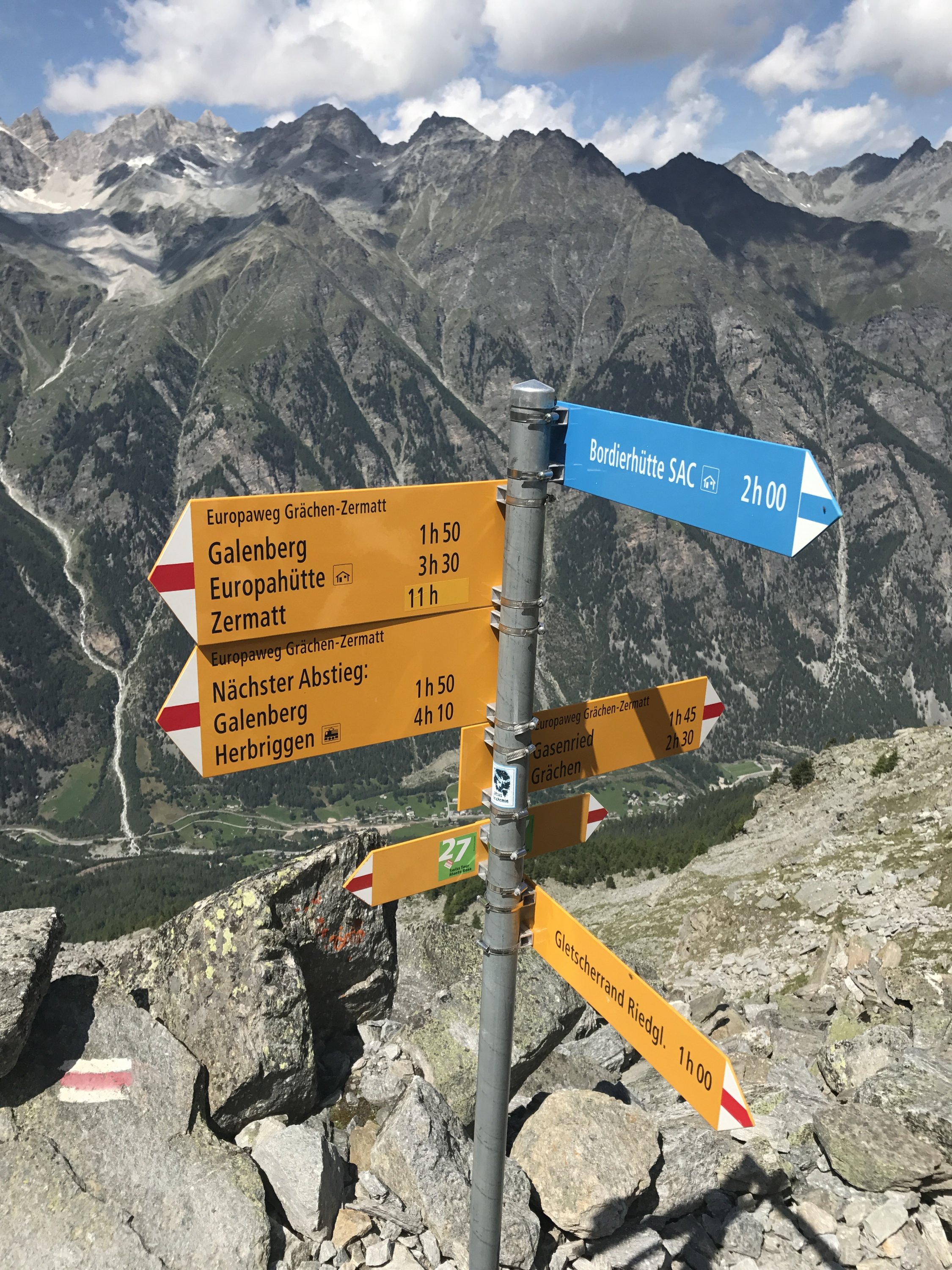 Gasenried - Bordierhütte - Europahütte - Randa Von der Endstation Gasenried dem Hüttenweg folgen. Beim Gletscher können Steigeisen erforderlich sein. Von der Hütte zurück auf den Riedgletscher und beim Pt. 2707 dem Wegweiser Richtung Europaweg folgen. Nach dem Passübergang Pt. 2664 trifft man nach kurzem Abstieg bei Pt. 2562 auf ebendiesen. Bei Galenberg (Abstiegsmöglichkeit ins Tal) den oberen Weg benutzen. Unten sind nur noch Wegspuren vorhanden. Nur kurz nach der Hängebrücke erreicht man Europahütte. Über den Domhüttenweg kann man ins Tal absteigen.