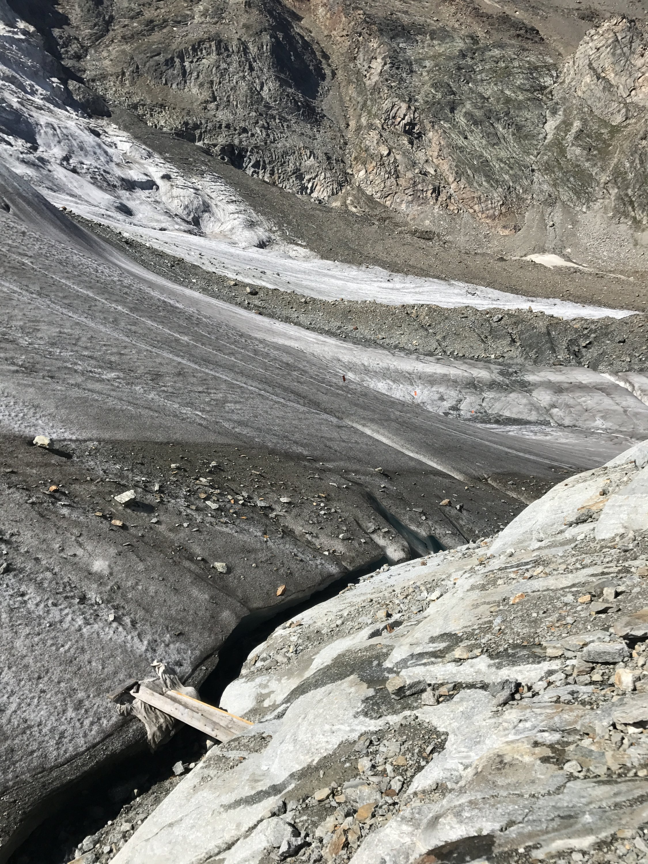 Hüttenweg Bordierhütte in bestem Zustand. Für Glescherendstück sind Steigeisen und Stöcke dienlich. Zur Not geht es auch ohne (etwas links der Markierungen bleiben, dort wo der Schotter etwas halt gibt).