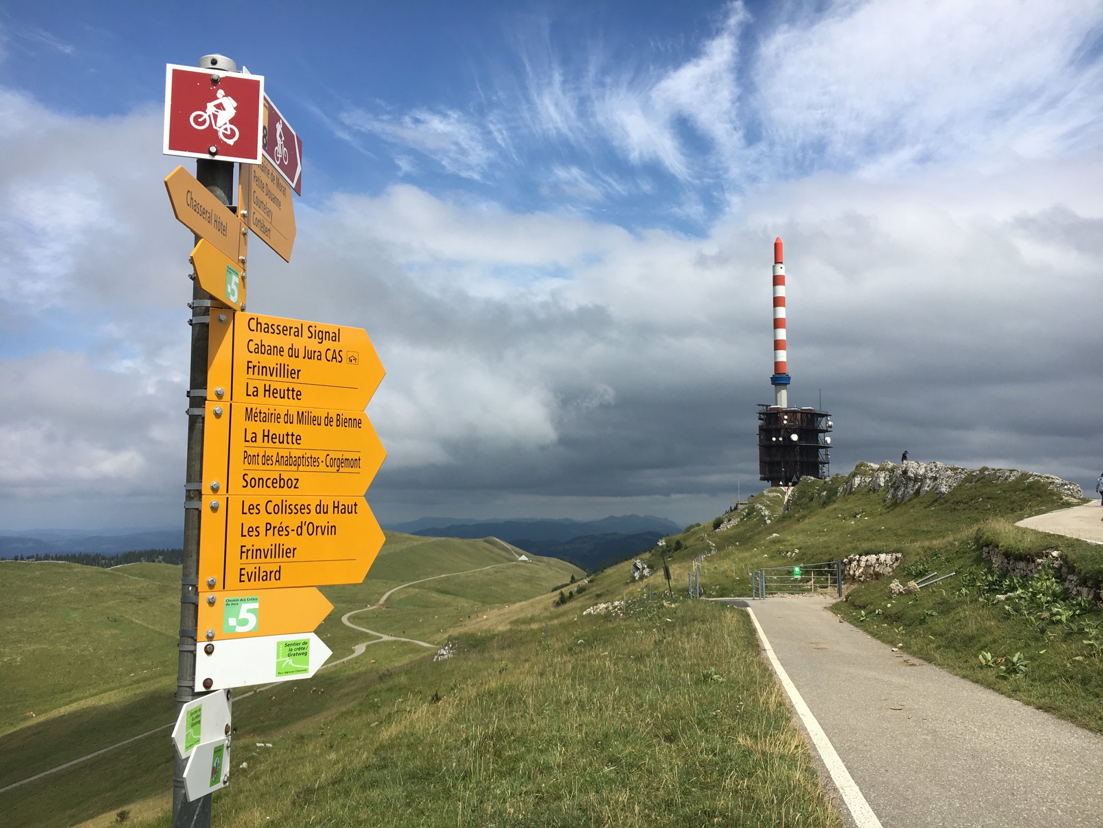 Die letzten Höhenmeter zum Col du Chasseral fährt man auf der Asphaltstrasse, die auch zum Hotel Chasseral und zum Sendeturm führt.