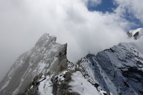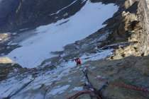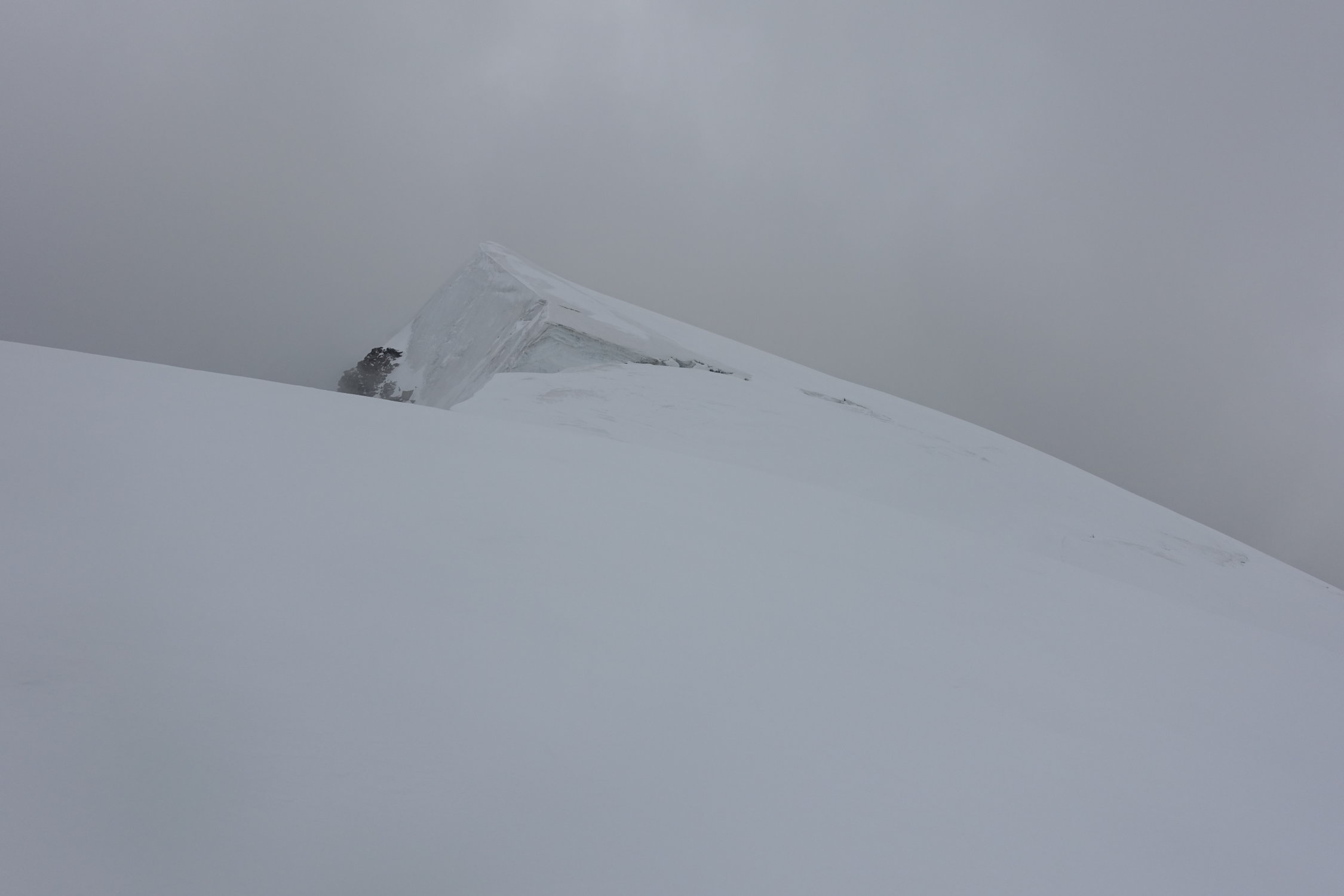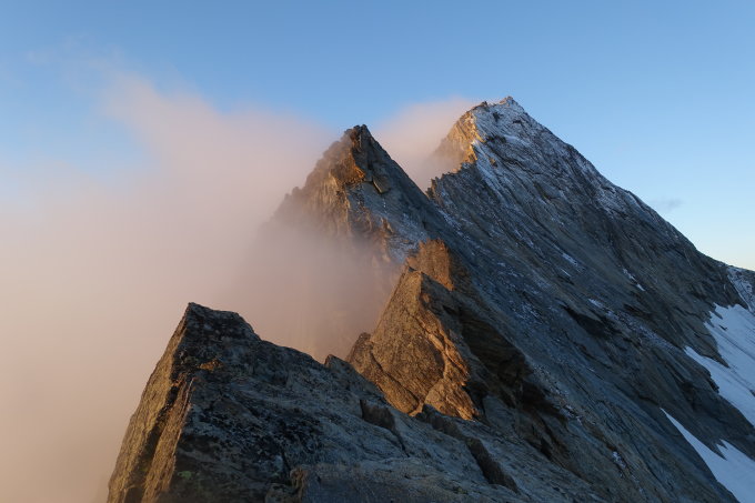 Nach dem Gewitter von Freitag Abend sind viele Stellen auf der Nordseite des Grates vereist, was die Tour insbesondere am "plattigen Turm" anspruchsvoller macht. Der wenige Neuschnee dagegen stört kaum. Der Firngrat zum Gipfel ist stark verwechtet (Achtung versteckte Randspalten). Die Spalte vor dem Gipfelaufschwung hat noch eine breite Brücke, wegen dem Neuschnee es ist jedoch schwierig einzuschätzen, wie tragend diese noch ist. Es empfiehlt sich jedenfalls nicht, den Firngrat seilfrei zu gehen. Nach der Spalte kurz etwas harter Firn, aber nicht blank.