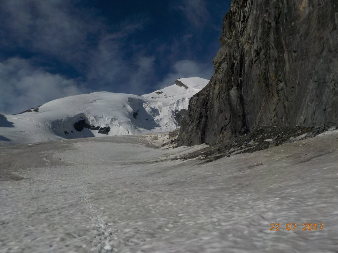 Die Spaltenzone beim Aufstieg unterhalb des Grates muss jeweils beurteilt werden.
