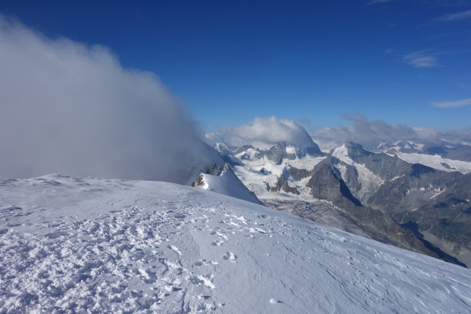 Kurz nach dem Start begannen sich die Wolken zu verziehen. Sehr schöne Stimmung mit den Wolkenfetzen, die an den umliegenden Bergen hingen. Ab ca. 3500 m hatte es in der Nacht geschneit. Am Gipfel ein paar Zentimeter Neuschnee. Ein strammer Wind verschob die Gipfelrast ein paar Meter nach unten ins Joch zwischen dem Doppelgipfel. Danach noch schnell den Nebengipfel bestiegen und wieder zurück ins Tal.