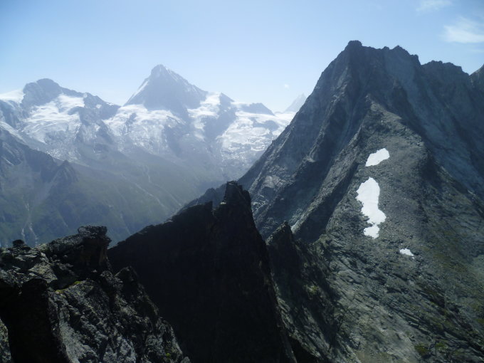 Firnfelder rechts des Grats fast weg und nicht lohnend. Mit etwas Übersicht kommt man in gutem Fels bis hoch.