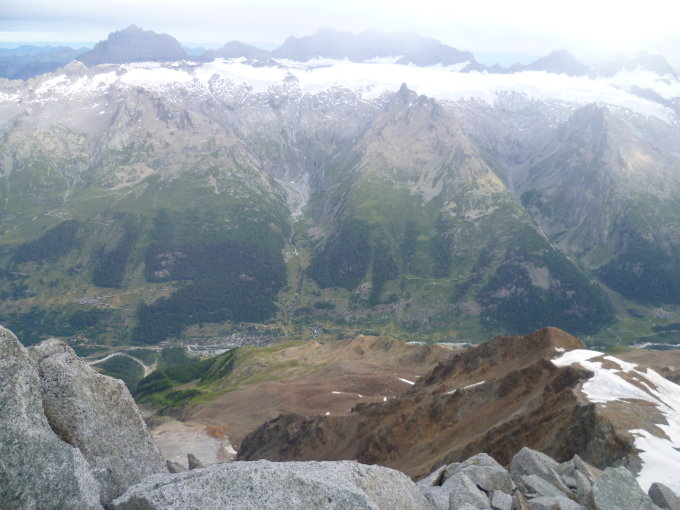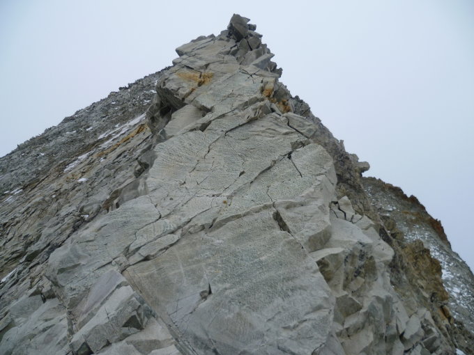 Im Couloir zum Baltschiederjoch erleichert Firn noch ca. 50% des Aufstiegs. Das Firnfeld links (südlich) vom Felsgrat, der zu P3477 hochzieht war noch gut zu gehen und die große Querspalte einfacher zu überwinden, als es von unten aussah. Der Steilaufschwung des Firnfelds oberhalb P3706 ist schon eisig. Die Felsen rechts davon sind brüchig. Die beiden Steilaufschwünge im Nordgrat sind trocken und fest. Sie lassen sich gut mit Steigeisen klettern. Der Rest ging dann besser ohne Steigeisen.