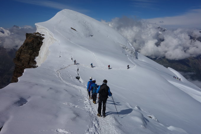 Mit den nächsten Niederschlägen wird der Grat im Aufstieg etwas schwieriger. Im Abstieg sollte man in den Spaltenzonen konzentriert am Seil gehen, da man die Beschaffenheit der grossen Brücken schwer einschätzen kann, vielleicht auch überdenken ob 2m Abstand und kurzes Seil bei der Überschreitung von grossen Brücken wirklich sinnvoll ist, wie oft beobachtet