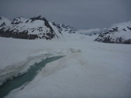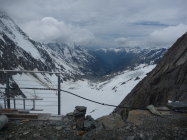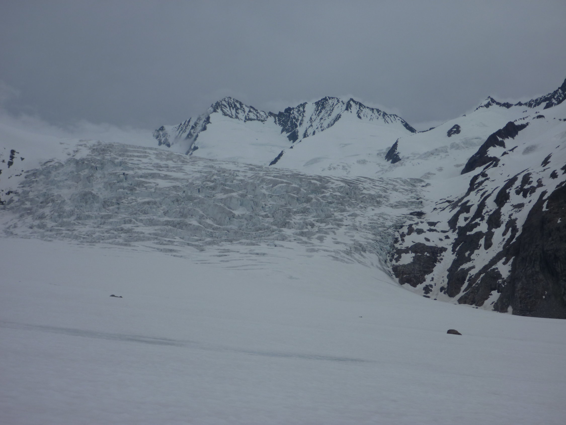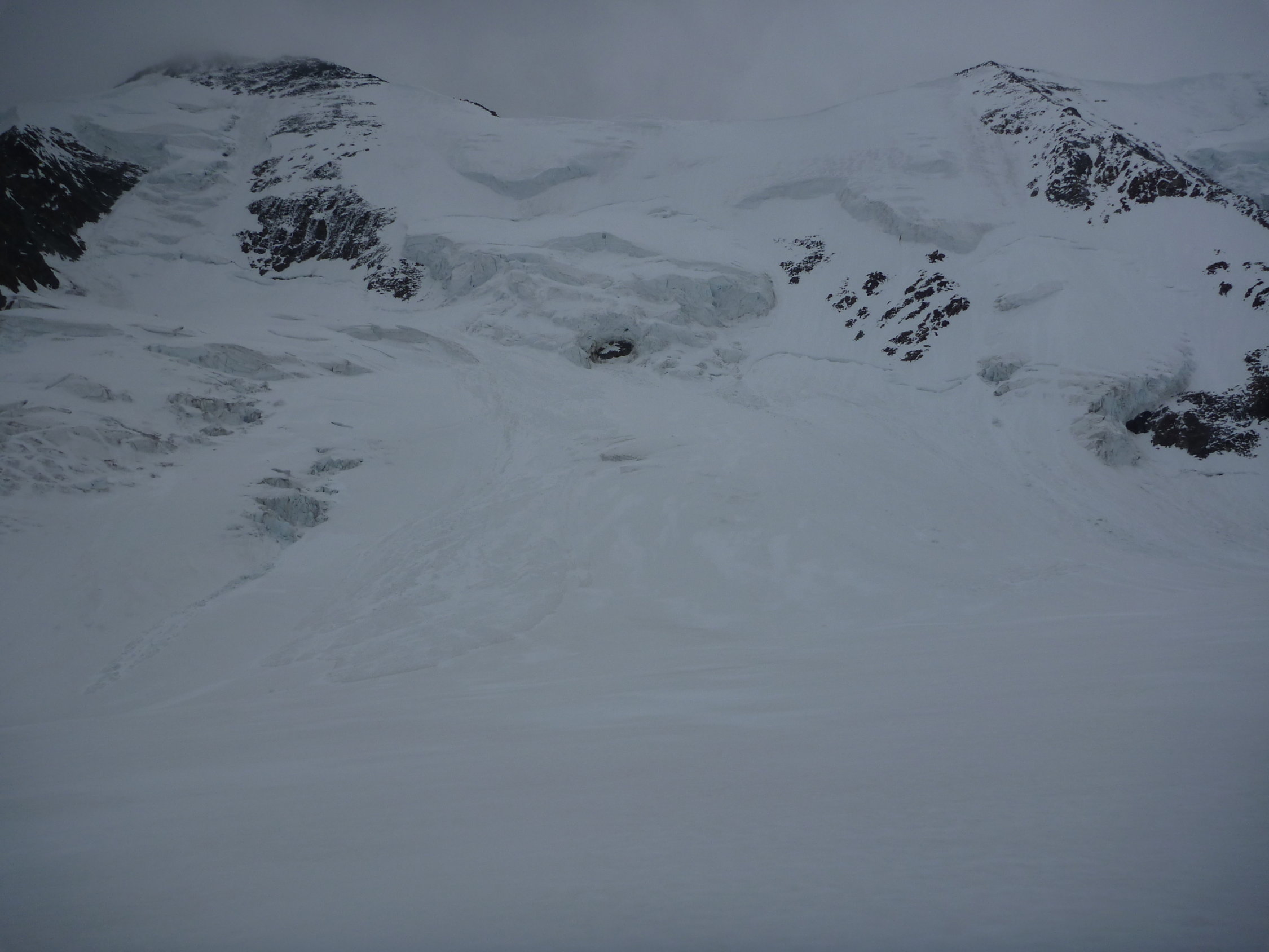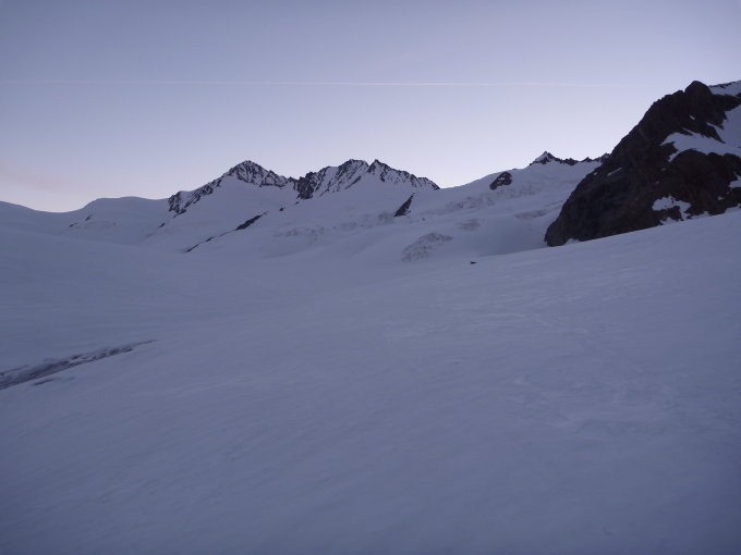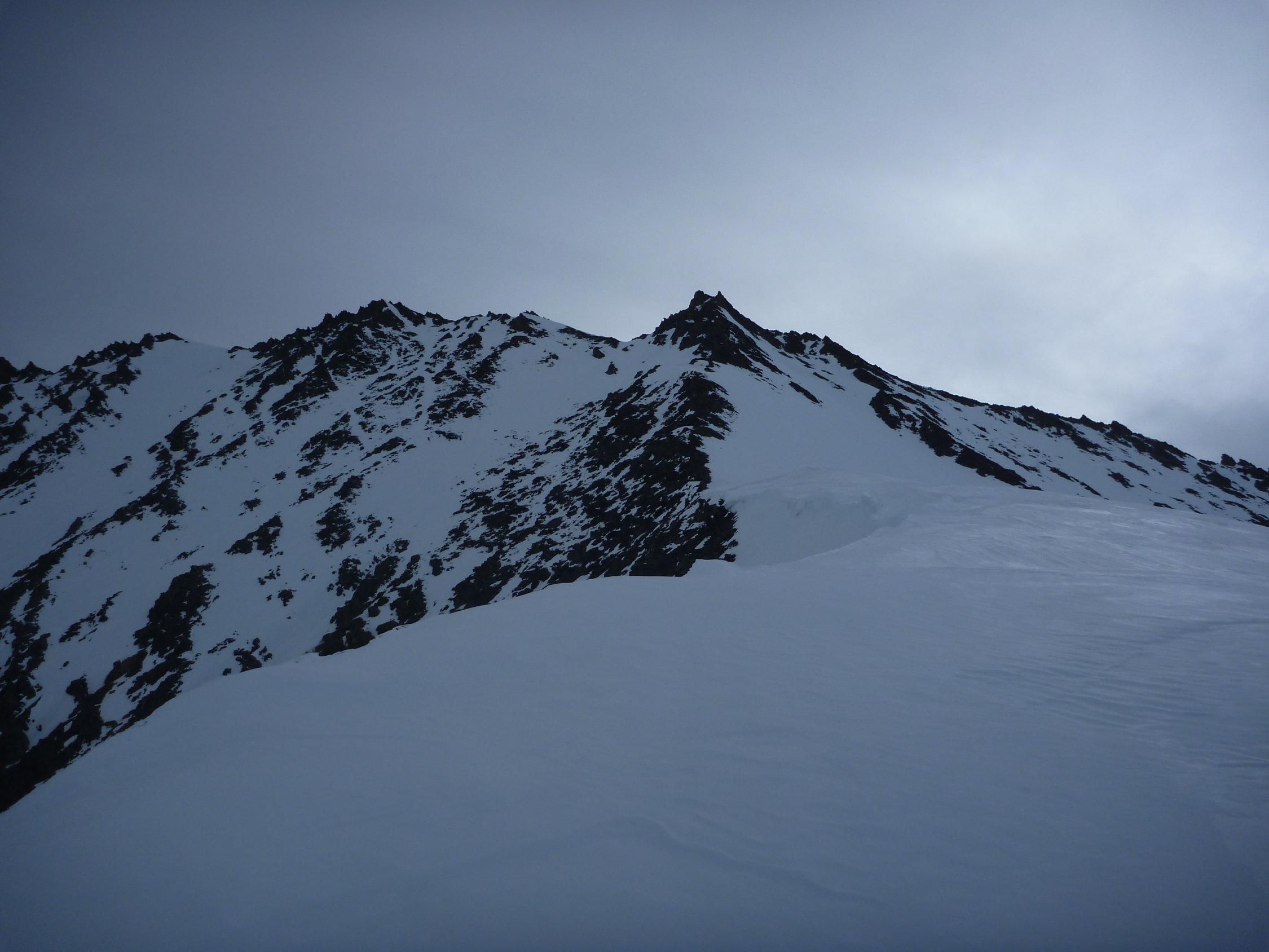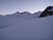 Oberster Firnhang vor dem Skidepot im Aufstieg noch recht hart und nur aufgrund der vorhandenen Spuren einigermaßen mit Harscheisen gangbar. Durch Bewölkung es oben leider nicht aufgefirnt.