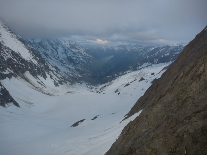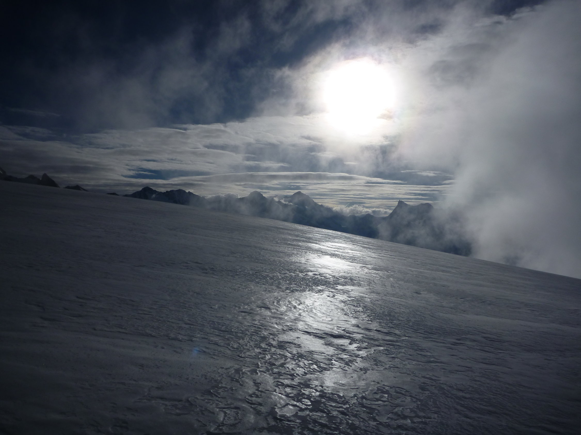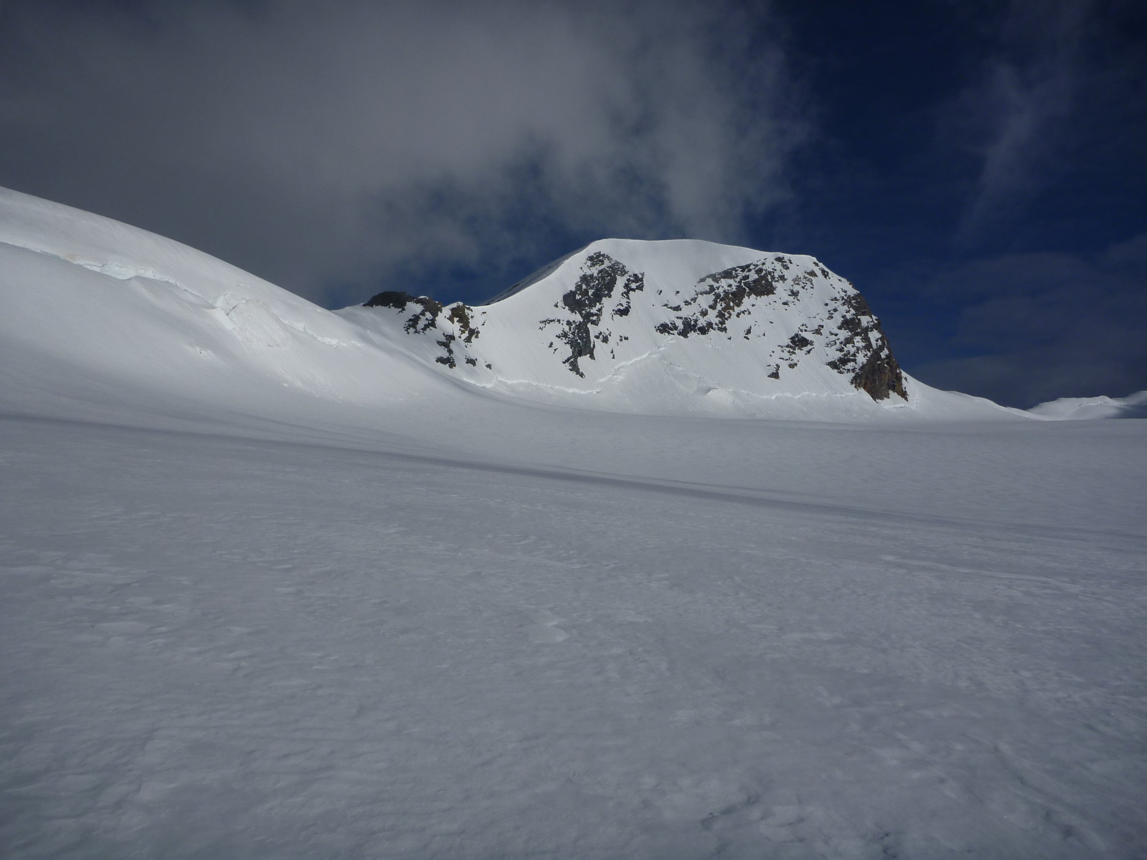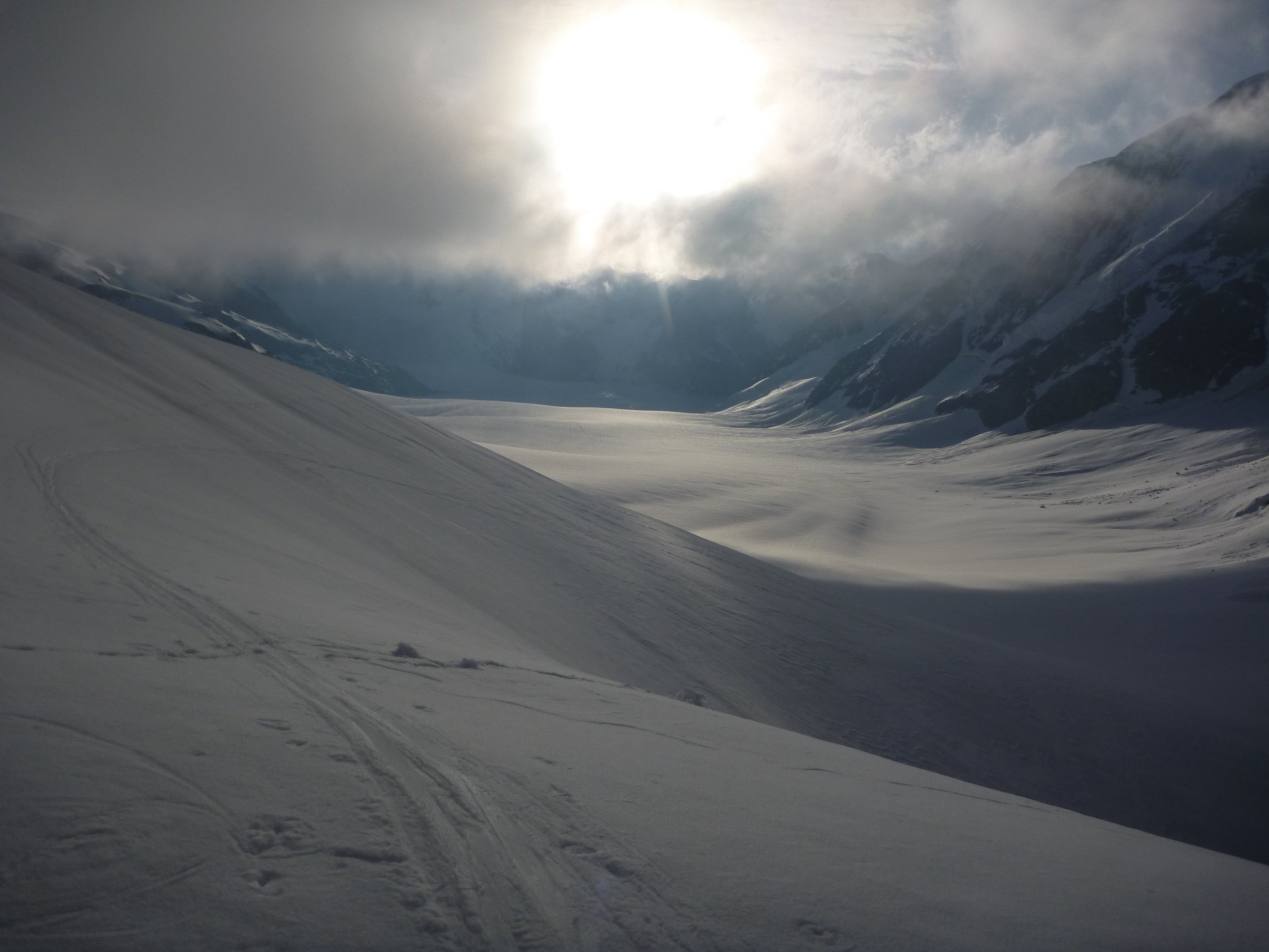 morgens noch Wolken am Grat; Gletscherbruch ziemlich mittig gut machbar; Schneeoberfläche wunderbar glatt und so auch hart gut fahrbar. Direkt zum Langgletscher noch sehr gut möglich. Auf dem Langgletscher Waschbrettschnee. Auf Schneeresten bis oberhalb Gletschertor und dann über Geröll (Steinmänner) unschwierig hinab. Schlüsselstelle ist das Überqueren des Gletscherbachs.