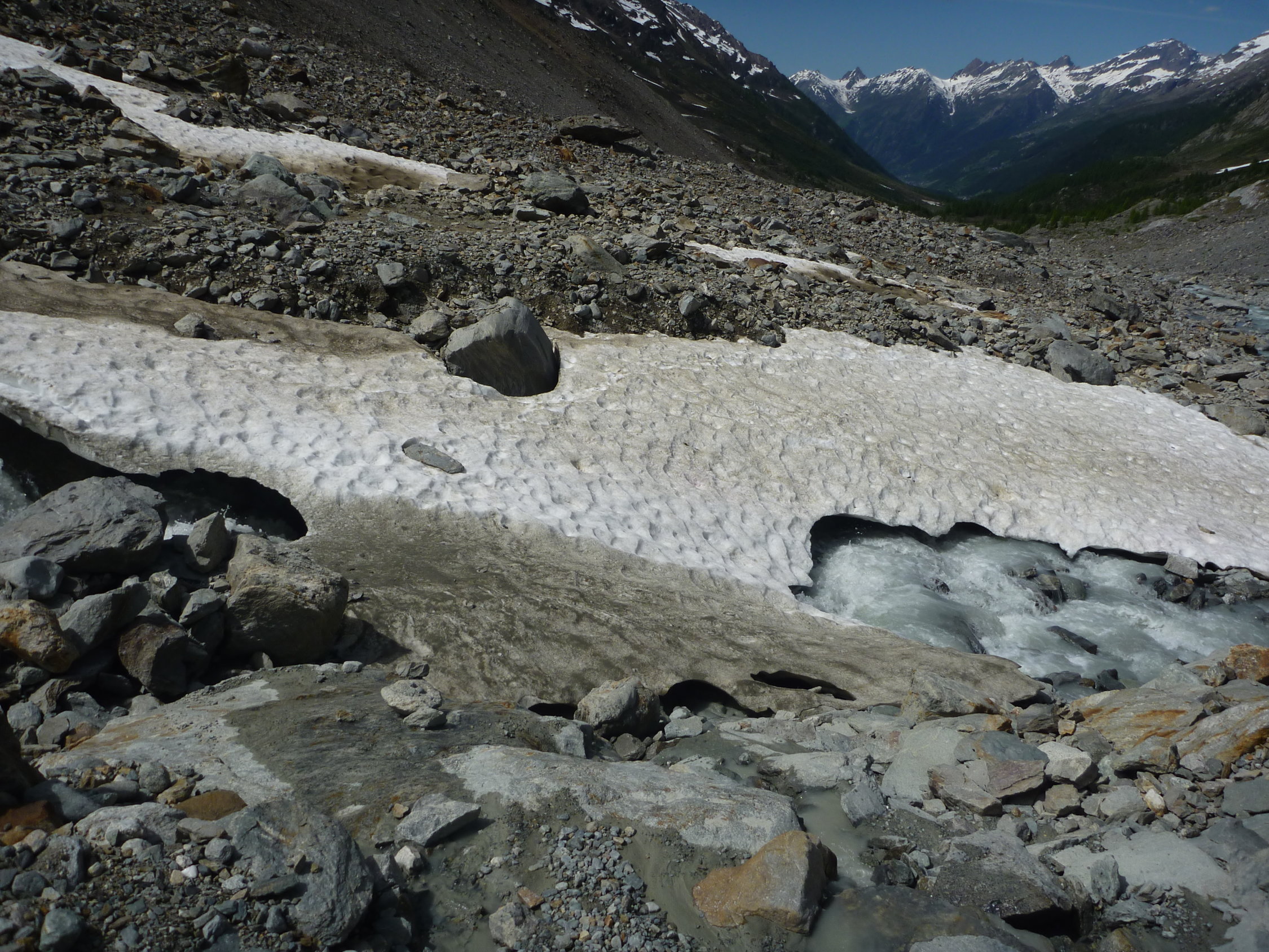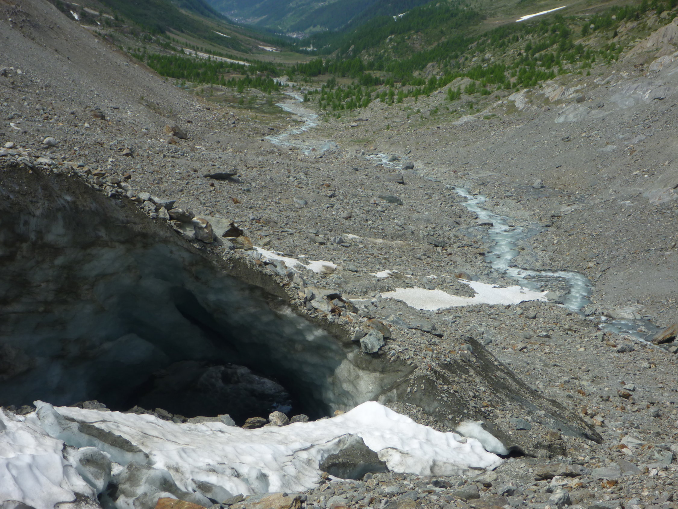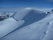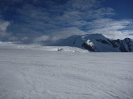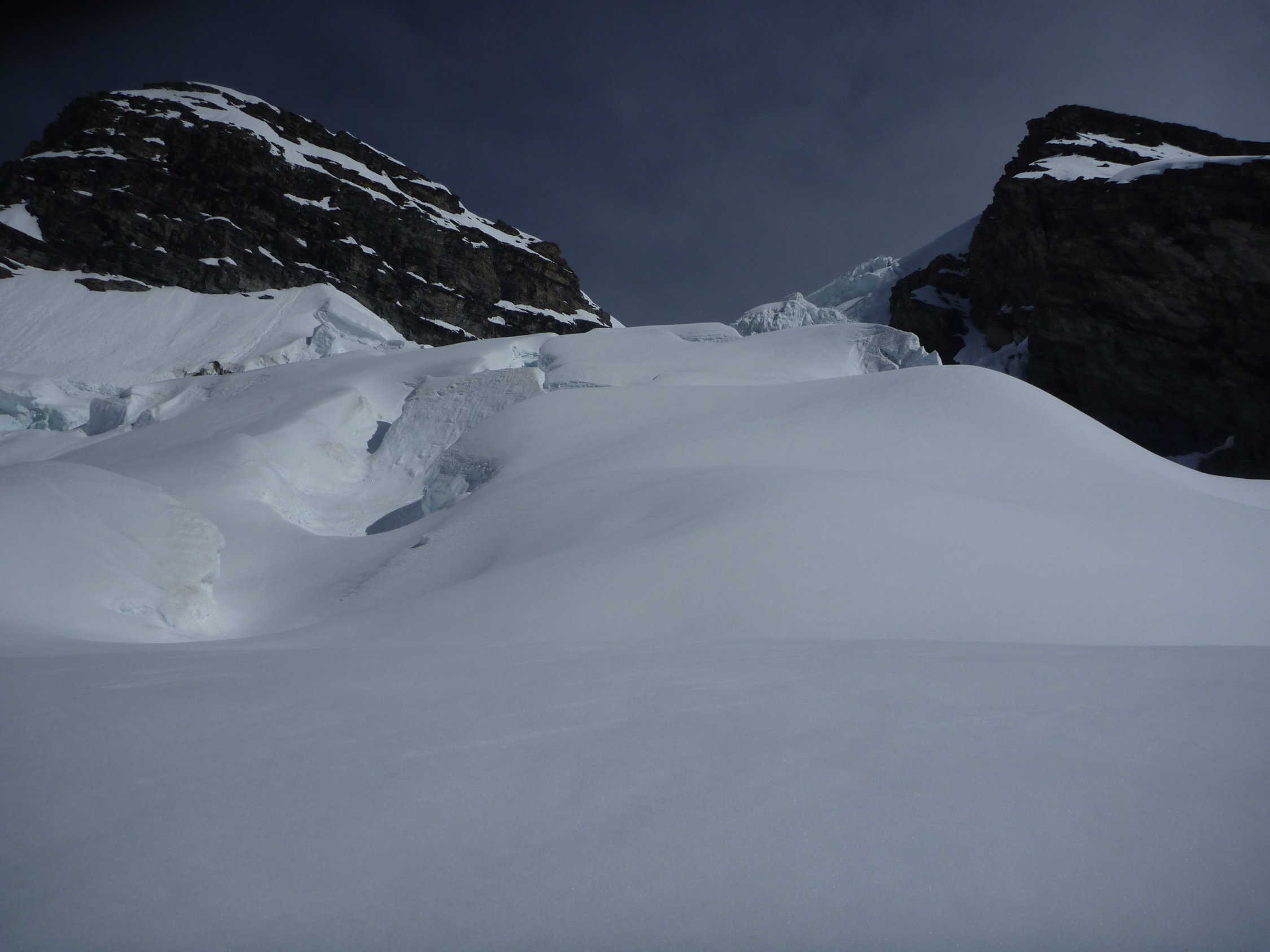 morgens noch Wolken am Grat; Gletscherbruch ziemlich mittig gut machbar; Schneeoberfläche wunderbar glatt und so auch hart gut fahrbar. Direkt zum Langgletscher noch sehr gut möglich. Auf dem Langgletscher Waschbrettschnee. Auf Schneeresten bis oberhalb Gletschertor und dann über Geröll (Steinmänner) unschwierig hinab. Schlüsselstelle ist das Überqueren des Gletscherbachs.