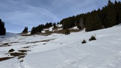 Gipfelhang muss man beim Hochlaufen (eher mühsam, weil unten zu wenig Schnee) gut anschauen, um bei der Abfahrt die Skis möglichst wenig zu tragen (siehe Foto). Ich musste 10m tragen und 20m mit über Schnee-Grass-Mischung fahren. Ansonsten um 15.00 Gipfelhang und runter bis zum Wanderweg nach Diggi perfekter Sulz.