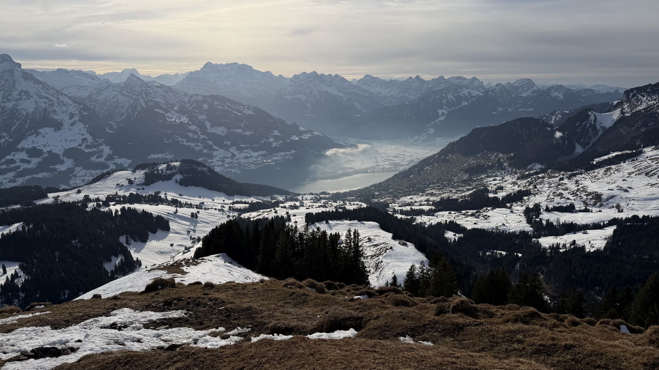 Runter nach Amden leider nicht aufgeweicht (oder evt mit den Schleierwolken ab 15.00 wieder gefroren), aber gut fahrbar und alles auf Ski bis PP (wenig über Gras).