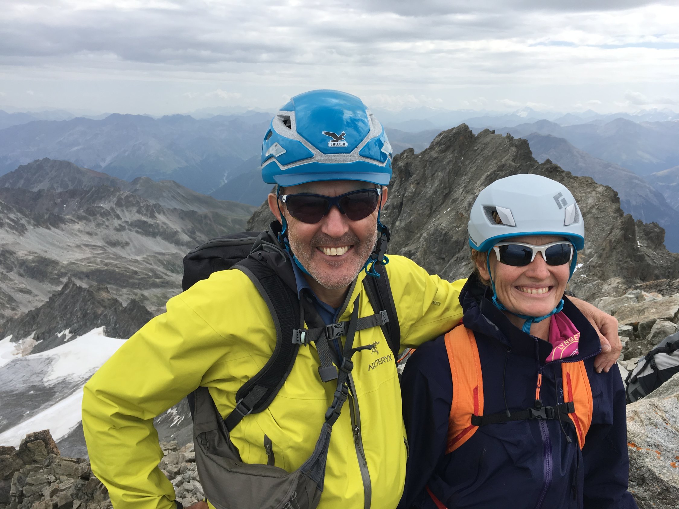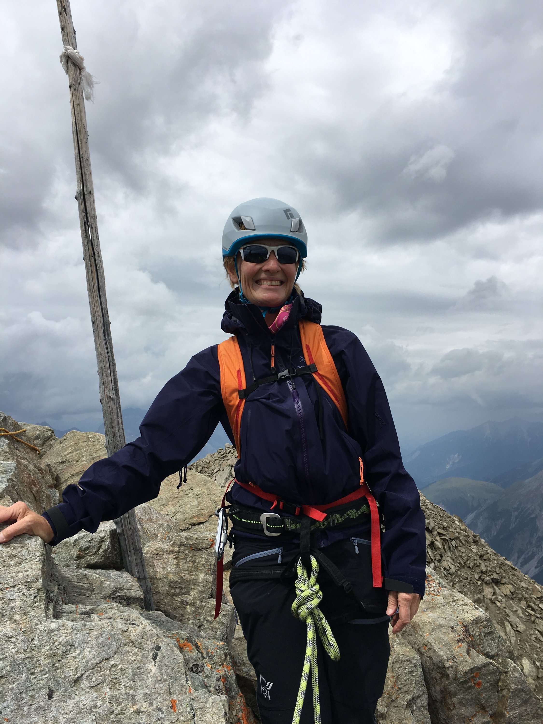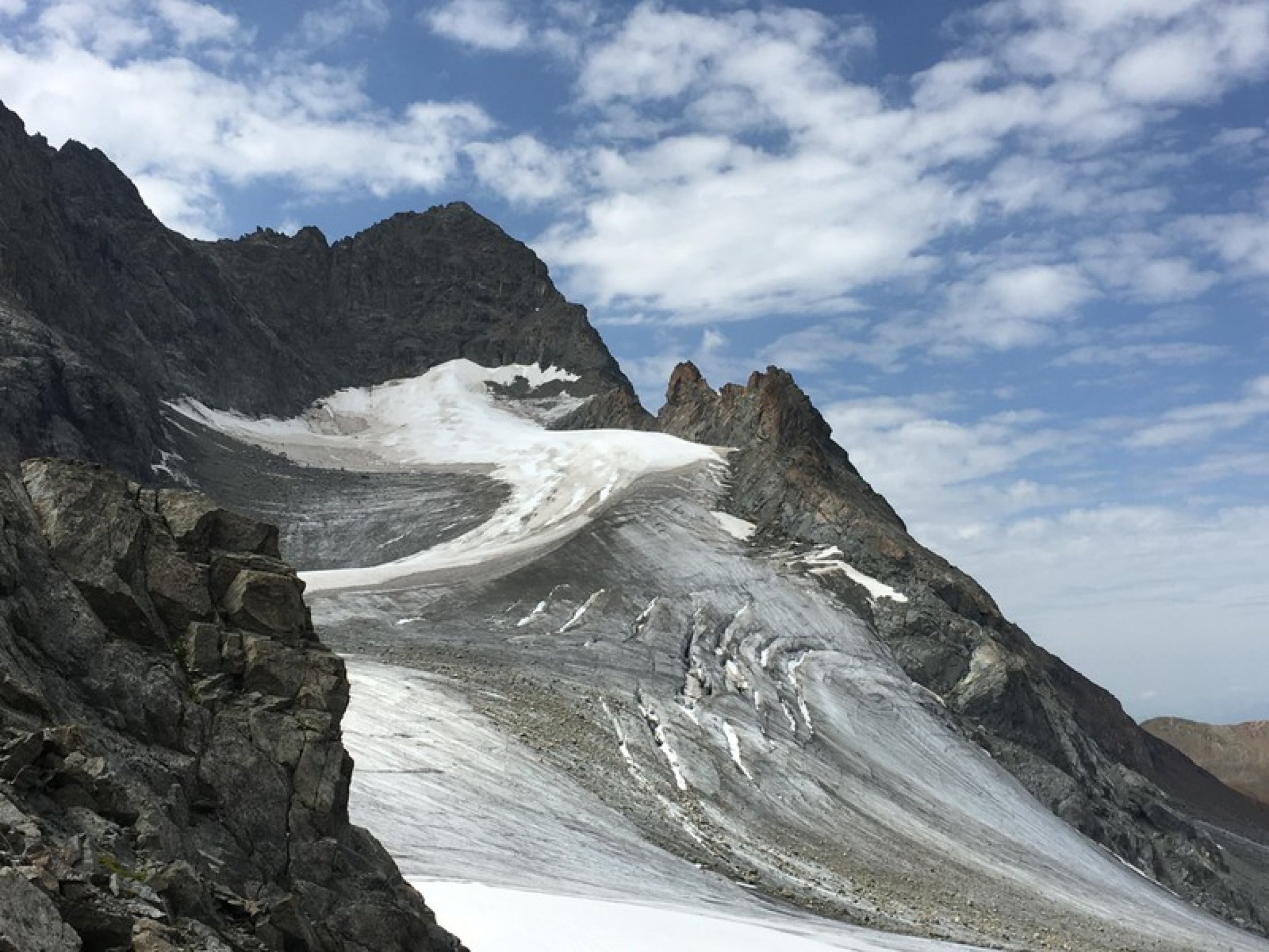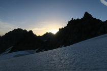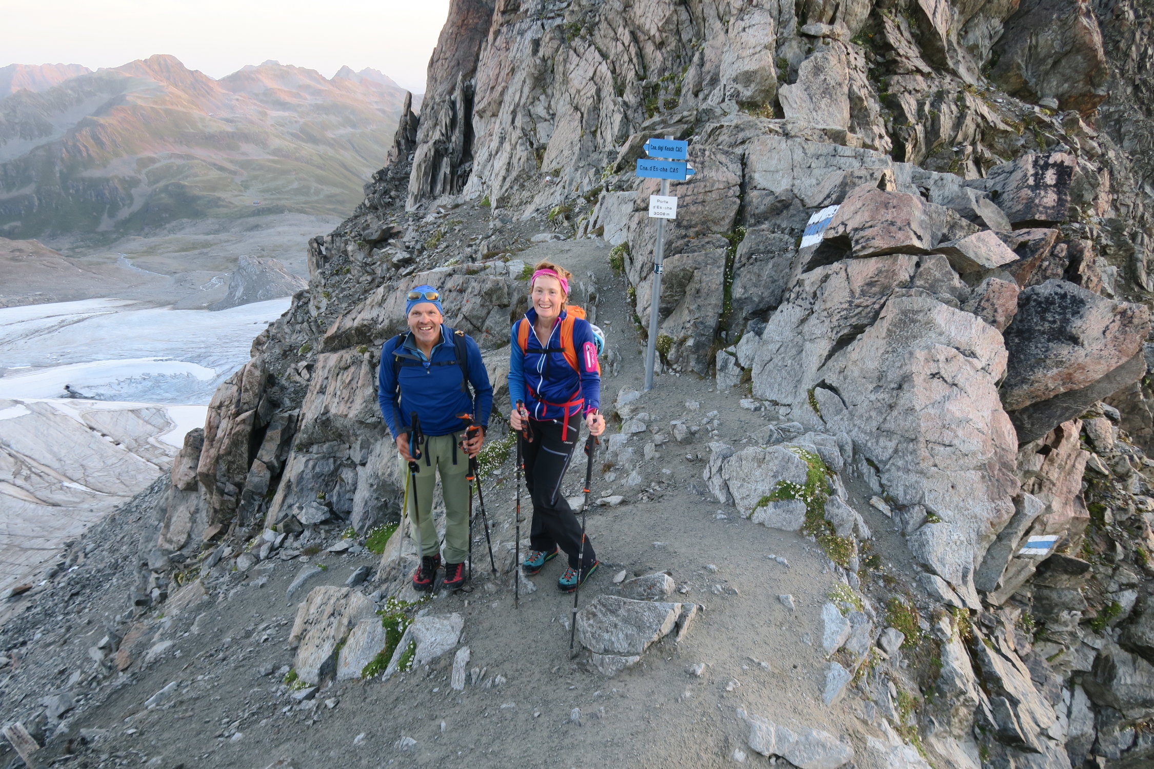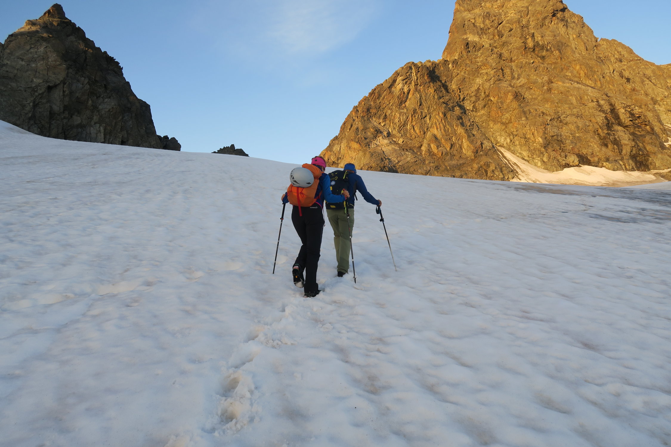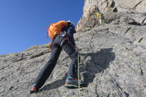 Steigeisen und Pickel nicht erforderlich. Route gut erkennbar. Gletscher fast aper. Einige Express und allenfalls Material für 1-2 Zwischensicherungen reichen.