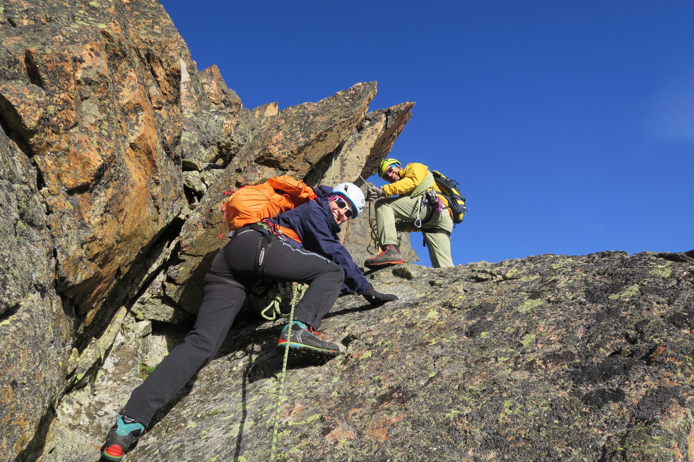 Wir waren froh, die Schlüsselstelle (5b) nicht im Vorstieg klettern zu müssen. Die anderen, eher schwierigen Stellen haben wir kaum wahrgenommen. Für die Schlüsselstelle können Kletterfinken hilfreich sein.