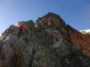 Fels am Eselsgrat trocken und schneefrei, anspruchsvollere Passagen sind mit Bohrhaken ausgestattet (III). Aufstieg zur Schneekuppe noch überwiegend Firn, einige Stellen bereits leicht eisig, durch vorhandene Trittspuren aber noch ganz gut zu begehen (ggf. Eisschrauben). Abstieg in die Scharte vor dem Hauptgipfel schon sehr weicher Schnee, in ausgeprägter Spur aber gut machbar. Sind dann gleich mit Steigeisen weitergeklettert zum Hauptgipfel (II, ausgesetzt, wenig Schnee).