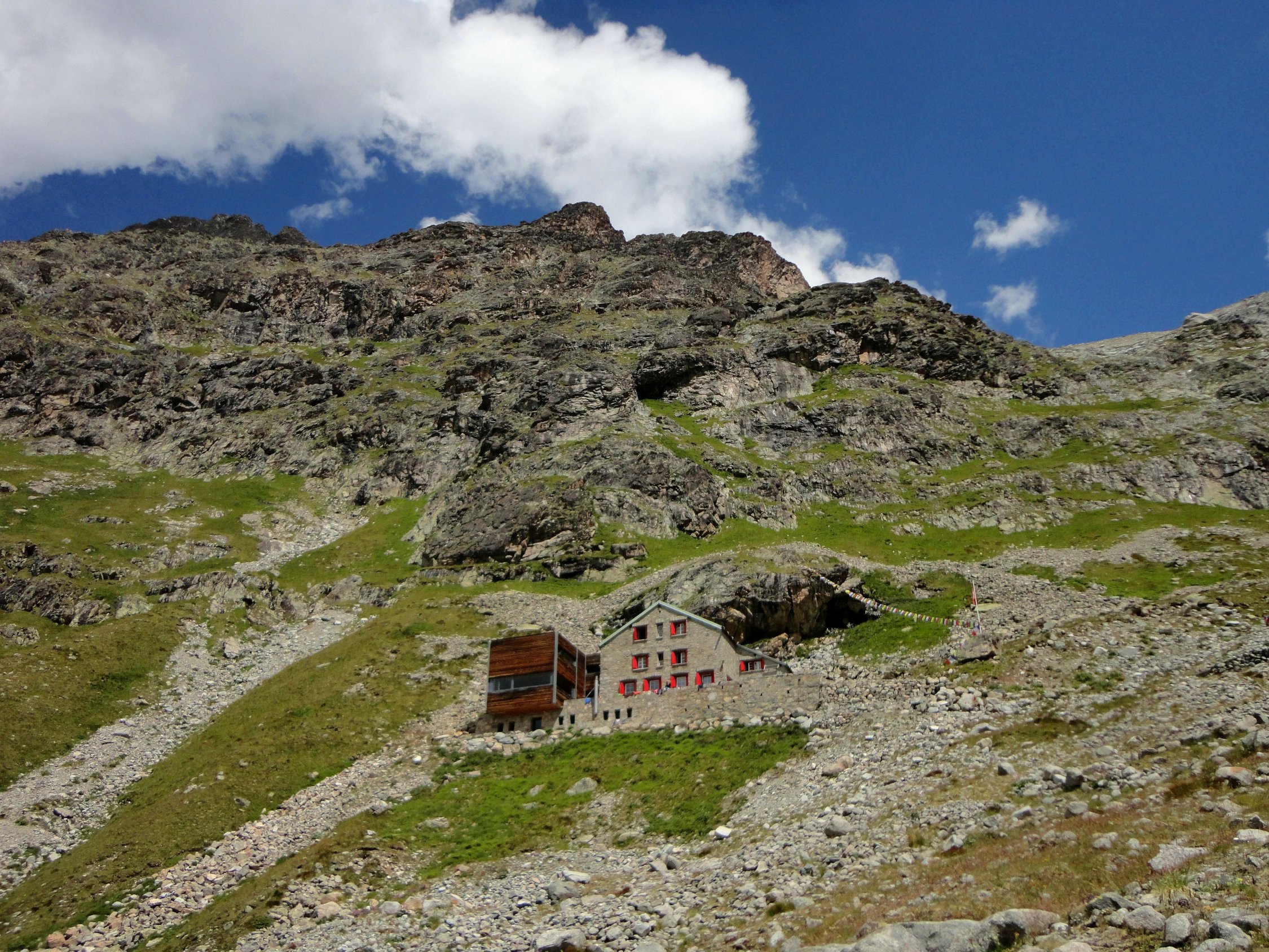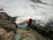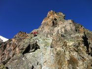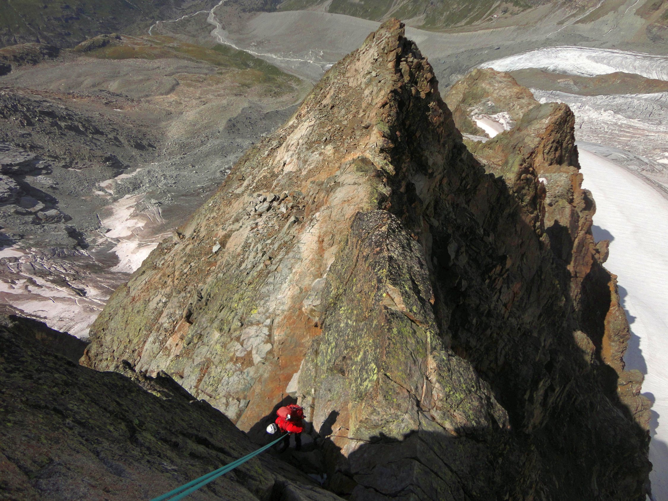 Für die Abseilpiste ist ein 50 m-Seil erforderlich, wir haben vorsichtshalber in der 3. sowie in der letzten Abseillänge die vorhandenen Zwischenringe genutzt. Die Landung am bzw. im Bergschrund ist etwas diffizil (vorher auf der Hütte nach den Verhältnissen erkundigen). Der Bergbach, der zwischen Hütte und Gletscher überquert wird und nachmittags recht viel Wasser führt, verschwindet 30 hm unterhalb des Weges im Untergrund und kann dort trockenen Fusses umgangen werden.
