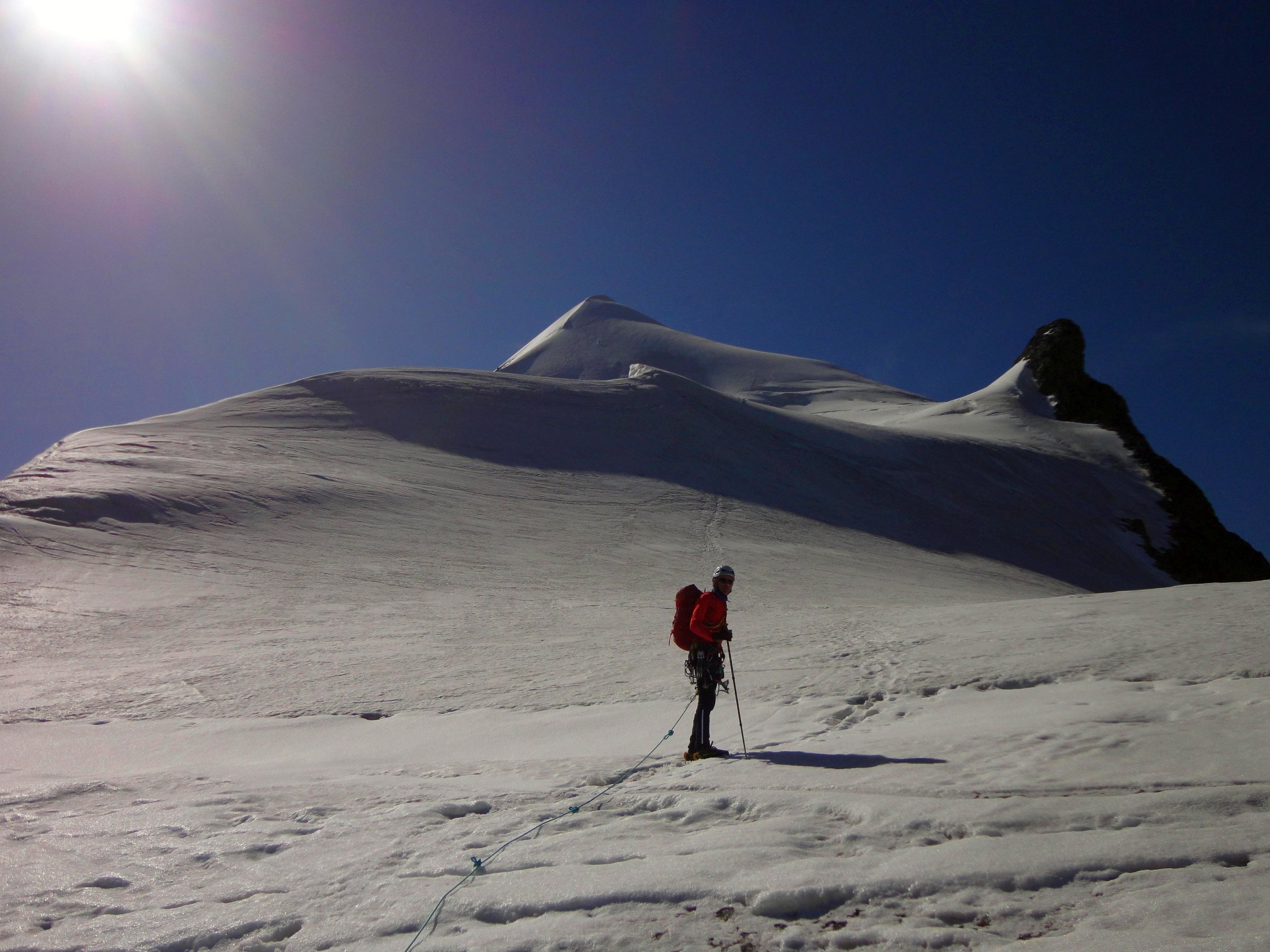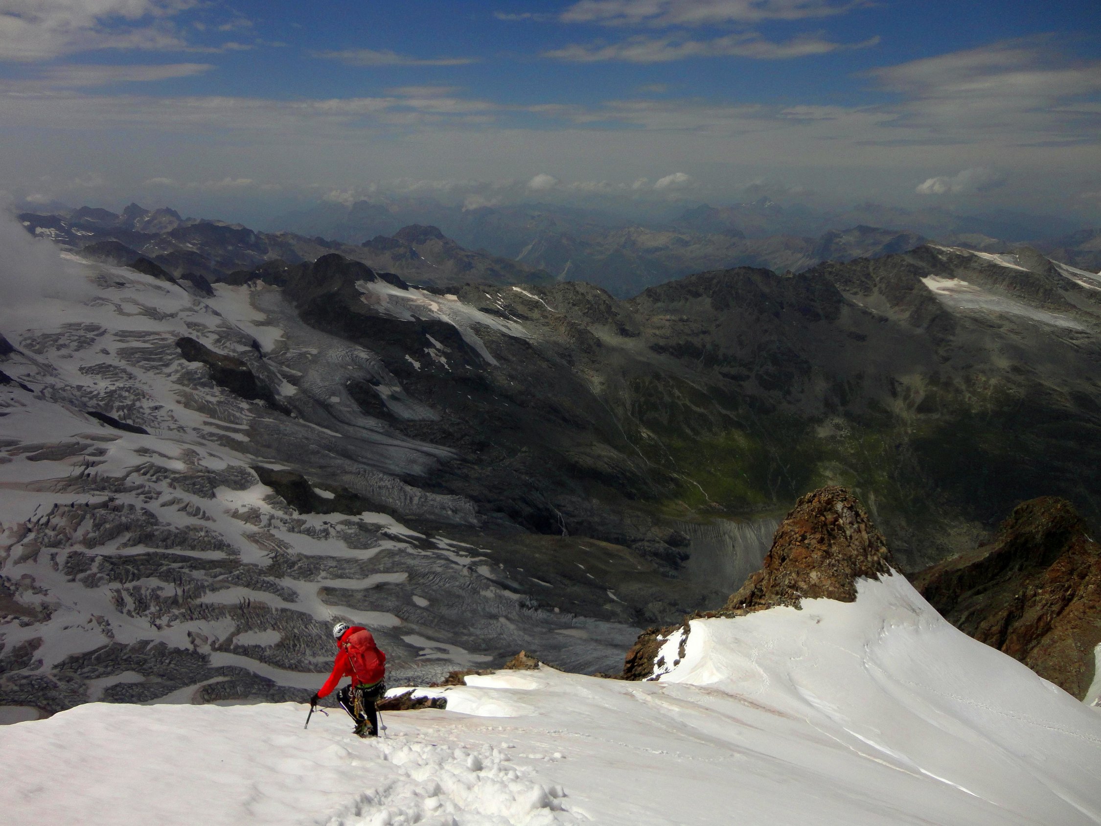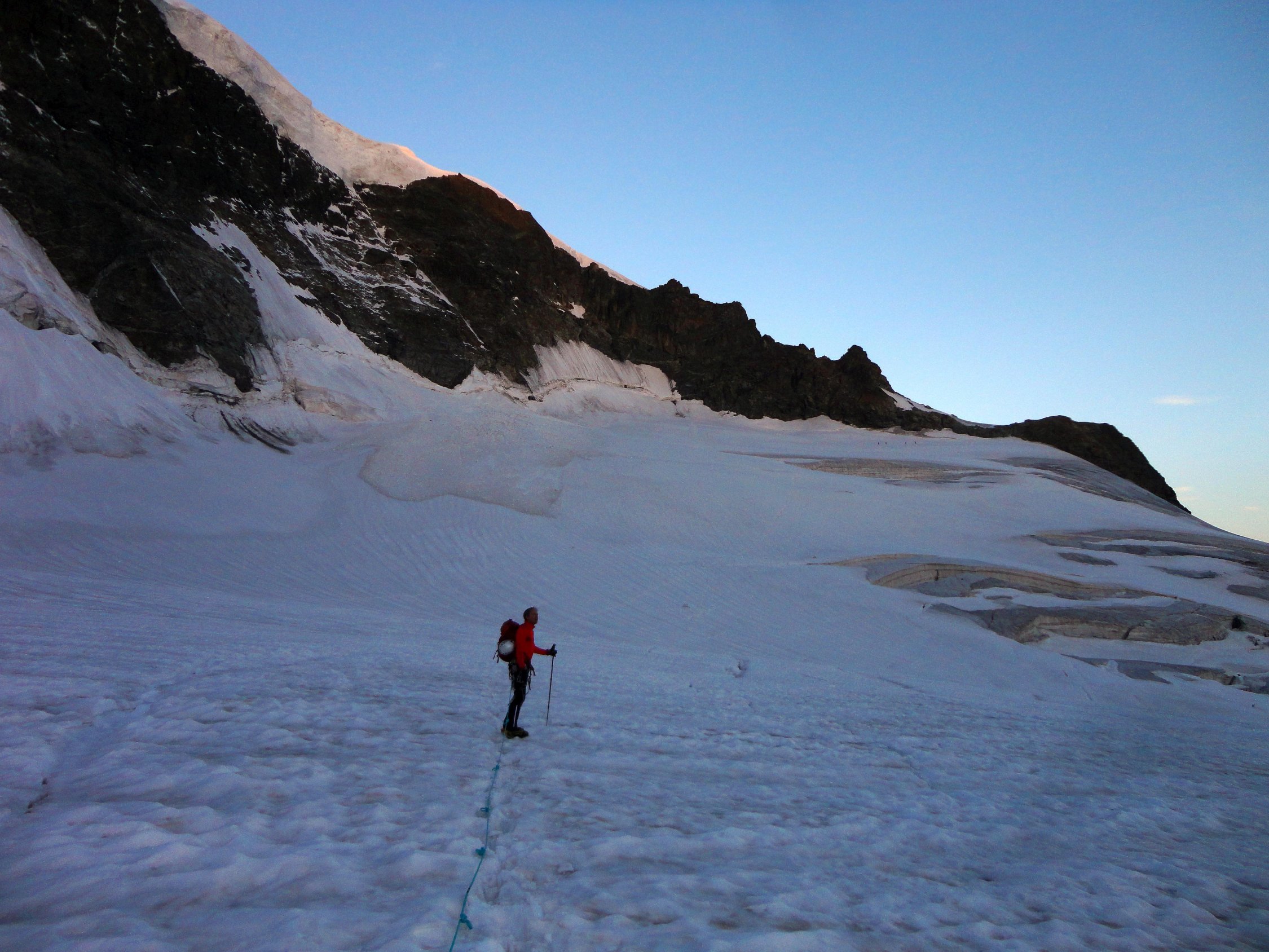 Firnaufstieg zur Schneekuppe wird bei weiterhin hohen Temperaturen vermutlich langsam eisiger, sonst gut.