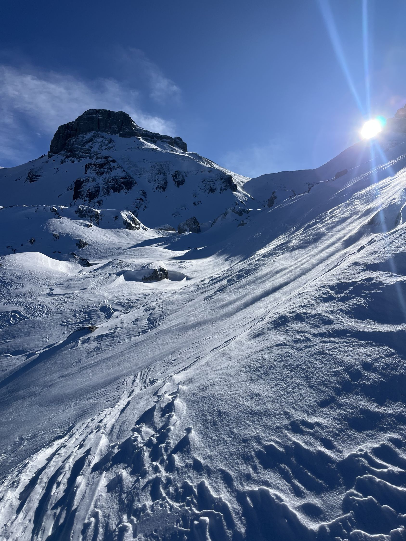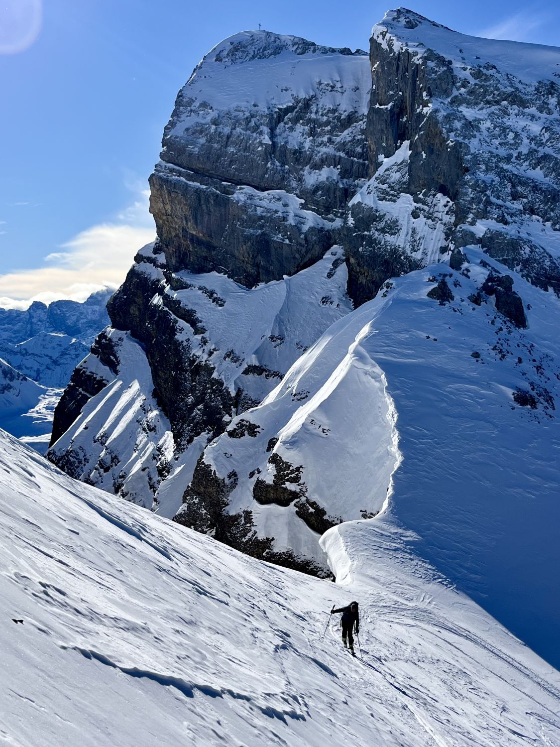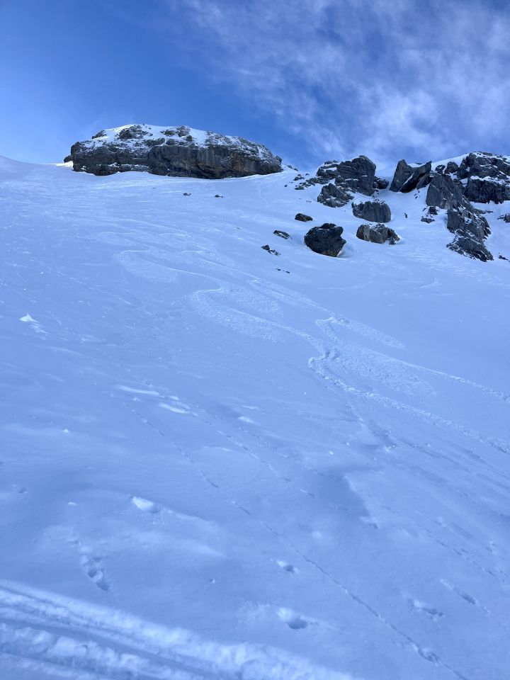 Abfahrt oben prima Pulver, dann eine Mischung von allem, teils pickelhart eisig, teils weiterer Pulver in Wald- und Schattenpartien, manchmal schnell wechselnd. Ohne Steinkontakt geht es aktuell klar nicht. Schnee hat es grundsätzlich bis unten nach Muotathal, zwei drei Passagen sind aber aper oder sehr schwer fahrbar. Alles in allem eine super Tour heute und die Überschreitung auch landschaftlich einmalig.
