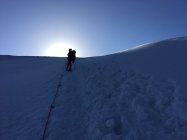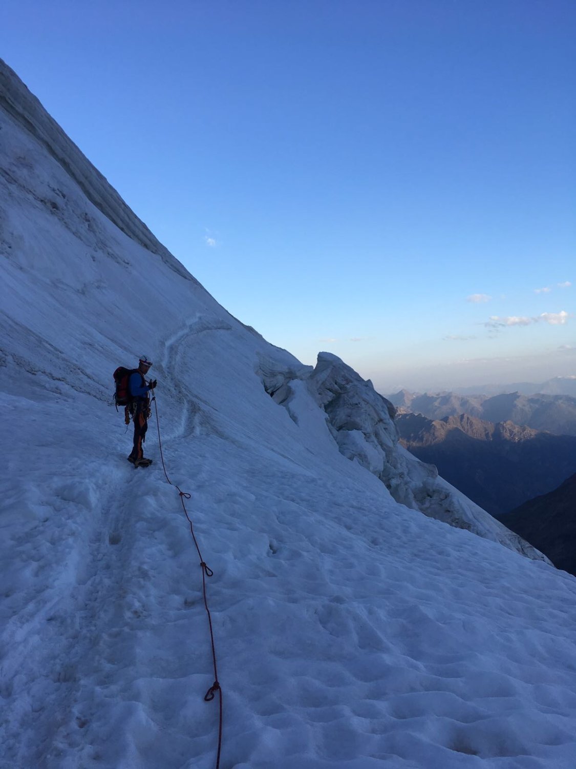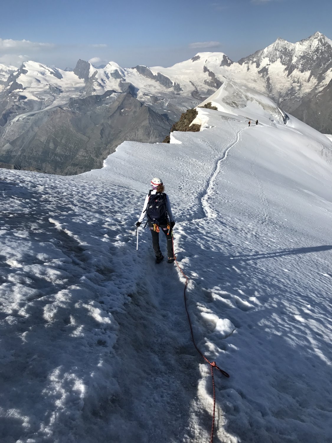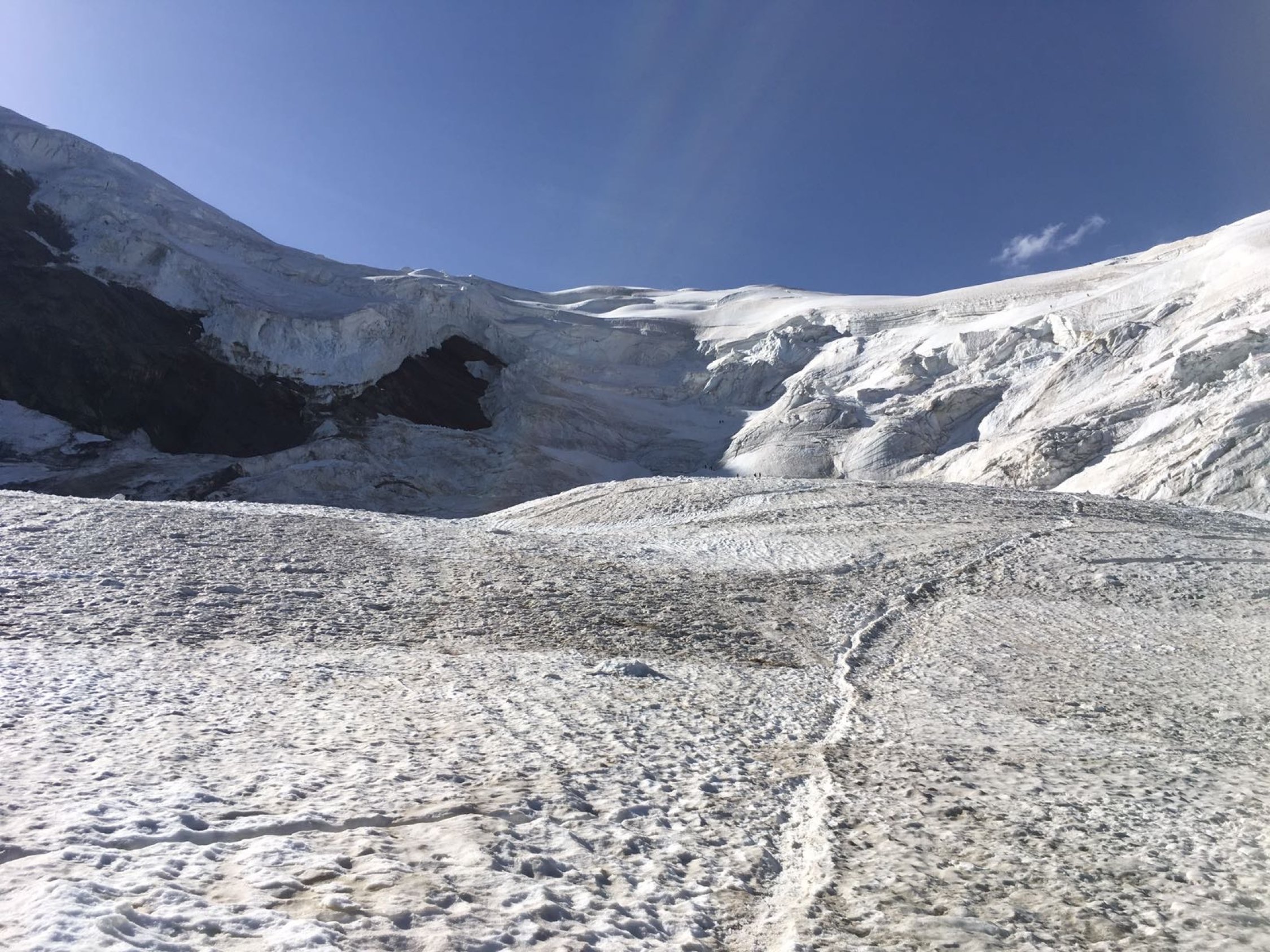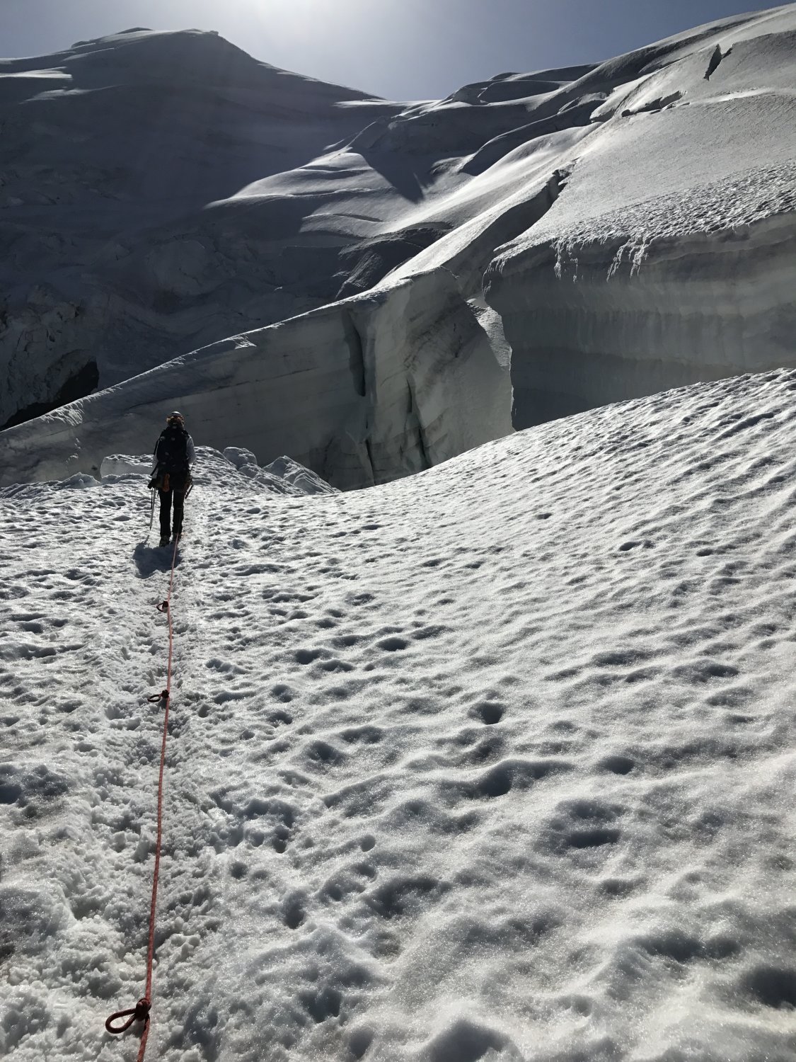 Wir sind um 05:30 beim Bergrestaurant Hohsaas, bei angenehmen Temperaturen und leichtem Wind, losgelaufen. Der ganze Aufstieg ist gut gespurt (teilweise fast ausgelatscht weil viele auch nachmittags unterwegs sind und der Schnee dann weich ist) und der Schnee ist am frühen morgen fast überall trittfest. Wer früh geht, hat sehr gute Verhältnisse, wobei gewisse Spaltenbrücken bei diesen warmen Temperaturen neu beurteilt oder die Spalten an einer anderen Stelle überschritten werden müssen. Die Schlüsselstelle ist gut begehbar, wenig Blankeis, gute Spur.