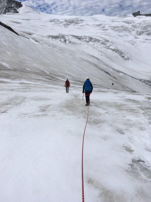 Sehr gute Verhältnisse (etwas bewölkt, dafür gute Temperatur) im trockenen Fels. Gut machbar mit weniger erfahrenen, aber trittsicheren Bergsteiger. Wir sind über den Gletscher abgestiegen, hier muss, wegen der Spalten, ein grösserer Bogen gemacht werden. Die Spalten sind aber gut sichtbar und unproblematisch.