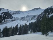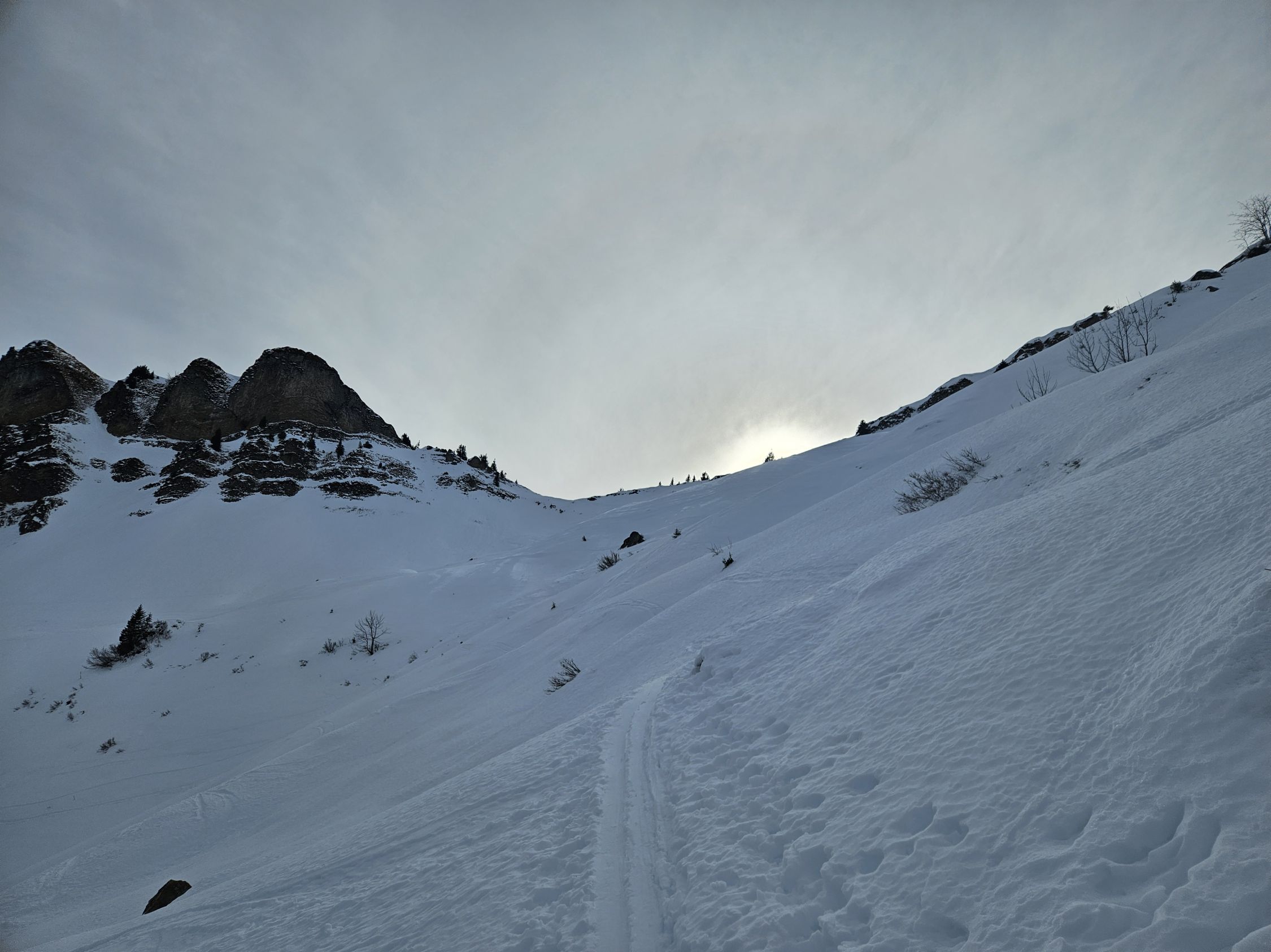 Die Spur ist zum Teil hart, aber ohne Harscheisen gehbar. Der Waldriegel zur Oberen Falzalpe hinunter hat keinen Schnee mehr. Den Gipfelgrat haben wir lieber zu Fuss gemacht, kann man aber auch noch mit Ski schaffen.
