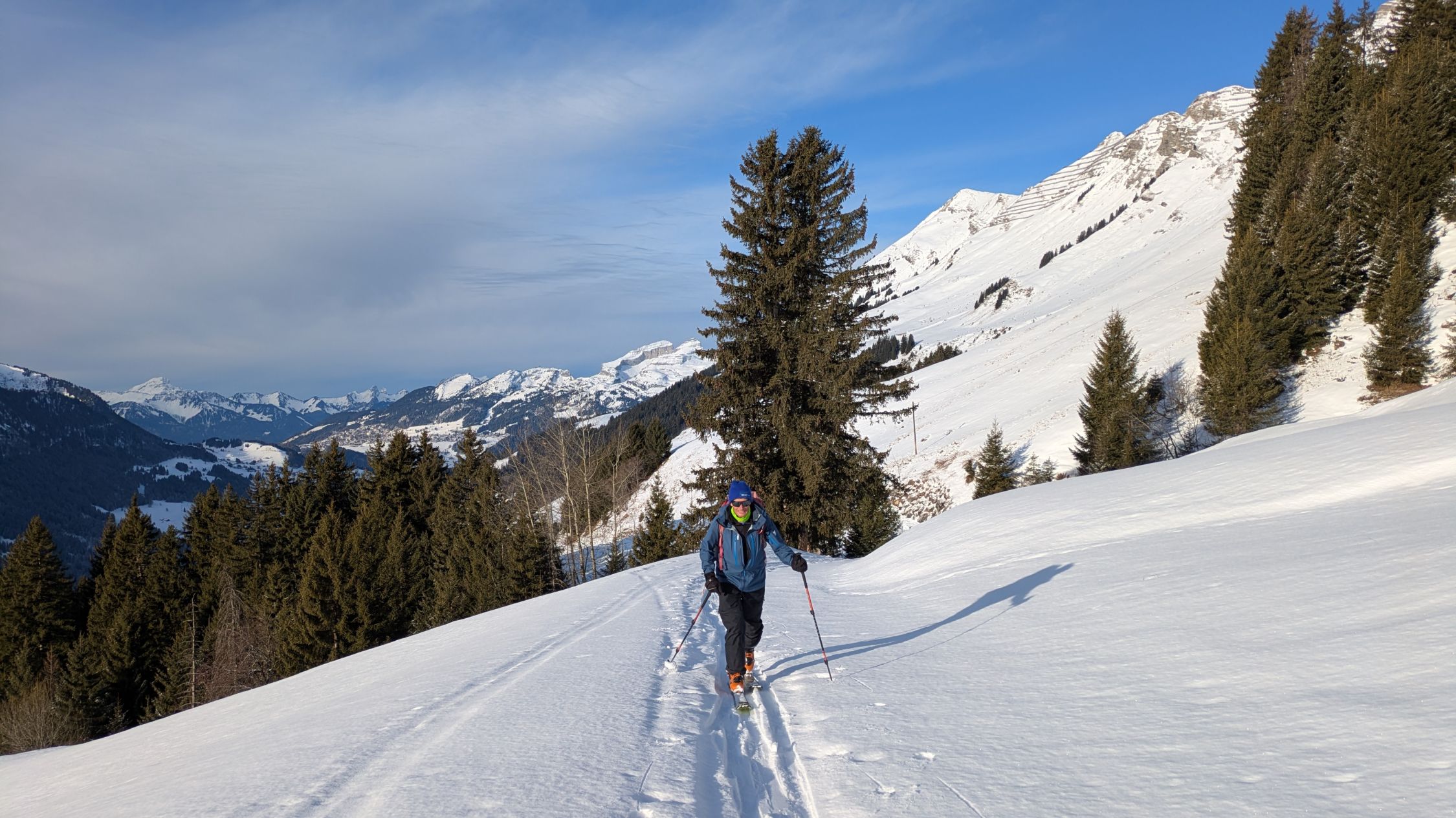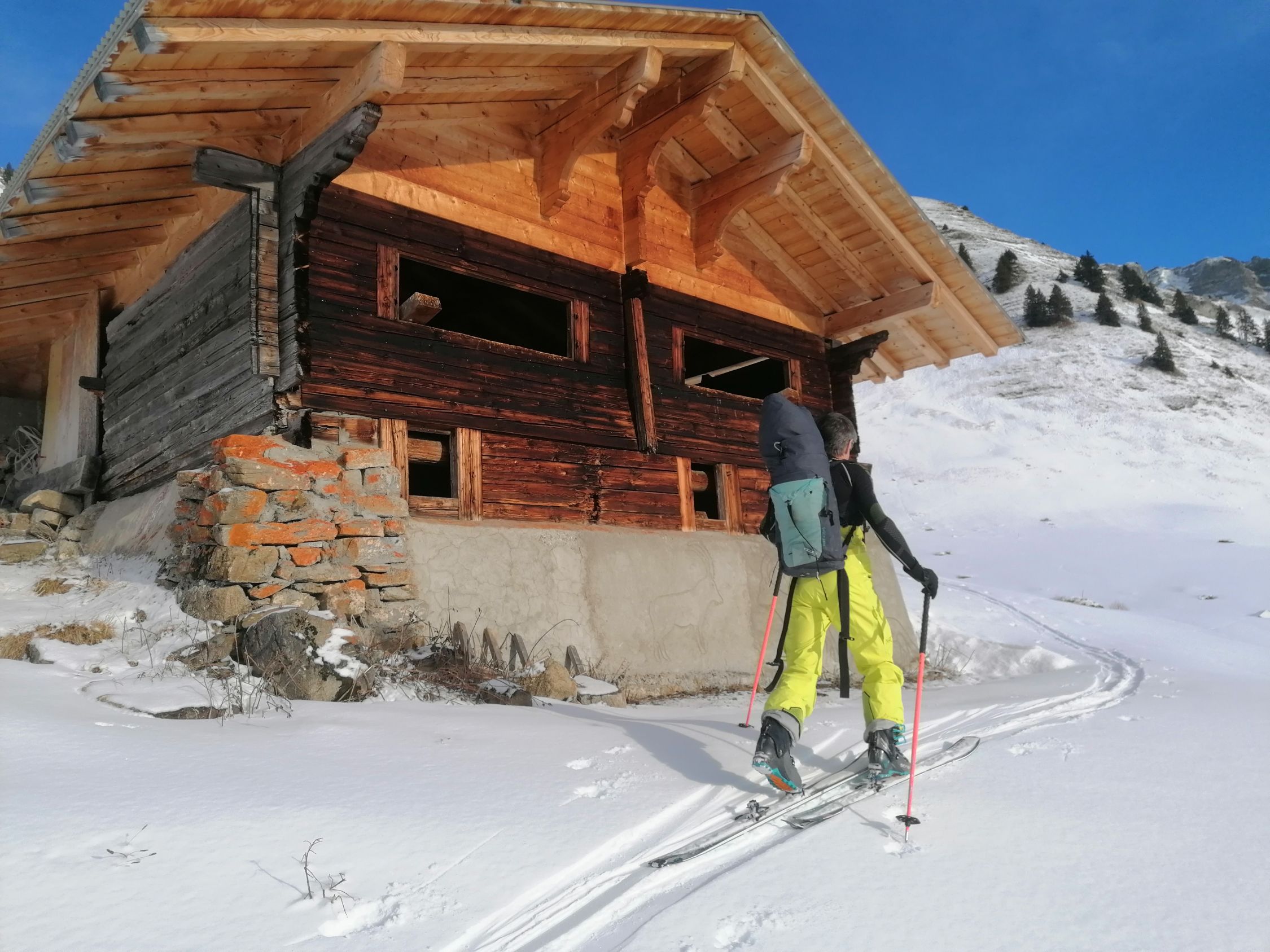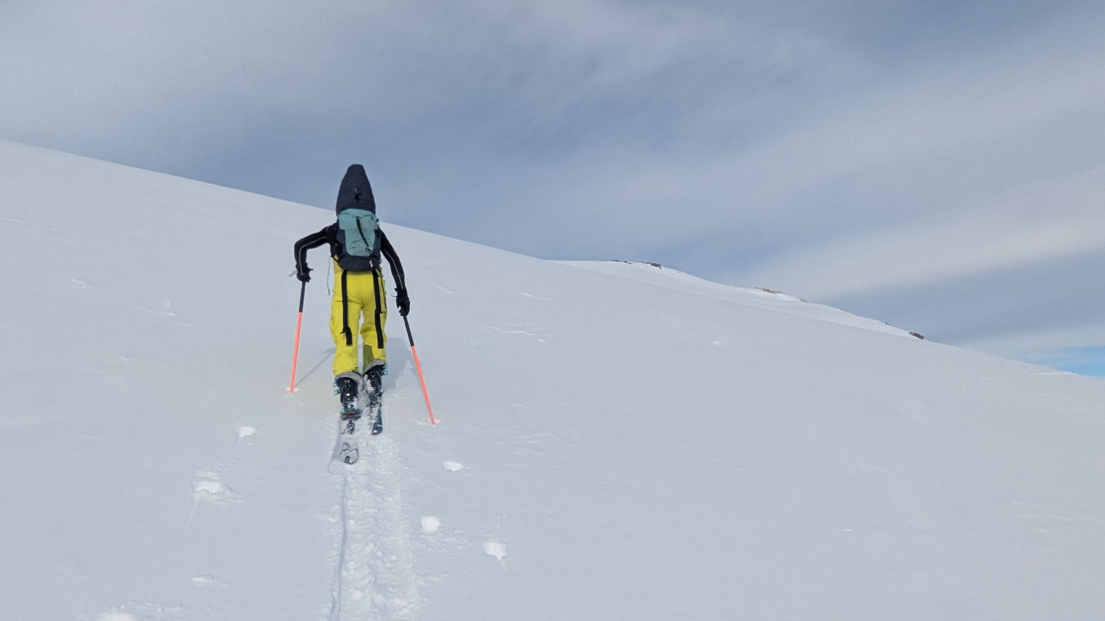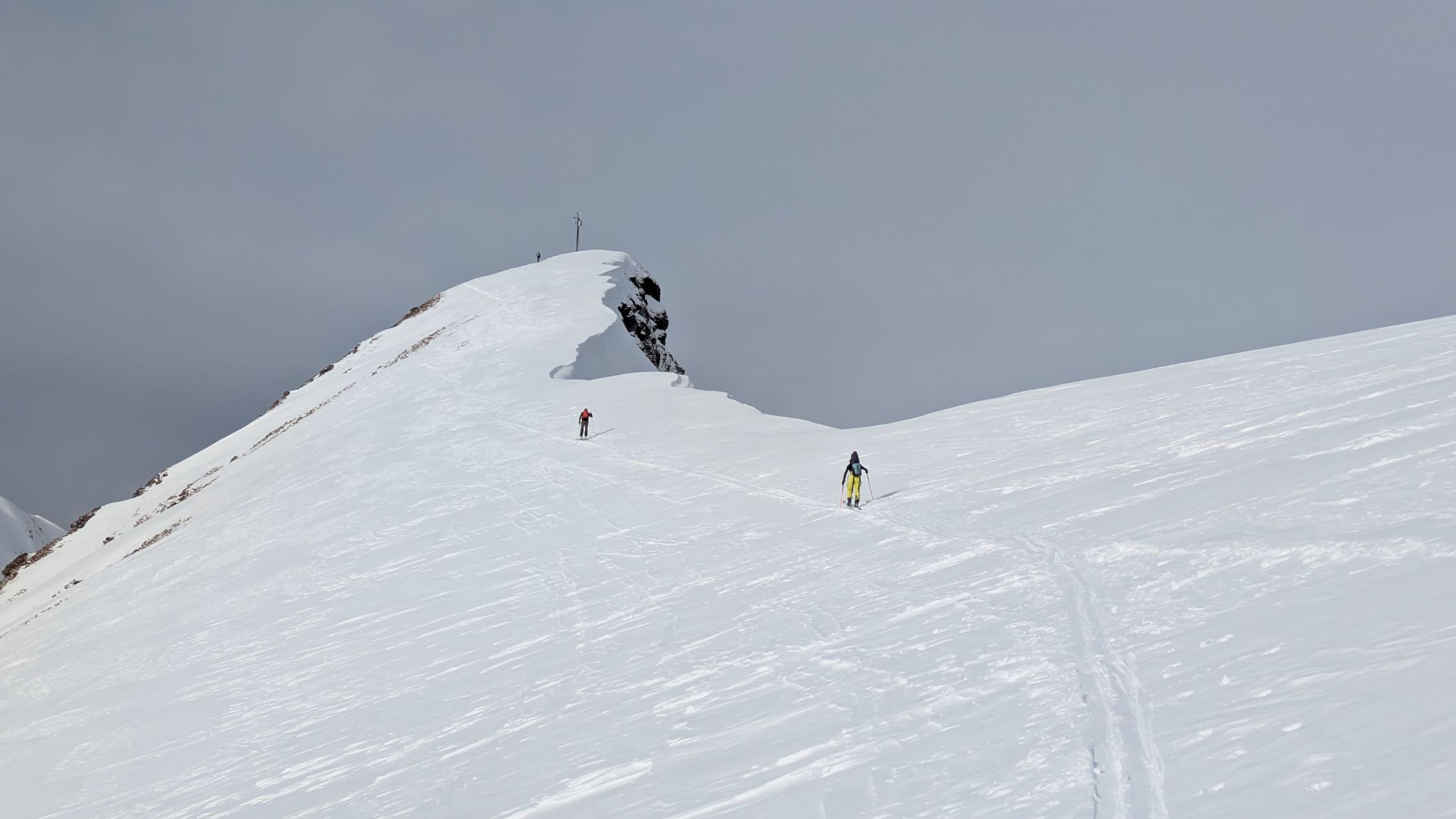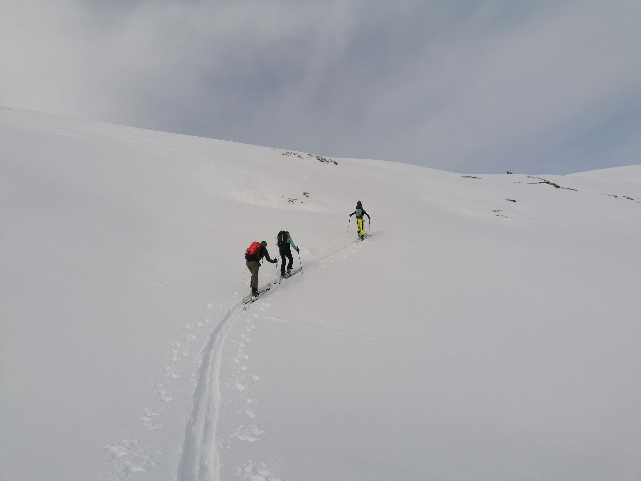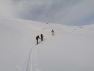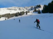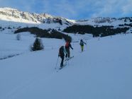 Ausgezeichnet. D.h. Wetter gut, mit hoher Bewölkung. Schneeverhältnisse: Es hatte in der Nacht 5cm bis 10cm Neuschnee gegeben. Die Unterlage war tragend. Kurz: Genail zum Aufstieg, und zur Abfahrt.
