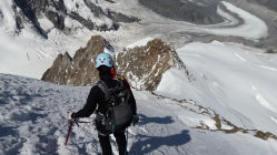 Felsgrat trocken, wenngleich das Umgehungscouloir schwach eisig ist. Der Firnteil ist trotz der hohen Temperaturen noch gut beinander und nur stellenweise etwas eisig. Gletscher bis 4000 m in den Morgenstunden kaum gefroren und Brücken äußerst instabil. Der Bruch am Anfang ist gerade in der Nacht aufgrund der Orientierung schwierig zu durchqueren, sprich Sucherei.