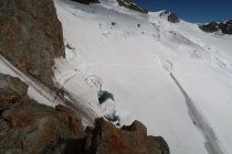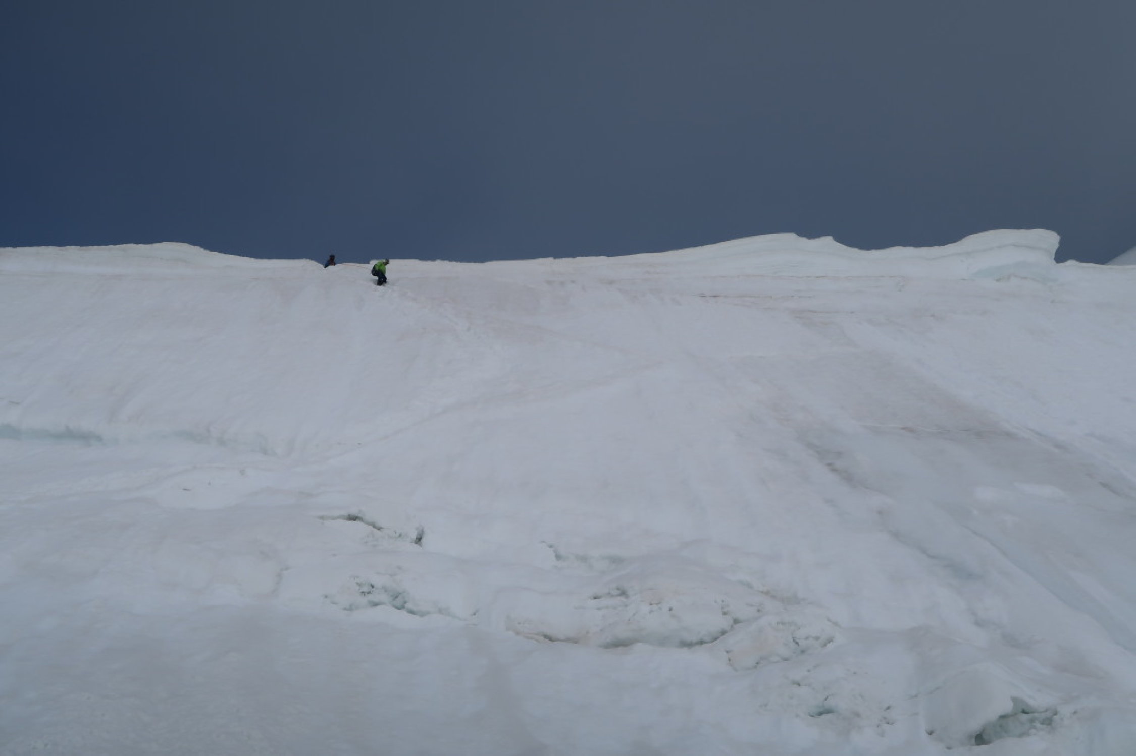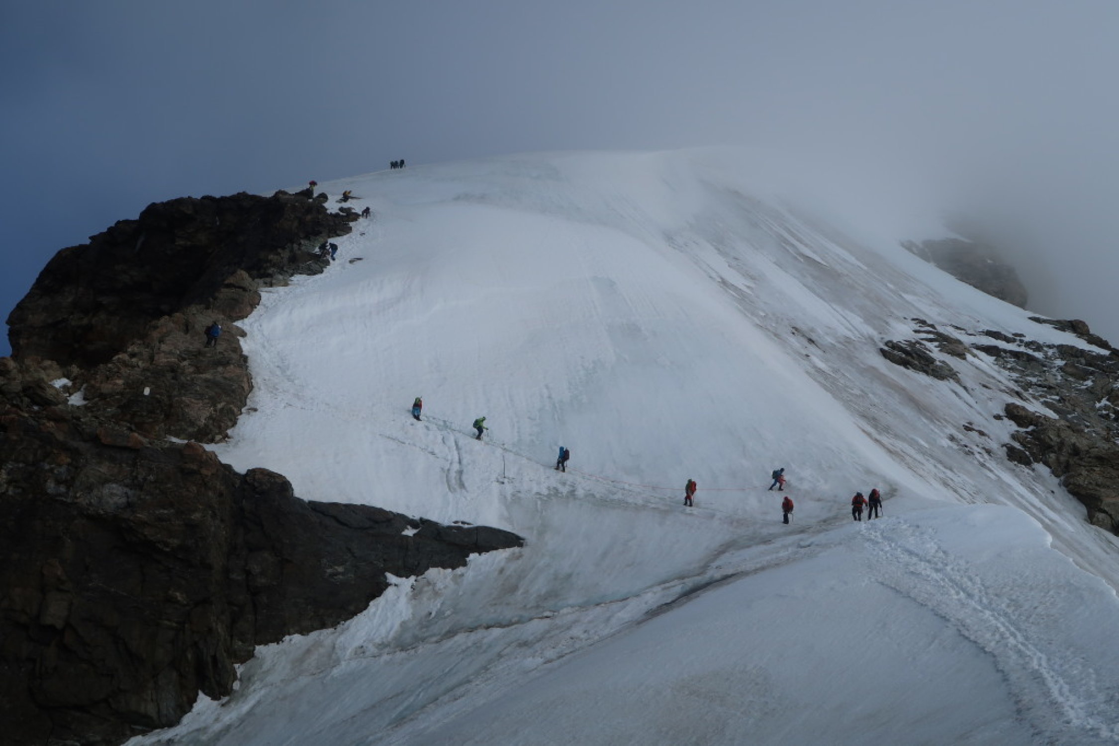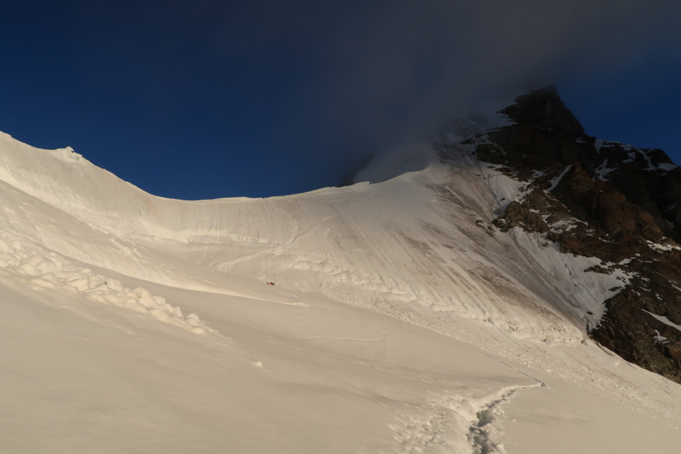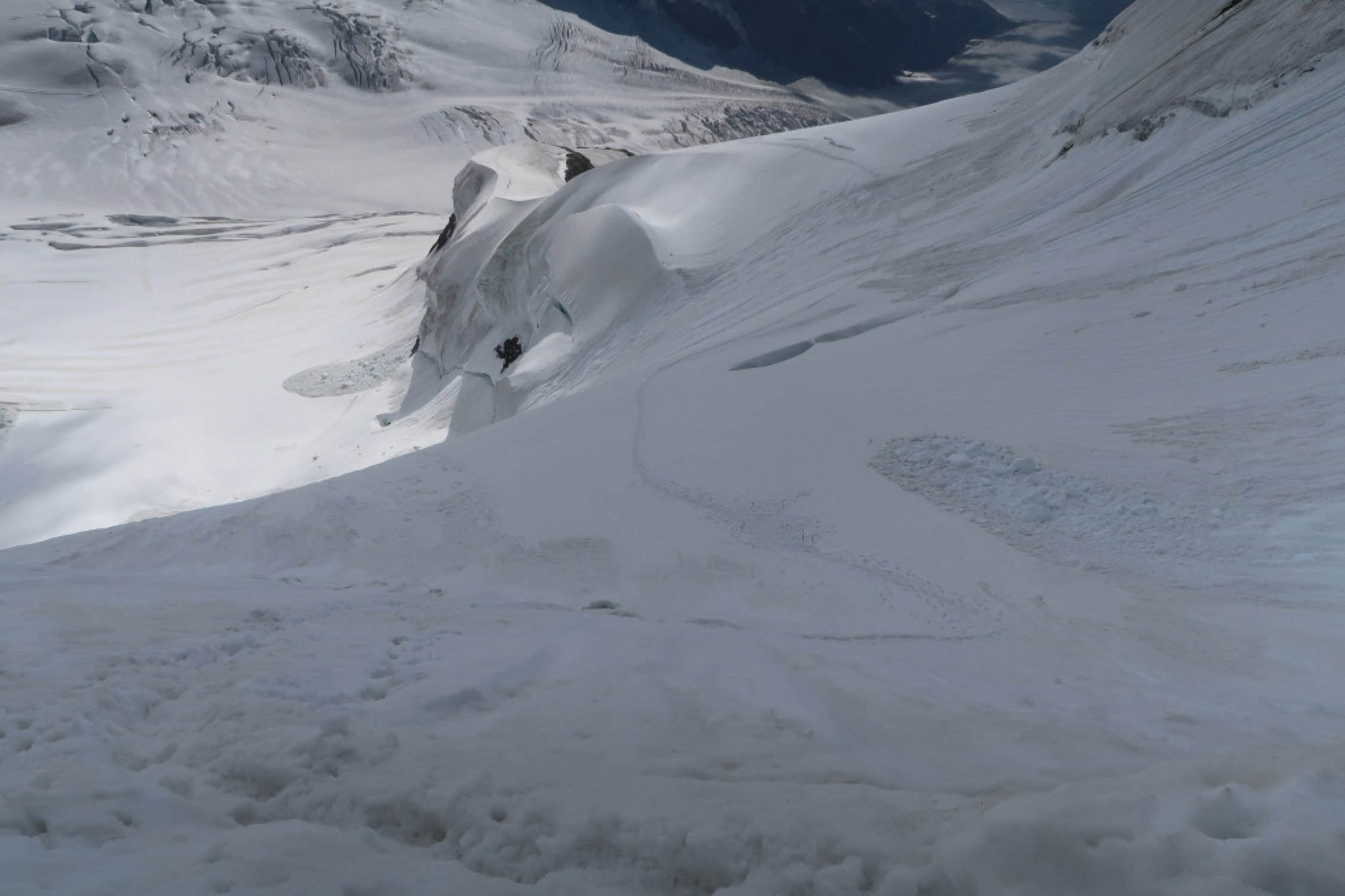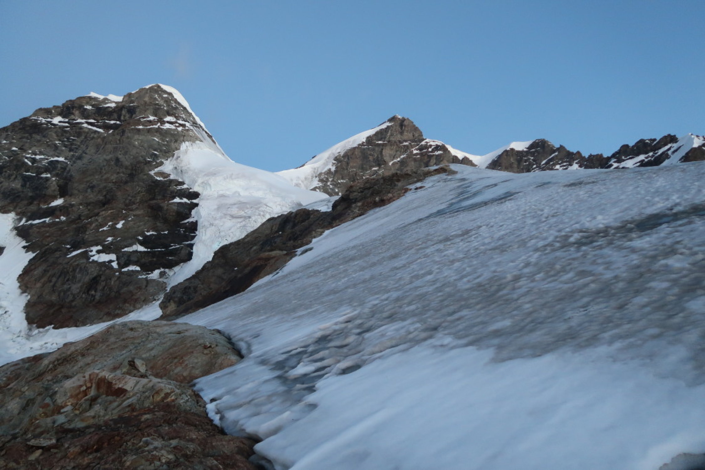 Der Wegverlauf bis zum Rottalsattel ist sehr gut. Einige Spalten sind sichtbar und noch gut zu überqueren. Der Bergschrund beim Rottalsattel ist (noch)sehr gut zu überwinden. Vor der ersten Sicherungsstange ist eine Blankeisstelle vorhanden, welche etwas unbequem aber mit der nötigen Vorsicht noch gut zu begehen ist. Im weiteren Aufstieg sind weitere Blankeisstellen vorhanden.