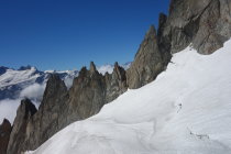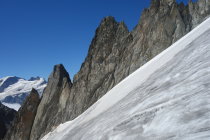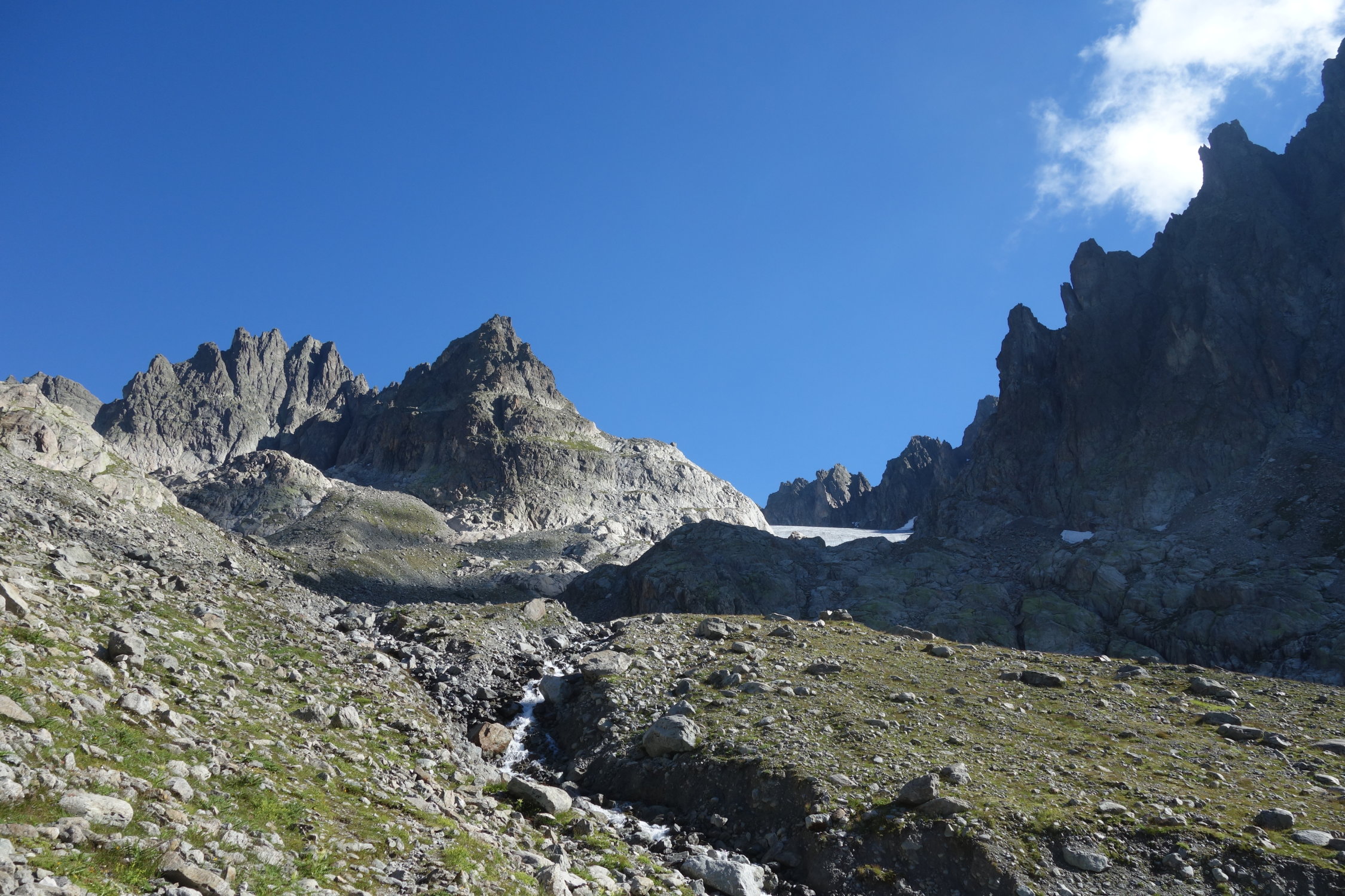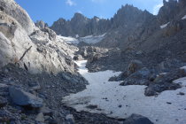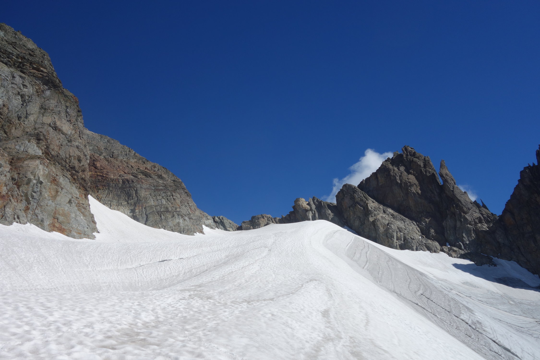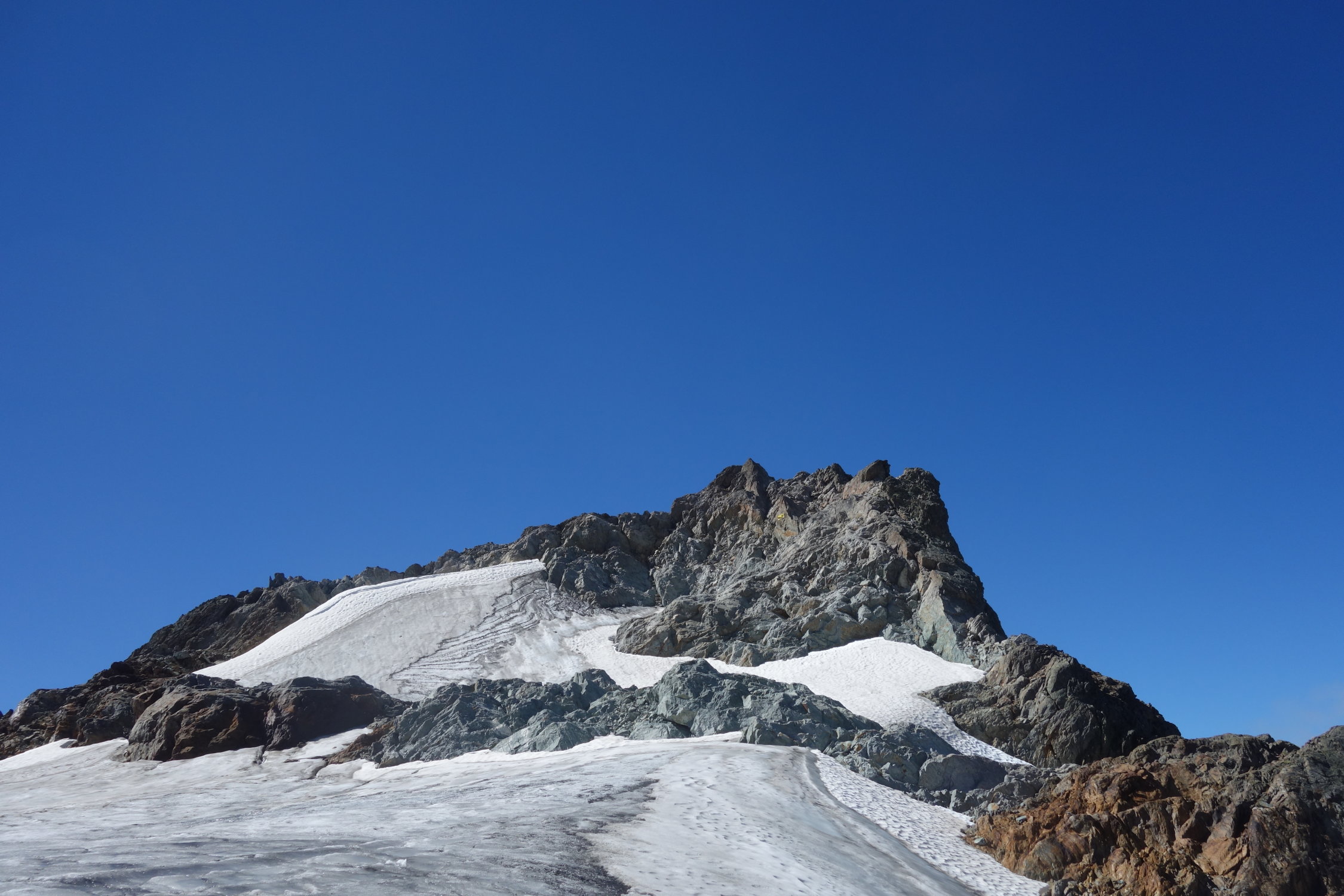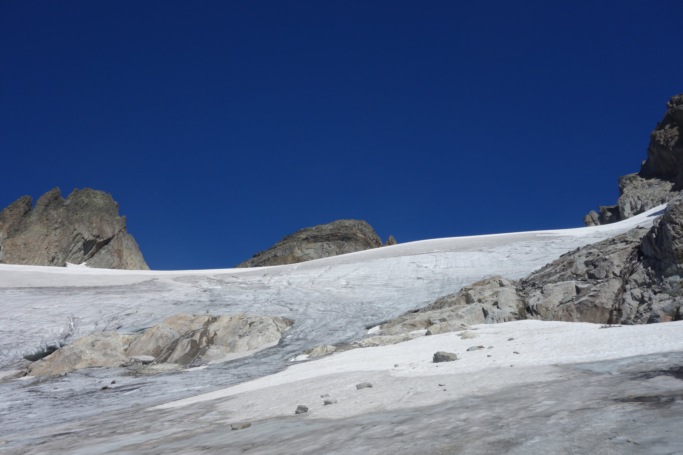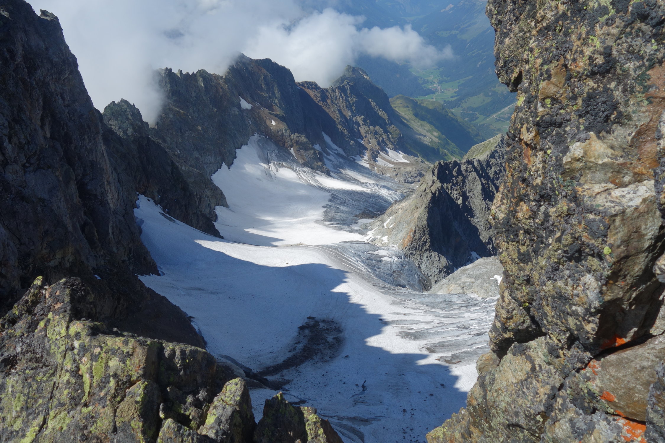 Gute Verhältnisse, Aufstieg noch fast alles im Schatten, Wegfindung bis Abzweigung rechts Richtung Gletscher sehr gut, danach den Weg des geringsten Widerstandes suchend bis zum Gletscheranfang. Steigeisen montiert und erste Steilstufe hinauf, anschl. flacher werdend bis zur Felsinsel in der Mitte der steilen Schlussflanke. ACHTUNG! Wenn noch Schnee liegt Abrutschgefahr, heute kein Problem, nur die letzten ca. 50m im Schnee, Rest alles aper. Nach 2.Steilstufe dann hinüber zum Obertaljoch. Wahnsinn wie der Gletscher wieder an Höhe verloren hat, recht mühsame ca. 10m mit Steigeisen...links wäre es besser gegangen, dann noch auf den Gipfel. Herrliches Panorama und keine Menschenseele weit und breit!