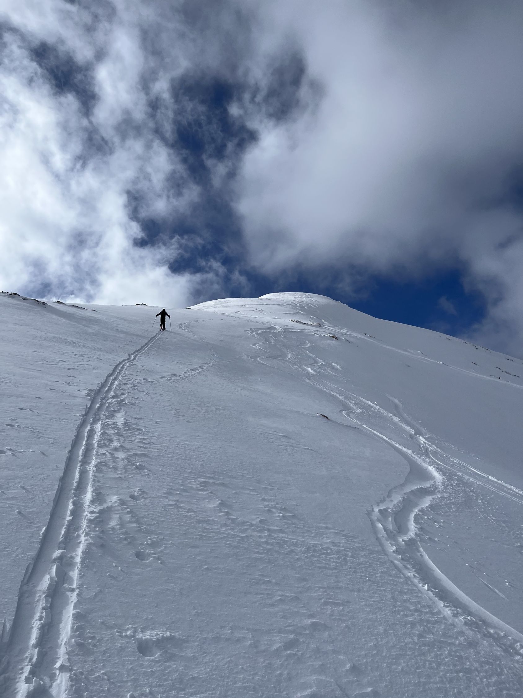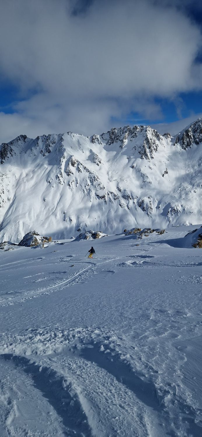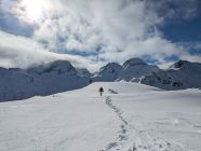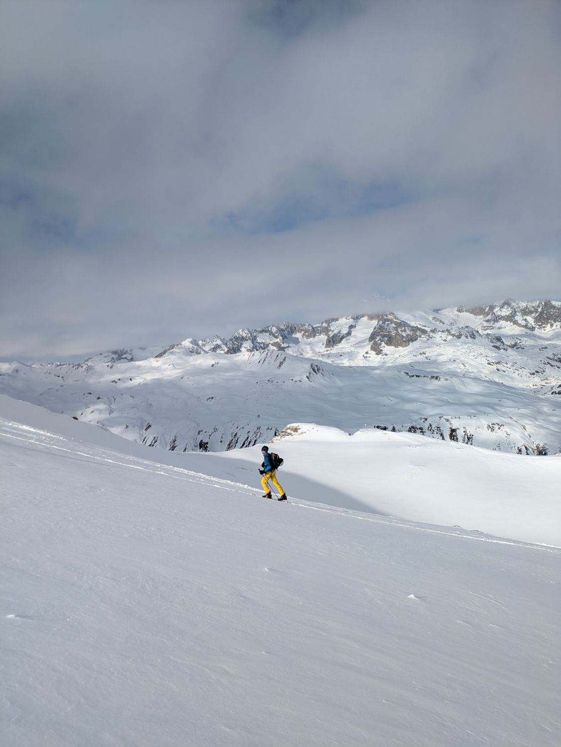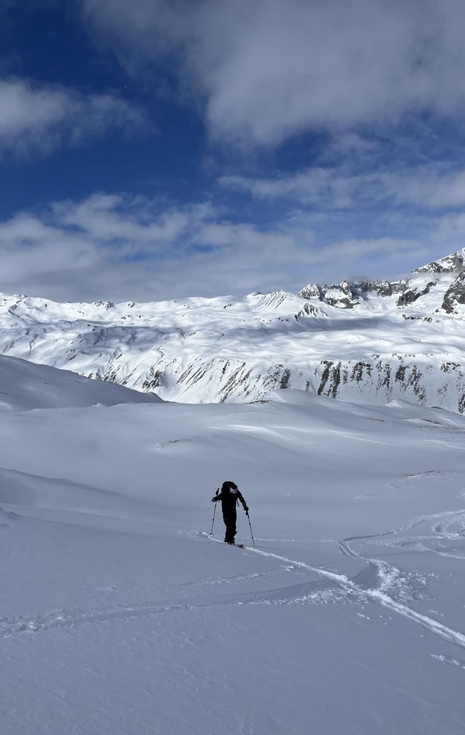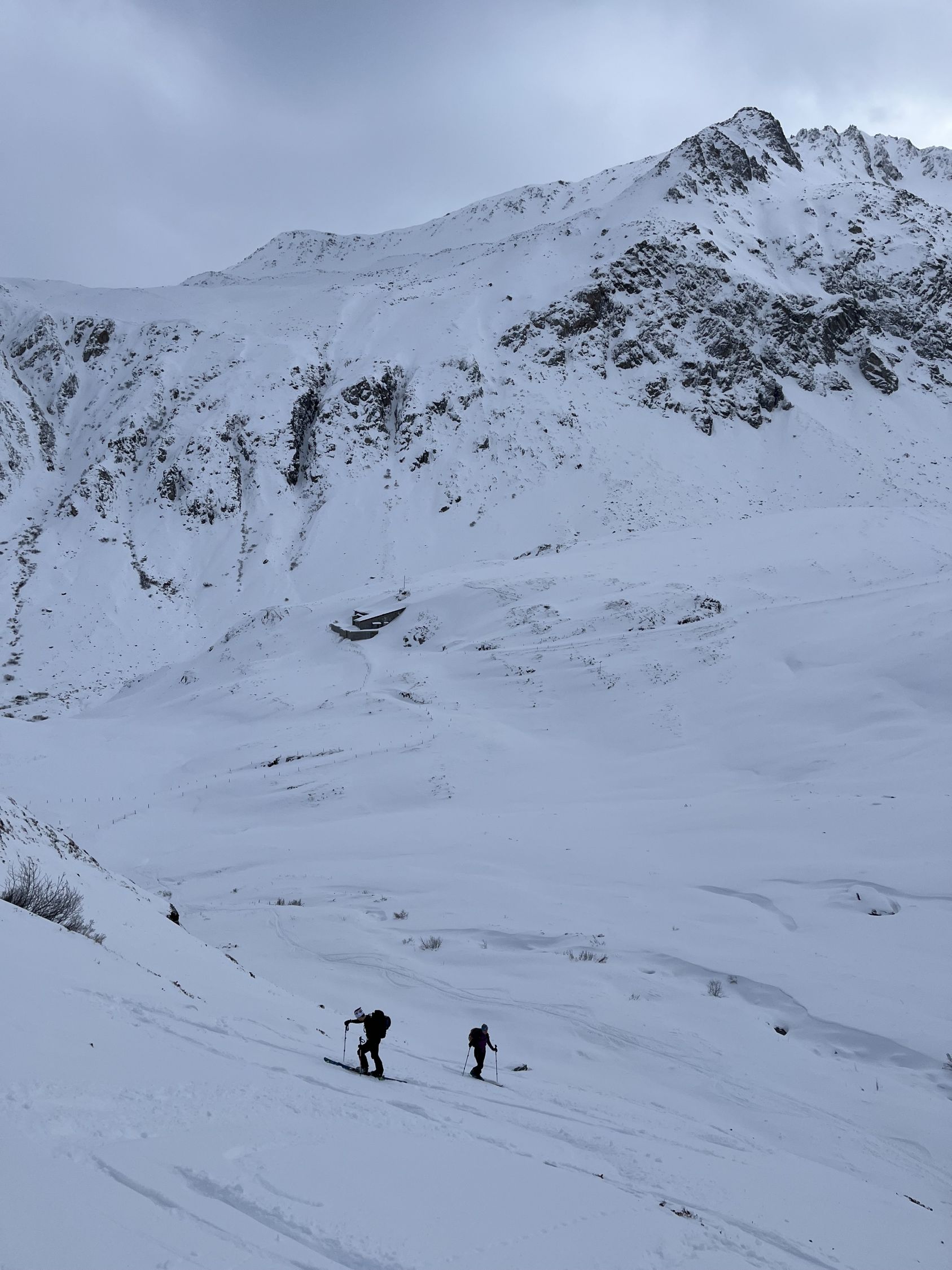 Nach dem leichten Schneefall der Nacht auf den Samstag lag überall eine feine Pulverschicht von 5-10 cm, die stellenweise etwas dicker wurde. Das machte die Abfahrt sehr angenehm und erlaubte uns ein paar eigene Linien zu ziehen. Generell waren wir überrascht, dass es auf der ganzen Route genug guten Schnee gab. Trotzdem muss man bei der Abfahrt vom Tälligrat Richtung Stelliboden auf Steine aufpassen.